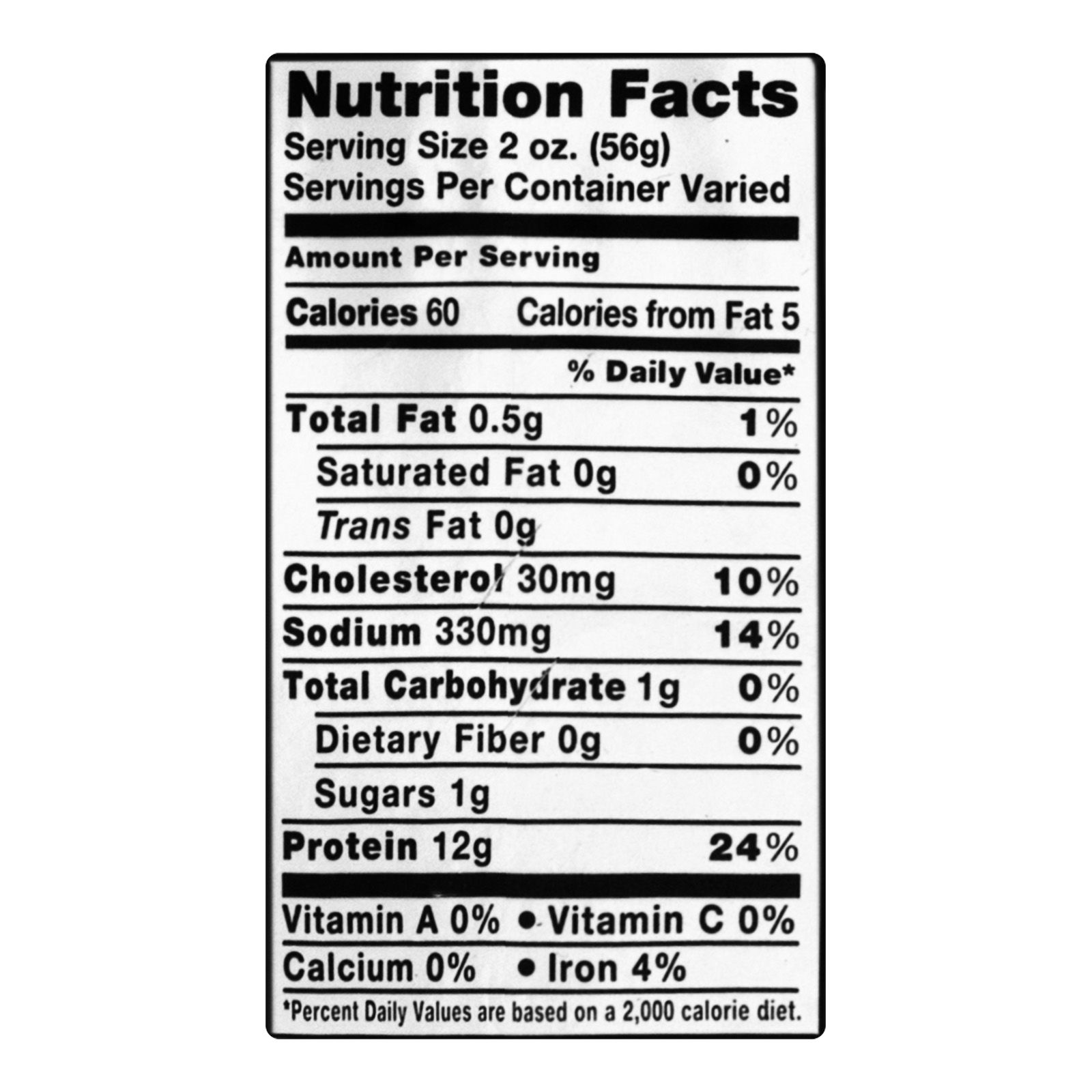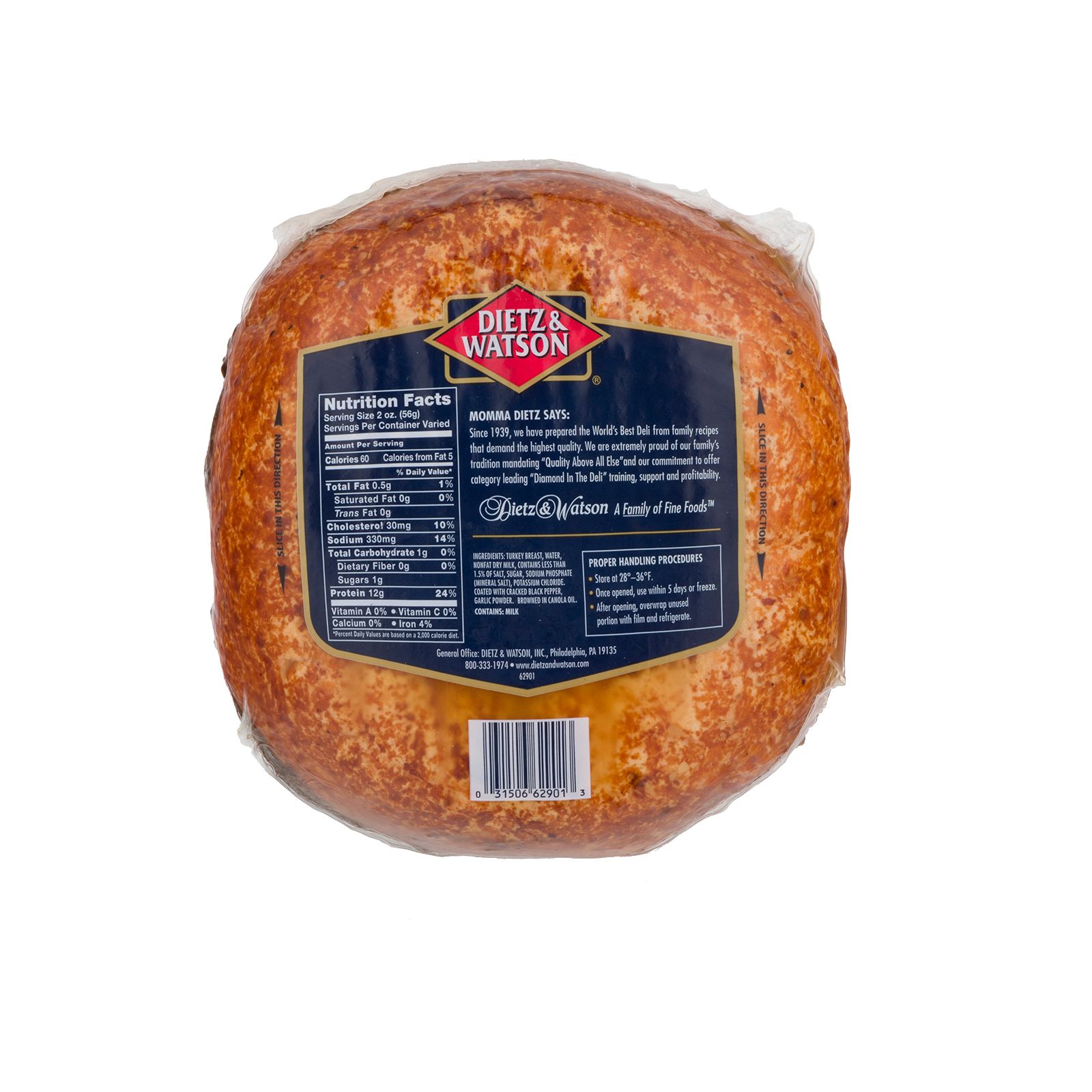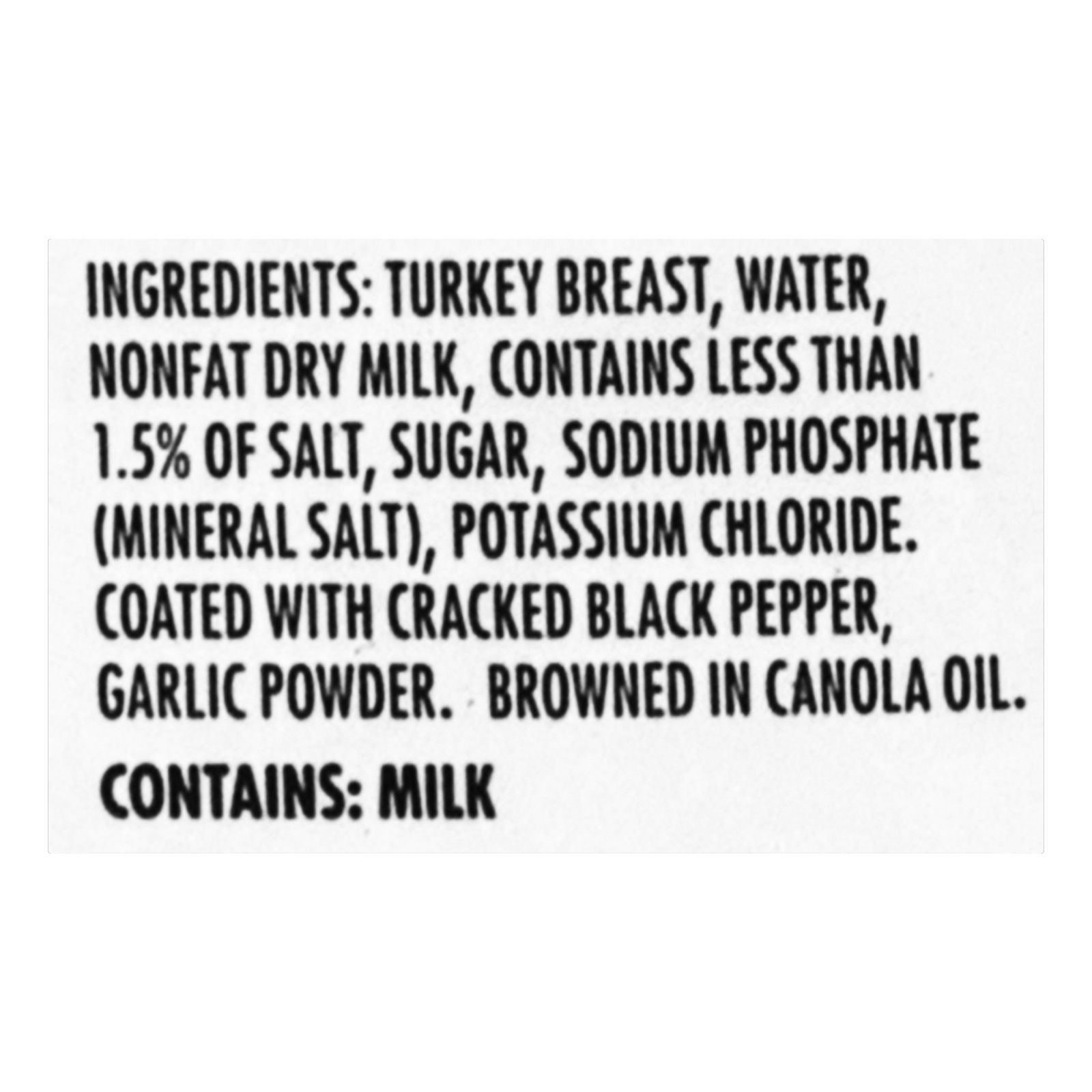 Ingredients: Turkey Breast, Water, Nonfat Dry Milk, Contains Less than 1:5% of Salt, Sugar, Sodium Phosphate, Potassium Chloride, Coated with Cracked Black Pepper, Garlic Powder, Browned in Canola Oil.