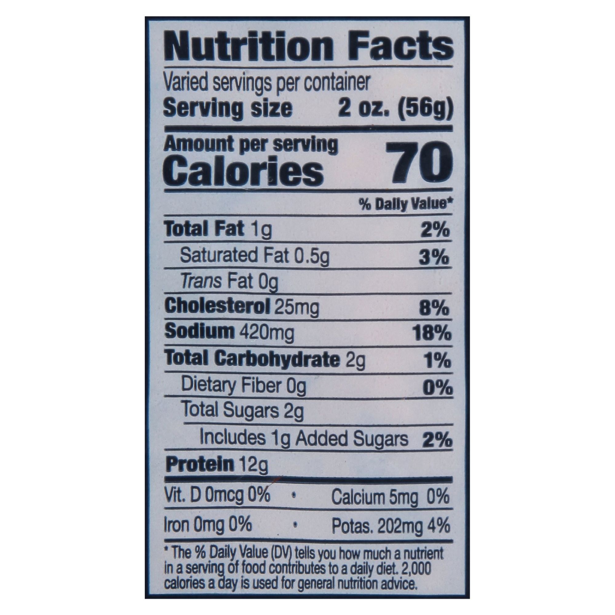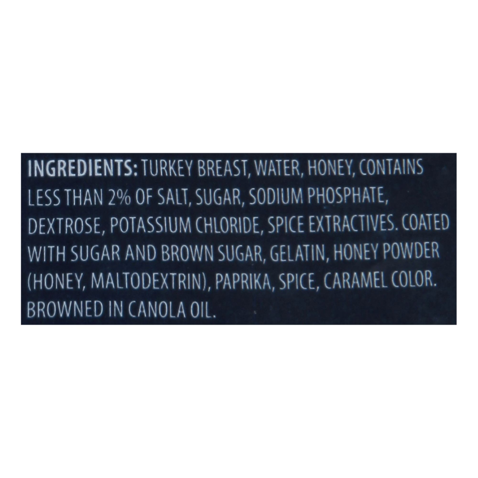 Ingredients: Turkey Breast, Water, Honey, Contains Less than 2% of Salt, Sugar, Sodium Phosphate, Dextrose, Potassium Chloride, Spice Extractives, Coated with Sugar and Brown Sugar, Gelatin, Honey Powder (Honey, Maltodextrin), Paprika, Spice, Caramel Color, Browned in Canola Oil.