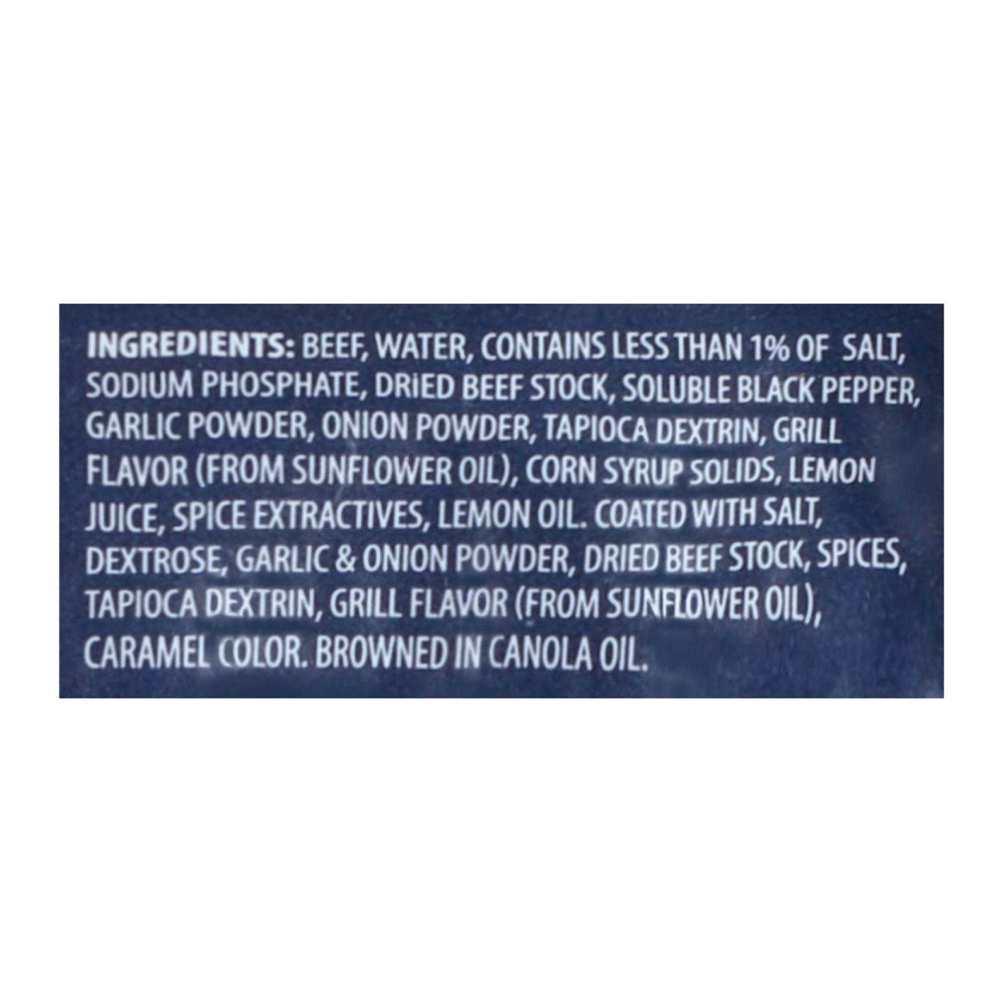 Ingredients: Beef, Water, Contains Less than 1% of Salt, Sodium Phosphate, Dried Beef Stock, Soluble Black Pepper, Garlic Powder, Onion Powder, Tapioca Dextrin, Grill Flavor (from Sunflower Oil), Corn Syrup Solids, Lemon Juice, Spice Extractives, Lemon Oil, Coated with Salt, Dextrose, Garlic & Onion Powder, Dried Beef Stock, Spices, Tapioca Dextrin, Grill Flavor (from Sunflower Oil), Caramel Color, Browned in Canola Oil.