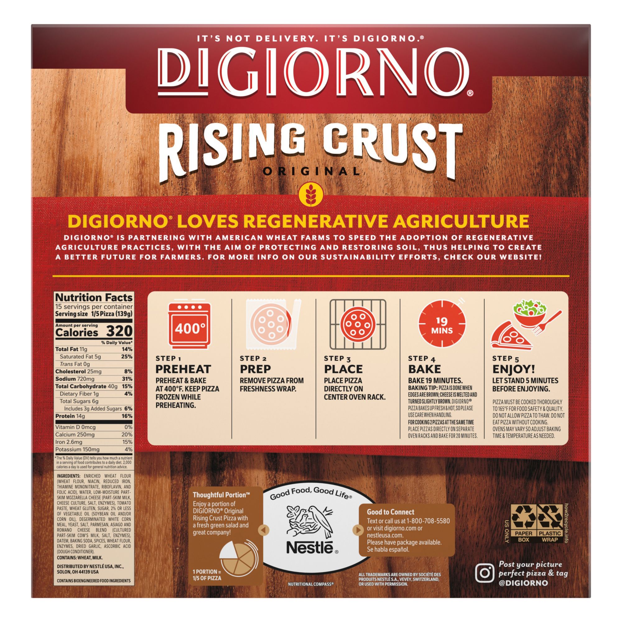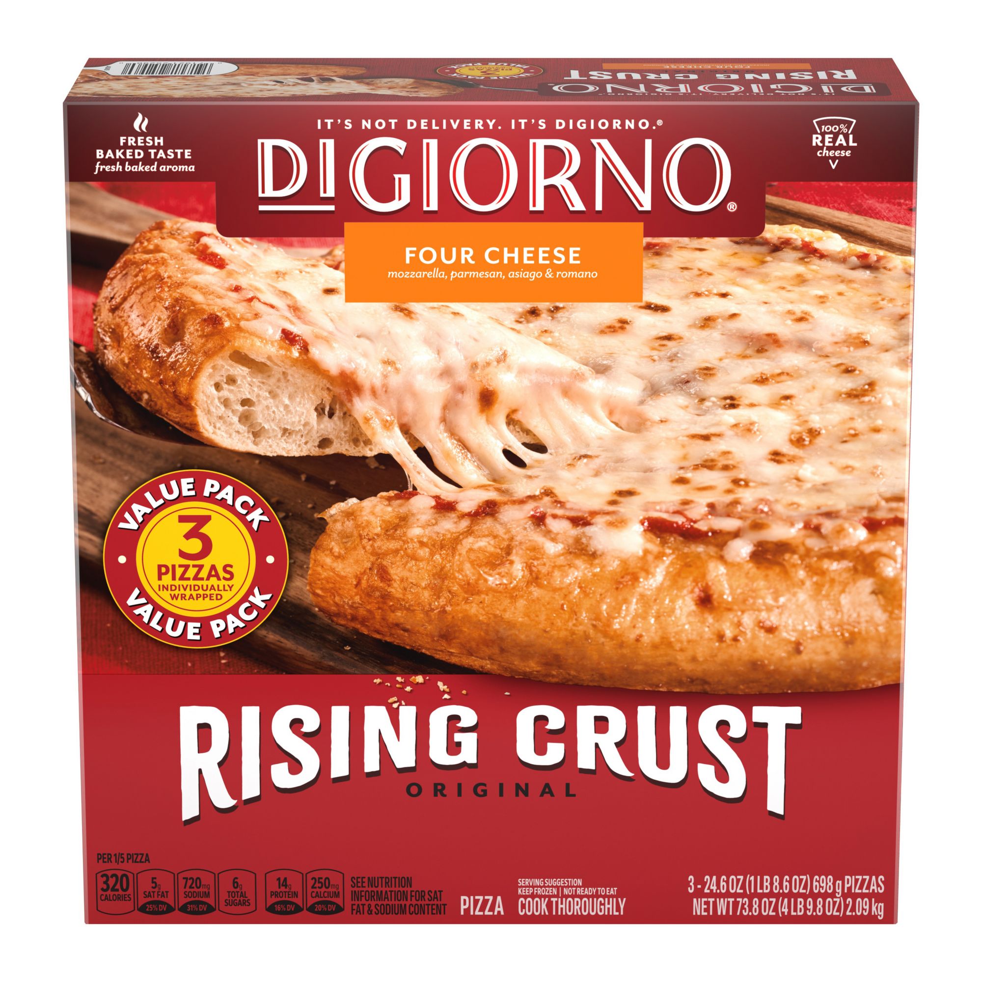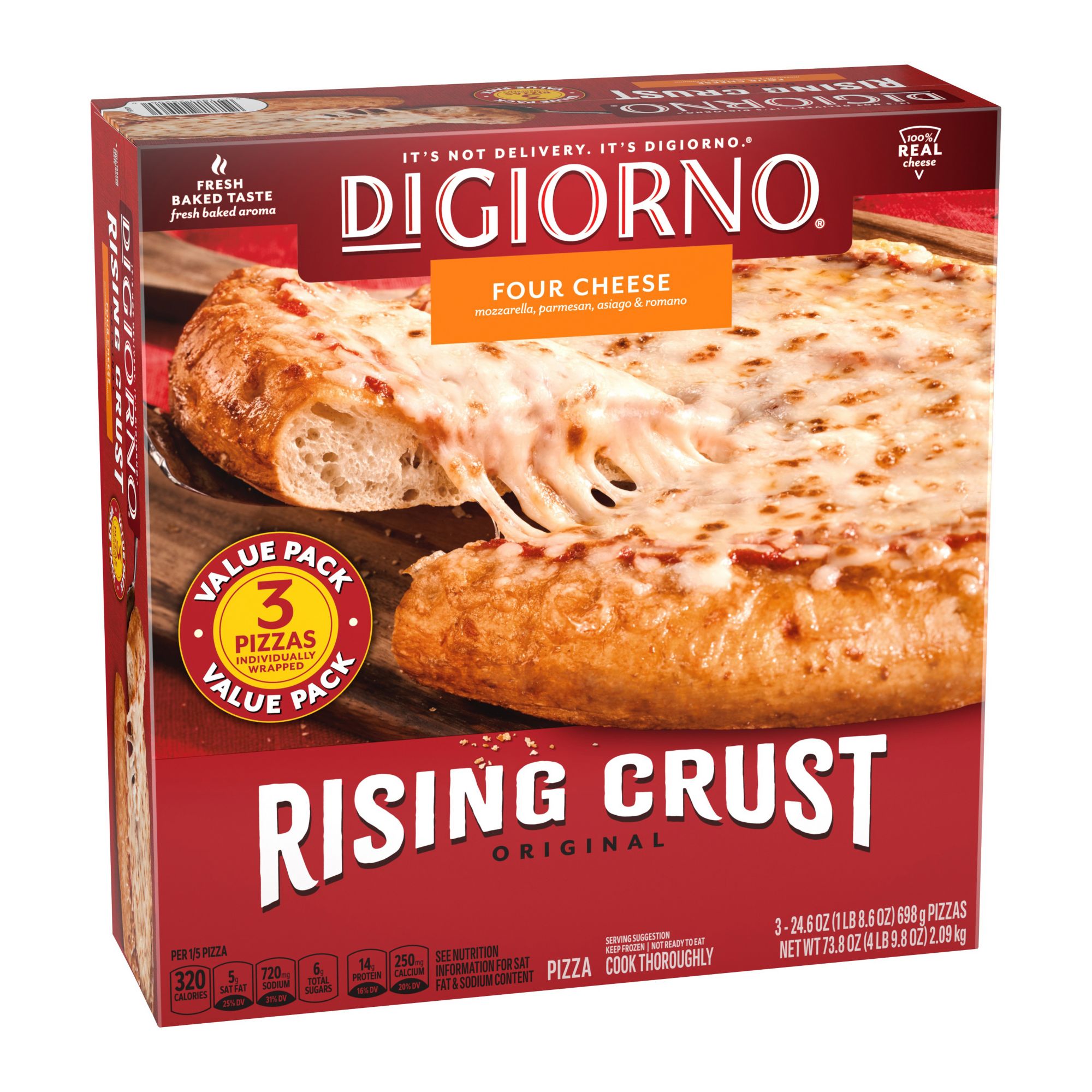 Enjoy the fresh baked taste and aroma of delivery from your own oven with a DiGiorno Four Cheese Frozen Pizza on a Rising Crust. These rising crust cheese pizzas are topped with mozzarella, Parmesan, Asiago and Romano cheeses and DiGiorno signature tomato sauce. The tasty rising pizza crust bakes up crispy on the outside but soft and tender on the inside. DiGiorno frozen cheese pizza delivers an easy dinner or a delicious quick lunch. These cook and serve frozen DiGiorno pizzas are made with 100% real cheese for a taste that rivals delivery. Step up your family dinner with a DiGiorno frozen pizza on busy weeknights and serve with a salad for an easy meal. Keep DiGiorno rising crust pizza frozen until you're ready to enjoy. It's DiGiorno.
