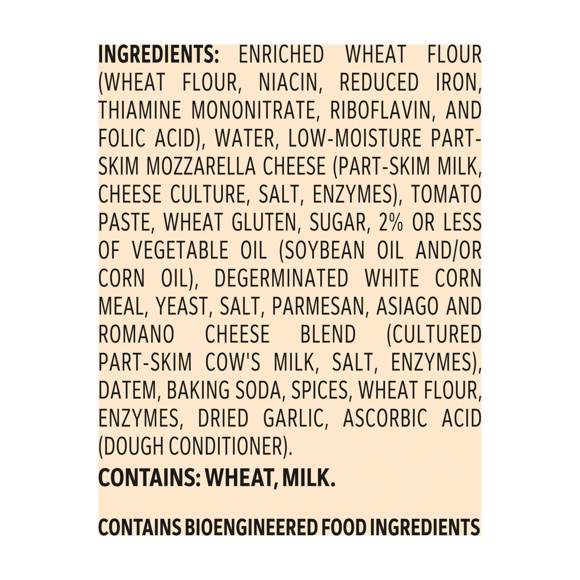 Ingredients Enriched Wheat Flour (Wheat Flour, Niacin, Reduced Iron, Thiamine Mononitrate, Riboflavin, And Folic Acid), Water, Low-moisture Part-skim Mozzarella Cheese (Part-skim Milk, Cheese Culture, Salt, Enzymes), Tomato Paste, Wheat Gluten, Sugar, 2% Or Less Of Vegetable Oil (Corn Oil And/or Soybean Oil), Degerminated White Corn Meal, Yeast, Salt, Parmesan, Asiago And Romano Cheese Blend (Cultured Part-skim Cow's Milk, Salt, Enzymes), Datem, Baking Soda, Spices, Wheat Flour, Enzymes, Dried Garlic, Ascorbic Acid (Dough Conditioner).
