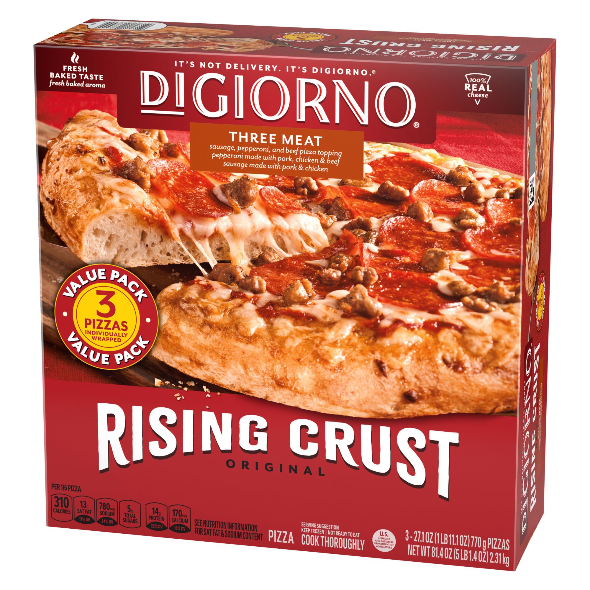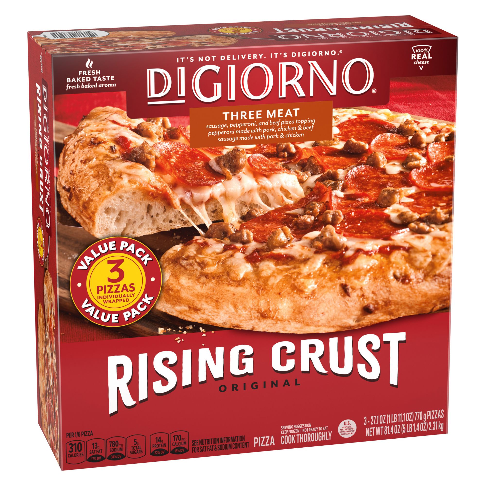 Enjoy the fresh baked taste and aroma of delivery from your own oven with DiGiorno Three Meat Frozen Pizza on a Rising Crust. This three meat pizza is topped with sausage, pepperoni, beef pizza topping, mozzarella cheese and DiGiorno signature tomato sauce. The tasty rising pizza crust bakes up crispy on the outside but soft and tender on the inside. DiGiorno frozen pizza delivers an easy dinner or a delicious quick lunch. This cook and serve frozen DiGiorno pizza is made with 100% real cheese for a frozen pizza with a taste that rivals delivery. Step up your family dinner with one of these DiGiorno frozen pizzas on busy weeknights and serve with a salad for an easy meal. This three-pack of frozen three meat pizzas is also perfect for a pizza party with family and friends. Each meat pizza in this value pack is individually wrapped, so you can keep your freezer stocked with delicious delivery quality pizza for any occasion. Store these DiGiorno three meat pizzas frozen until you're ready to enjoy. It's not delivery. It's DiGiorno.