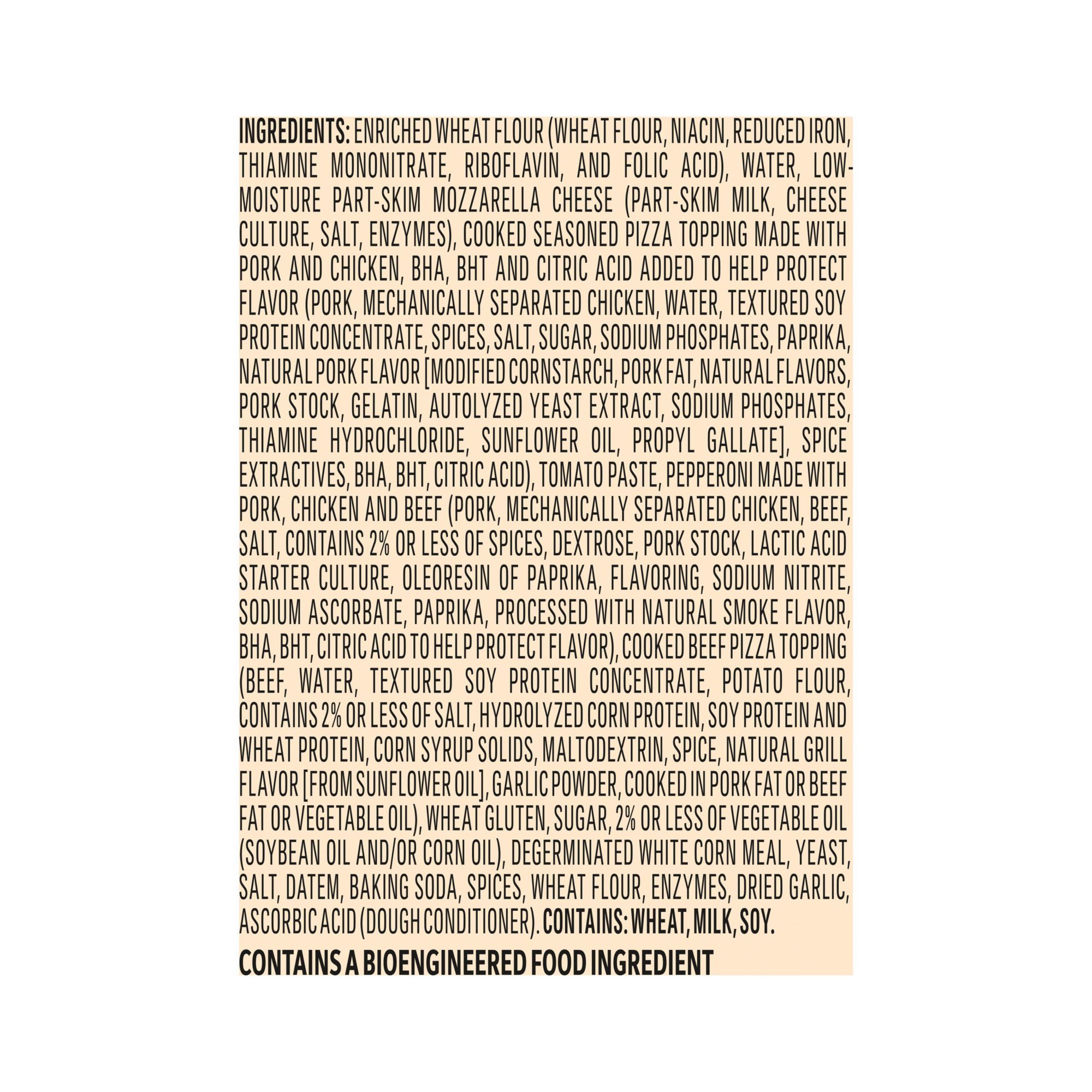Ingredients Enriched Wheat Flour (Wheat Flour, Niacin, Reduced Iron, Thiamine Mononitrate, Riboflavin, and Folic Acid), Water, Low-Moisture Part-Skim Mozzarella Cheese (Part-Skim Milk, Cheese Culture, Salt, Enzymes), Tomato Paste, Cooked Seasoned Pizza Topping Made with Pork and Chicken (Pork, Mechanically Separated Chicken, Water, Textured Soy Protein Concentrate, Spices, Salt, Sugar, Sodium Phosphates, Paprika, Natural Pork Flavor [Modified Cornstarch, Pork Fat, Natural Flavors, Pork Stock, Gelatin, Autolyzed Yeast Extract, Sodium Phosphates, Thiamine Hydrochloride, Sunflower Oil, Propyl Gallate], Spice Extractives, BHA, BHT, Citric Acid), Pepperoni Made with Pork, Chicken, and Beef (Pork, Mechanically Separated Chicken, Beef, Salt, Contains 2% or Less of Spices, Dextrose, Pork Stock, Lactic Acid Starter Culture, Oleoresin of Paprika, Flavoring, Sodium Nitrite, Sodium Ascorbate, Paprika, Processed with Natural Smoke Flavor, BHA, BHT, Citric Acid to Help Protect Flavor), Cooked Beef Pizza Topping (Beef, Water, Textured Soy Protein Concentrate, Potato Flour, Contains 2% or Less of Salt, Hydrolyzed Corn Protein, Soy Protein and Wheat Protein, Corn Syrup Solids, Maltodextrin, Spice, Natural Grill Flavor [from Sunflower Oil], Garlic Powder, Cooked in Pork Fat or Beef Fat or Vegetable Oil), Wheat Gluten, Sugar, Vegetable Oil (Corn Oil and/or Soybean Oil and/or Canola Oil), Degerminated White Corn Meal, Yeast, Salt, Datem, Baking Soda, Spices, Wheat Flour, Enzymes, Dried Garlic, Ascorbic Acid (Dough Conditioner).