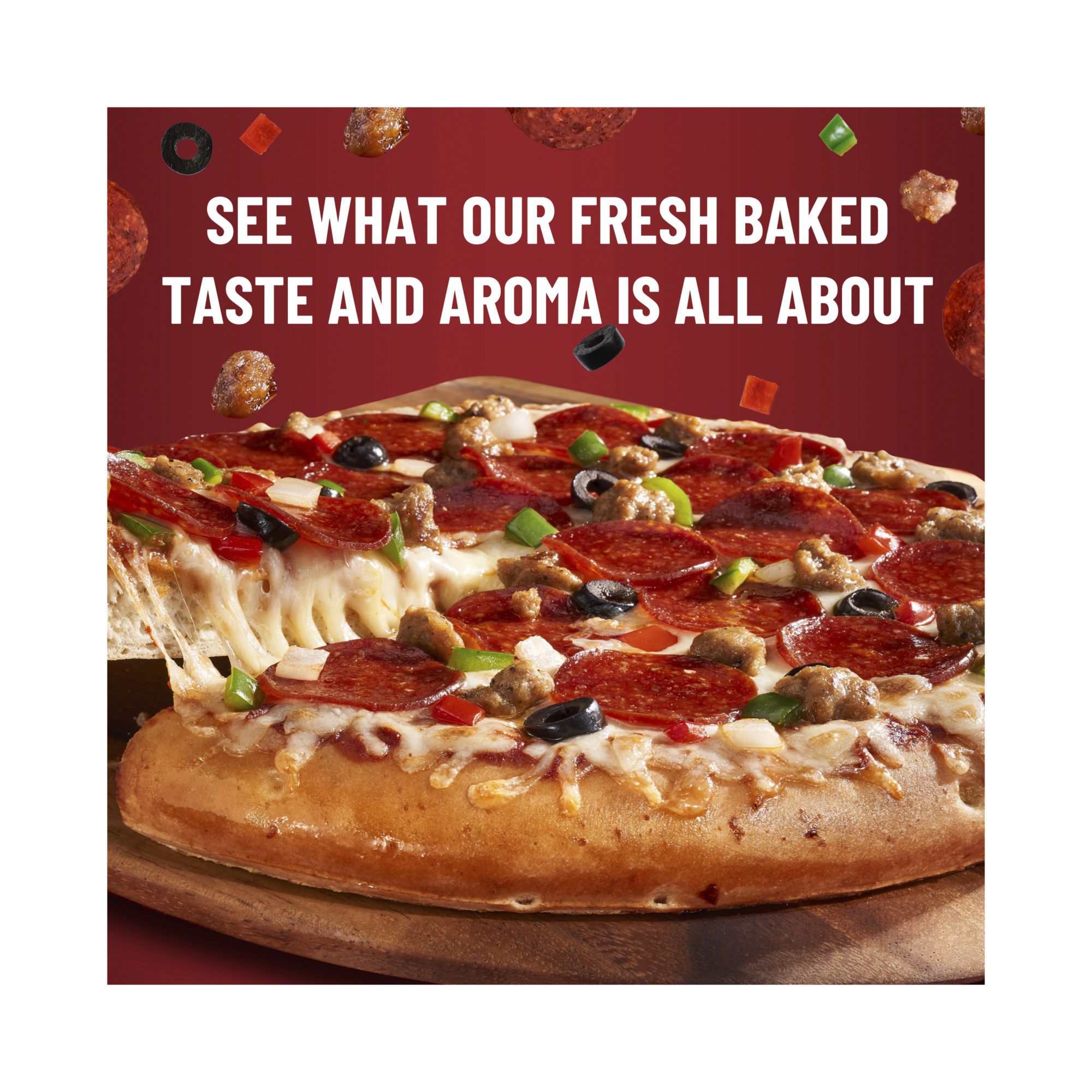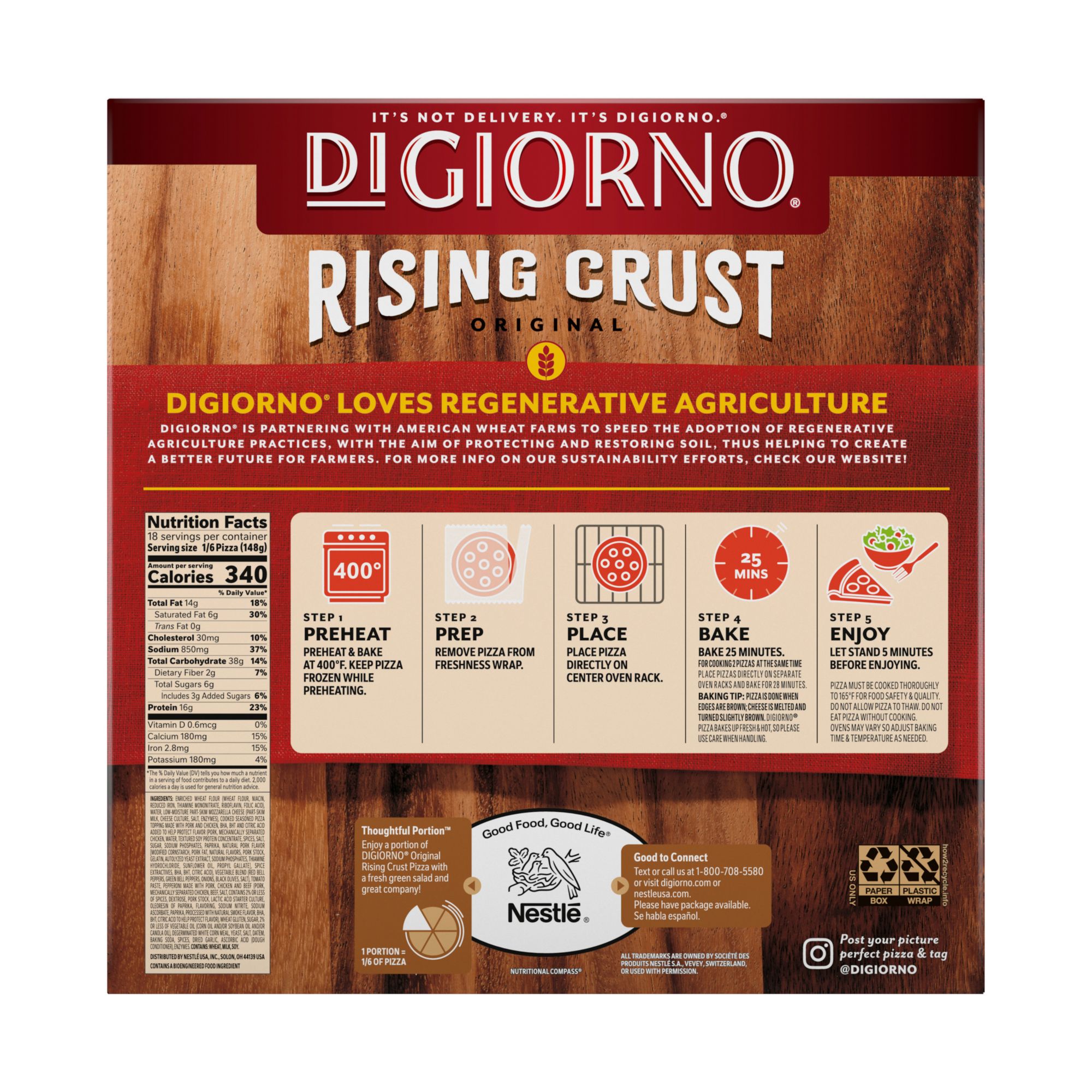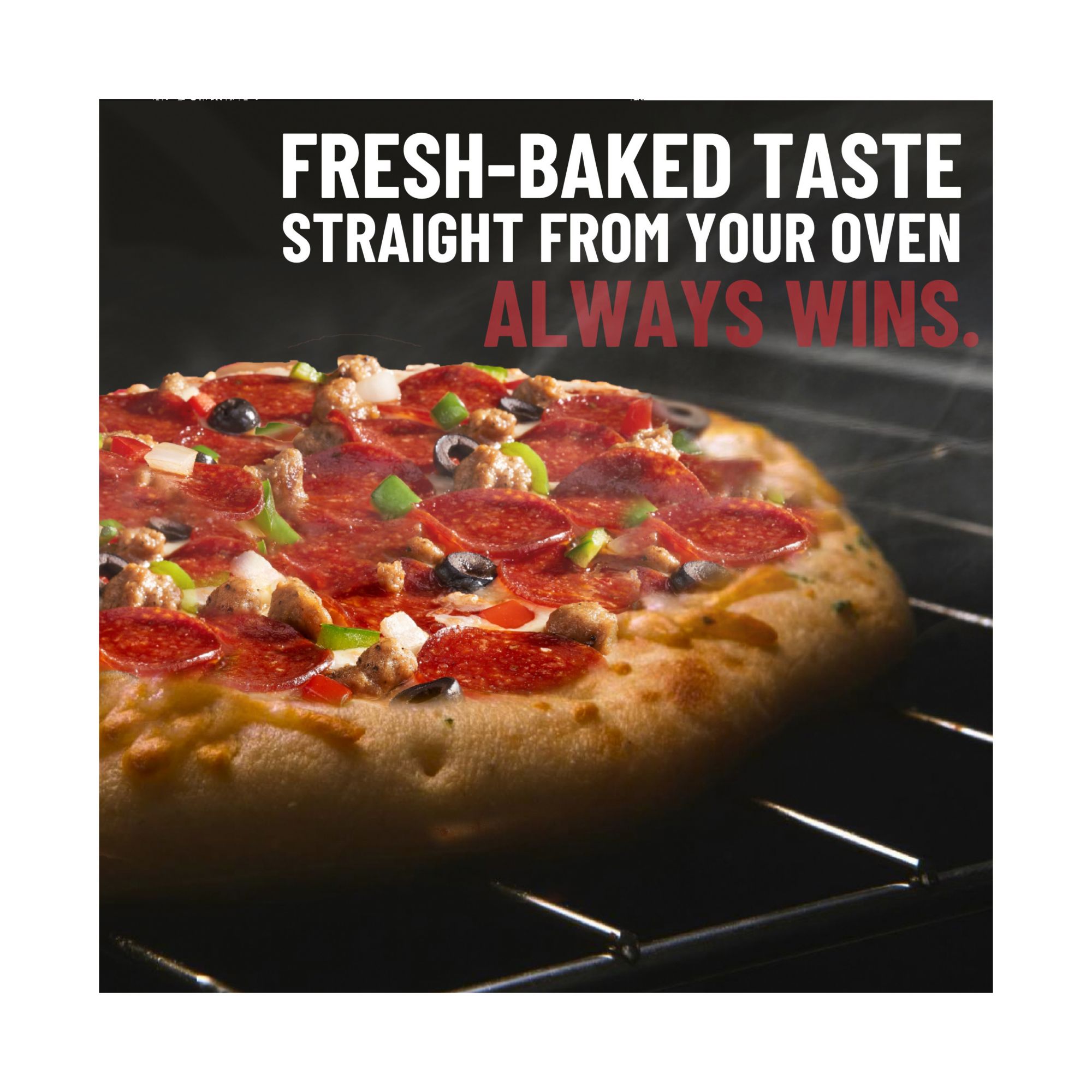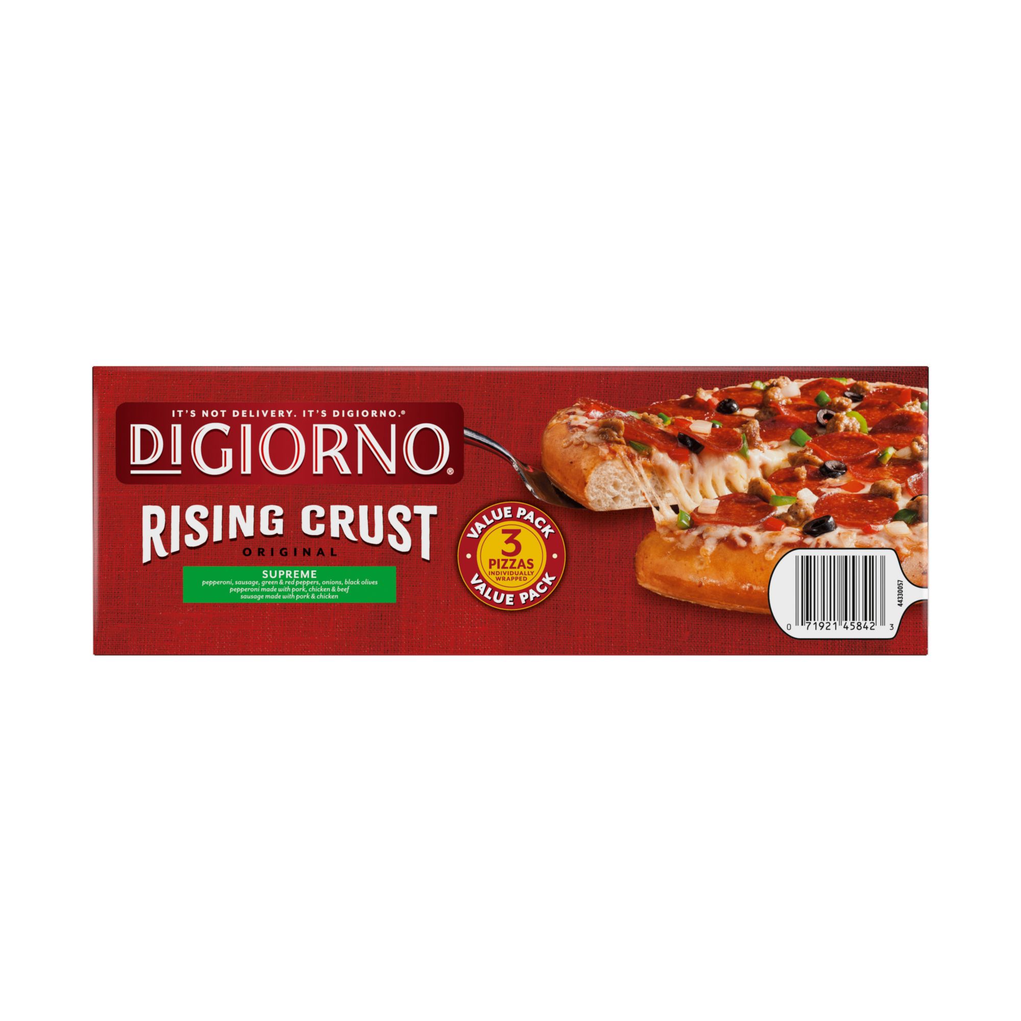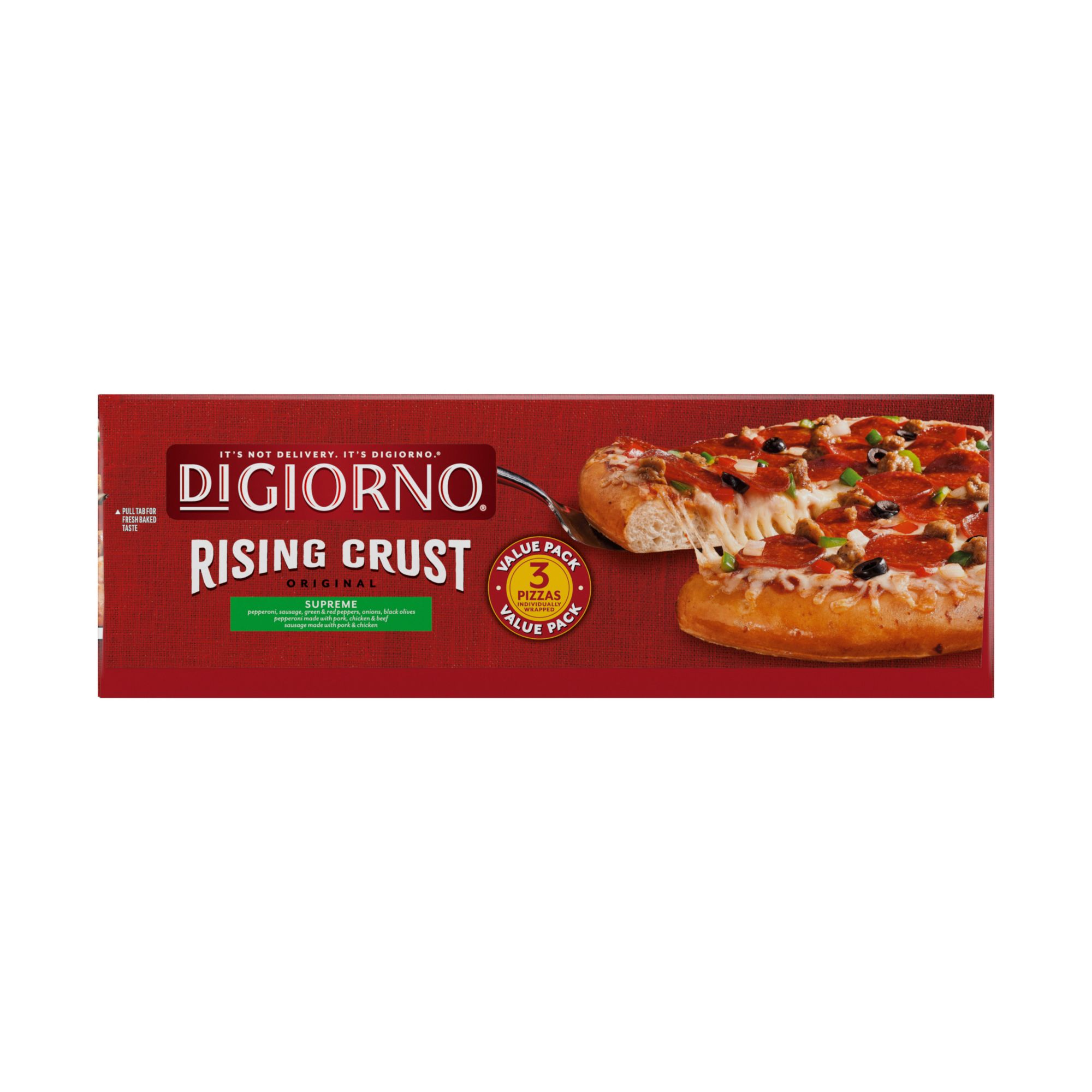 Enjoy the fresh baked taste and aroma of delivery from your own oven with a DiGiorno Supreme Frozen Pizza on a Rising Crust. This supreme pizza is topped with pepperoni, sausage, green and red peppers, onions, black olives, mozzarella cheese and DiGiorno signature tomato sauce. The tasty rising pizza crust bakes up crispy on the outside but soft and tender on the inside. DiGiorno frozen pizza delivers an easy dinner or a delicious quick lunch. This cook and serve frozen DiGiorno pizza is made with 100% real cheese for a frozen pizza with a taste that rivals delivery. Step up your family dinner with one of these DiGiorno frozen pizzas on busy weeknights and serve with a salad for an easy meal. This three-pack of frozen supreme pizza is also perfect for a pizza party with family and friends. Each supreme pizza in this value pack is individually wrapped, so you can keep your freezer stocked with delicious delivery quality pizza for any occasion. Store these DiGiorno supreme pizzas frozen until you're ready to enjoy. For more tasty rising crust pizza delivered straight from your oven, try other DiGiorno Three Meat, Pepperoni and Four Cheese rising crust frozen pizza club pack varieties. It's not delivery. It's DiGiorno.
