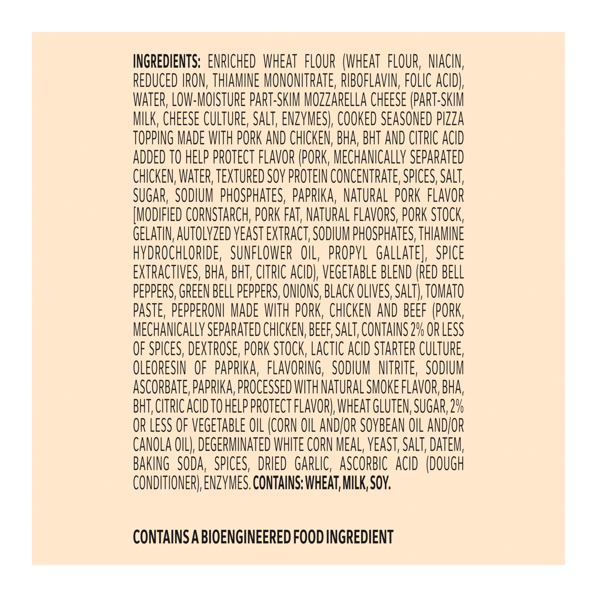 Ingredients: Enriched Wheat Flour (Wheat Flour, Niacin, Reduced Iron, Thiamine Mononitrate, Riboflavin, Folic Acid), Water, Low-moisture Part-skim Mozzarella Cheese (Part-skim Milk, Cheese Culture, Salt, Enzymes), Cooked Seasoned Pizza Topping Made With Pork And Chicken, Bha, Bht And Citric Acid Added To Help Protect Flavor (Pork, Mechanically Separated Chicken, Water, Textured Soy Protein Concentrate, Spices, Salt, Sugar, Sodium Phosphates, Paprika, Natural Pork Flavor [Modified Cornstarch, Pork Fat, Natural Flavors, Pork Stock, Gelatin, Autolyzed Yeast Extract, Sodium Phosphates, Thiamine Hydrochloride, Sunflower Oil, Propyl Gallate], Spice Extractives, Bha, Bht, Citric Acid), Vegetable Blend (Red Bell Peppers, Green Bell Peppers, Onions, Black Olives, Salt), Tomato Paste, Pepperoni Made With Pork, Chicken And Beef (Pork, Mechanically Separated Chicken, Beef, Salt, Contains 2% Or Less Of Spices, Dextrose, Pork Stock, Lactic Acid Starter Culture, Oleoresin Of Paprika, Flavoring, Sodium Nitrite, Sodium Ascorbate, Paprika, Processed With Natural Smoke Flavor, Bha, Bht, Citric Acid To Help Protect Flavor), Wheat Gluten, Sugar, 2% Or Less Of Vegetable Oil (Corn Oil And/or Soybean Oil And/or Canola Oil), Degerminated White Corn Meal, Yeast, Salt, Datem, Baking Soda, Spices, Dried Garlic, Ascorbic Acid (Dough Conditioner), Enzymes.
