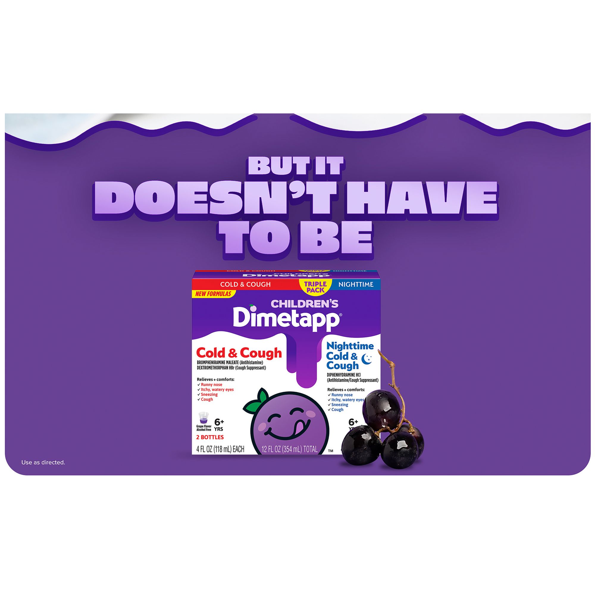 Kid-friendly formulas: Children’s Dimetapp kid-friendly formulas are designed to target specific symptoms so your child gets the medicine they need and nothing they don’t to help them feel better, fast