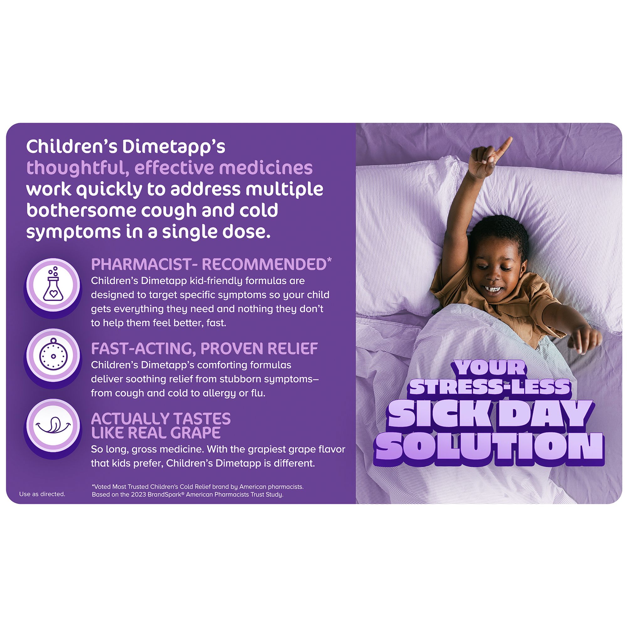 *Voted Most Trusted Children's Cold Relief brand by American pharmacists. Based on the 2024 BrandSpark American Pharmacists Trust Study. Use as directed.