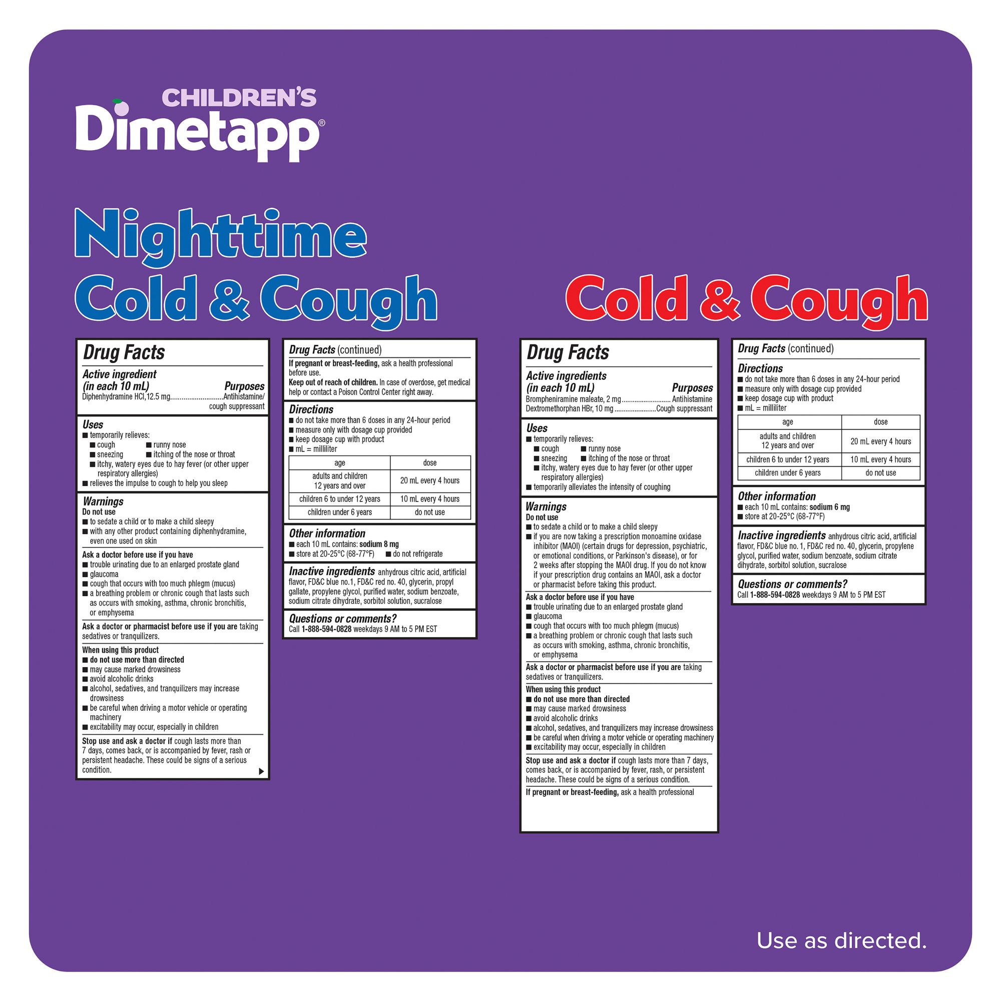 Product Warnings and Restrictions: In Each 10 mL Warnings: Do not use: to sedate a child or to make a child sleepy; if you are now taking a prescription monoamine oxidase inhibitor (MAOI) (certain drugs for depression, psychiatric, or emotional conditions, or Parkinson's disease), or for 2 weeks after stopping the MAOI drug. If you do not know if your prescription drug contains an MAOI, ask a doctor or pharmacist before taking this product.; with any other product containing diphenhydramine, even one used on skin. Ask a doctor before use if you have: heart disease; high blood pressure; thyroid disease; diabetes; trouble urinating due to an enlarged prostate gland; glaucoma; cough that occurs with too much phlegm (mucus); a breathing problem or chronic cough that lasts such as occurs with smoking, asthma, chronic bronchitis, or emphysema. Ask a doctor or pharmacist before use if you are: taking any other oral nasal decongestant or stimulant; taking sedatives or tranquilizers. When using this product: do not use more than directed; may cause marked drowsiness; avoid alcoholic drinks; alcohol, sedatives, and tranquilizers may increase drowsiness; be careful when driving a motor vehicle or operating machinery; excitability may occur, especially in children. Stop use and ask a doctor if: nervousness, dizziness or sleeplessness occurs; symptoms do not get better within 7 days or are accompanied by fever; cough lasts more than 7 days, comes back, or is accompanied by fever, rash or persistent headache. These could be signs of a serious condition. If pregnant or breast-feeding, ask a health professional before use. Keep out of reach of children. In case of overdose, get medical help or contact a Poison Control Center right away. Do not take Dimetapp Cold & Cough and Dimetapp Nighttime Cold & Congestion at the same time. Always wait at least 4 hours before taking another dose of Dimetapp Liquid. Tamper Evident: do not use if neckband printed with "sealed for your protection" is torn or missing. In Each 10 mL Warnings: Do not use: to sedate a child or to make a child sleepy; if you are now taking a prescription monoamine oxidase inhibitor (MAOI) (certain drugs for depression, psychiatric, or emotional conditions, or Parkinson's disease), or for 2 weeks after stopping the MAOI drug. If you do not know if your prescription drug contains an MAOI, ask a doctor or pharmacist before taking this product. Ask a doctor before use if you have: heart disease; high blood pressure; thyroid disease; diabetes; trouble urinating due to an enlarged prostate gland; glaucoma; cough that occurs with too much phlegm (mucus); a breathing problem or chronic cough that lasts such as occurs with smoking, asthma, chronic bronchitis, or emphysema. Ask a doctor or pharmacist before use if you are: taking any other oral nasal decongestant or stimulant; taking sedatives or tranquilizers. When using this product: do not use more than directed; may cause marked drowsiness; avoid alcoholic beverages; alcohol, sedatives, and tranquilizers may increase drowsiness; be careful when driving a motor vehicle or operating machinery; excitability may occur, especially in children. Stop use and ask a doctor if: nervousness, dizziness or sleeplessness occurs; symptoms do not get better within 7 days or are accompanied by fever; cough lasts more than 7 days, comes back, or is accompanied by fever, rash, or persistent headache. These could be signs of a serious condition. If pregnant or breast-feeding, ask a health professional before use. Keep out of reach of children. In case of overdose, get medical help or contact a Poison Control Center right away. Do not take Dimetapp Cold & Cough and Dimetapp Nighttime Cold & Congestion at the same time. Always wait at least 4 hours before taking another dose of Dimetapp Liquid. Tamper Evident: do not use if neckband printed with "sealed for your protection" is torn or missing.