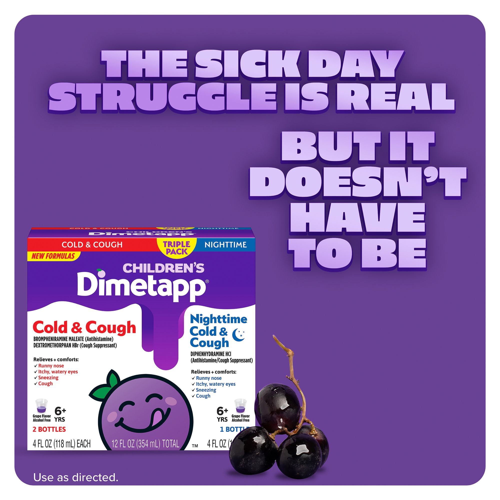 Alcohol-free, great grape taste: Dimetapp’s sweet grape flavor is alcohol-free and yuck-free (so this helps kids take their medicine)