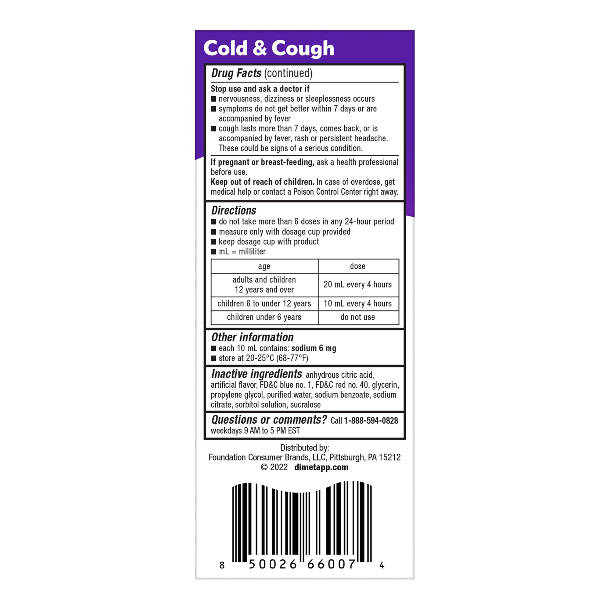 Product Warnings and Restrictions: In Each 10 mL Warnings: Do not use: to sedate a child or to make a child sleepy; if you are now taking a prescription monoamine oxidase inhibitor (MAOI) (certain drugs for depression, psychiatric, or emotional conditions, or Parkinson's disease), or for 2 weeks after stopping the MAOI drug. If you do not know if your prescription drug contains an MAOI, ask a doctor or pharmacist before taking this product.; with any other product containing diphenhydramine, even one used on skin. Ask a doctor before use if you have: heart disease; high blood pressure; thyroid disease; diabetes; trouble urinating due to an enlarged prostate gland; glaucoma; cough that occurs with too much phlegm (mucus); a breathing problem or chronic cough that lasts such as occurs with smoking, asthma, chronic bronchitis, or emphysema. Ask a doctor or pharmacist before use if you are: taking any other oral nasal decongestant or stimulant; taking sedatives or tranquilizers. When using this product: do not use more than directed; may cause marked drowsiness; avoid alcoholic drinks; alcohol, sedatives, and tranquilizers may increase drowsiness; be careful when driving a motor vehicle or operating machinery; excitability may occur, especially in children. Stop use and ask a doctor if: nervousness, dizziness or sleeplessness occurs; symptoms do not get better within 7 days or are accompanied by fever; cough lasts more than 7 days, comes back, or is accompanied by fever, rash or persistent headache. These could be signs of a serious condition. If pregnant or breast-feeding, ask a health professional before use. Keep out of reach of children. In case of overdose, get medical help or contact a Poison Control Center right away. Do not take Dimetapp Cold & Cough and Dimetapp Nighttime Cold & Congestion at the same time. Always wait at least 4 hours before taking another dose of Dimetapp Liquid. Tamper Evident: do not use if neckband printed with "sealed for your protection" is torn or missing. In Each 10 mL Warnings: Do not use: to sedate a child or to make a child sleepy; if you are now taking a prescription monoamine oxidase inhibitor (MAOI) (certain drugs for depression, psychiatric, or emotional conditions, or Parkinson's disease), or for 2 weeks after stopping the MAOI drug. If you do not know if your prescription drug contains an MAOI, ask a doctor or pharmacist before taking this product. Ask a doctor before use if you have: heart disease; high blood pressure; thyroid disease; diabetes; trouble urinating due to an enlarged prostate gland; glaucoma; cough that occurs with too much phlegm (mucus); a breathing problem or chronic cough that lasts such as occurs with smoking, asthma, chronic bronchitis, or emphysema. Ask a doctor or pharmacist before use if you are: taking any other oral nasal decongestant or stimulant; taking sedatives or tranquilizers. When using this product: do not use more than directed; may cause marked drowsiness; avoid alcoholic beverages; alcohol, sedatives, and tranquilizers may increase drowsiness; be careful when driving a motor vehicle or operating machinery; excitability may occur, especially in children. Stop use and ask a doctor if: nervousness, dizziness or sleeplessness occurs; symptoms do not get better within 7 days or are accompanied by fever; cough lasts more than 7 days, comes back, or is accompanied by fever, rash, or persistent headache. These could be signs of a serious condition. If pregnant or breast-feeding, ask a health professional before use. Keep out of reach of children. In case of overdose, get medical help or contact a Poison Control Center right away. Do not take Dimetapp Cold & Cough and Dimetapp Nighttime Cold & Congestion at the same time. Always wait at least 4 hours before taking another dose of Dimetapp Liquid. Tamper Evident: do not use if neckband printed with "sealed for your protection" is torn or missing.