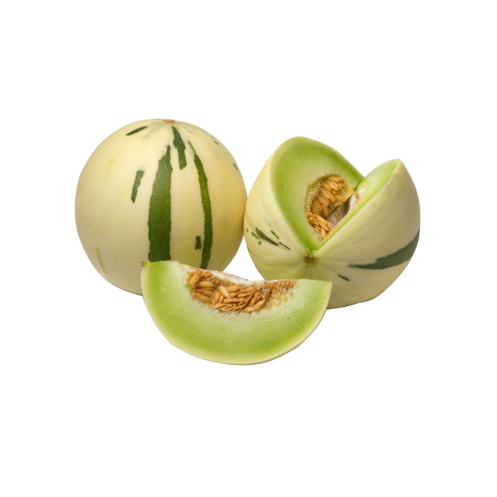 Identical in shape and size to a honeydew melon, the exterior of a Dino Melon consists of colored markings which is the signature identity of this melon. Once cut the internal quality consistently provides higher brix levels and has an excellent flavor profile.