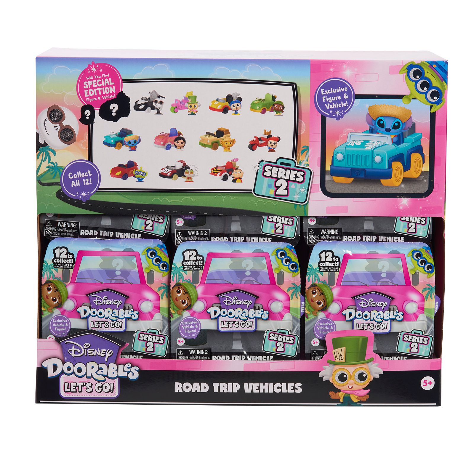 Honk and get ready to go on an exciting travel adventure with Disney Doorables Let’s Go Road Trip Vehicles Each vehicle represents an exciting day out – including Jack Skellington’s spooky trip through Halloweentown, a beach day with Stitch, Mickey Mouse’s day at the races, and more Each Disney toy figurine stands approximately 1.5" tall and features signature Doorables stylized detailing and sparkly glitter eyes Characters and vehicles are wonderful to share, trade, and create vehicle-themed displays – like zoom-filled races, creative obstacle courses, or mix-and-match road trips Add other Disney Doorables figures, playsets, and collectible peeks to share, trade, and display Disney Doorables make wonderful stocking stuffers, holiday, or anytime gifts for fans of Disney toys, collectors, boys and girls 5 years and up Includes 3 Disney Doorables figures and 3 vehicles