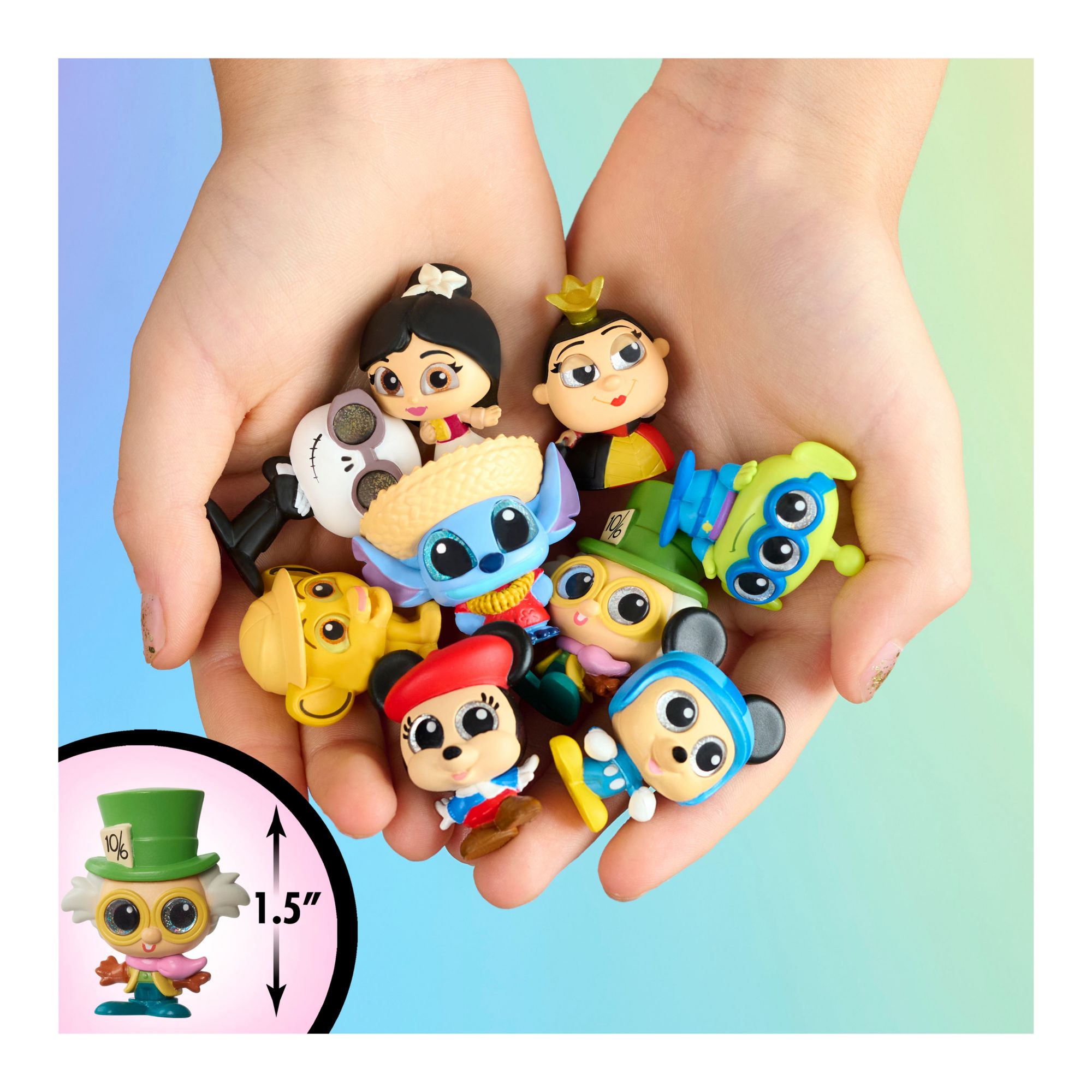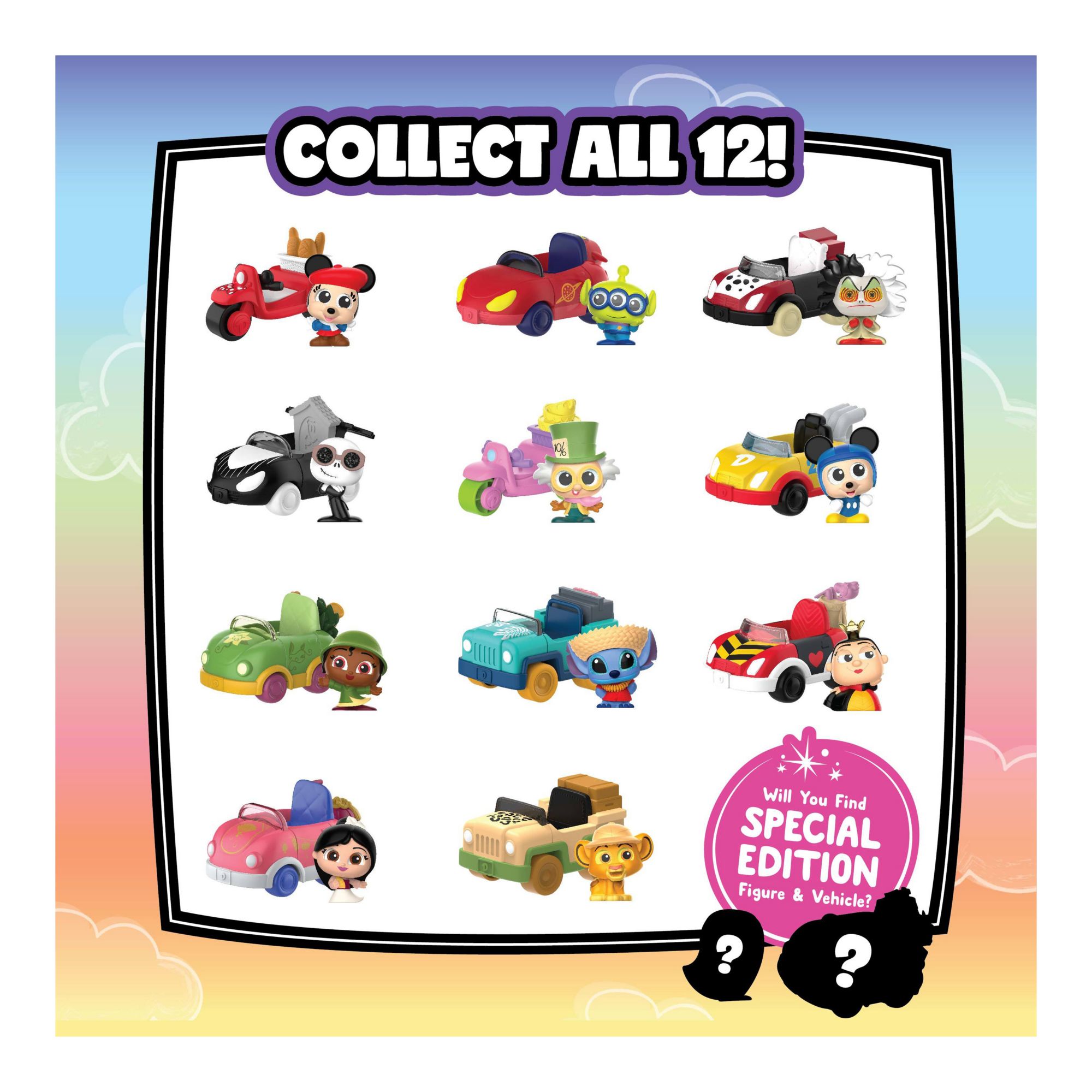 Honk and get ready to go, because a double surprise is in store with Disney Doorables Let’s Go Road Trip Vehicles. Peel to reveal 2 of 12 different figures that really roll – all on their way to fantastic destinations. A day on the croquet court with the Queen of Hearts, a safari with Simba or even a motor race with Mickey Mouse. Each character stands approximately 1.5" tall and features stylized detailing with sparkly glitter eyes. The toy cars range from a colorful collection of buggies, three-wheelers, sports cars, and even Minnie Mouse’s Persian-inspired car. Imagine the fun of creating displays featuring silly obstacle courses or mix-and-match road trips – all with a mystery vehicle and driver.