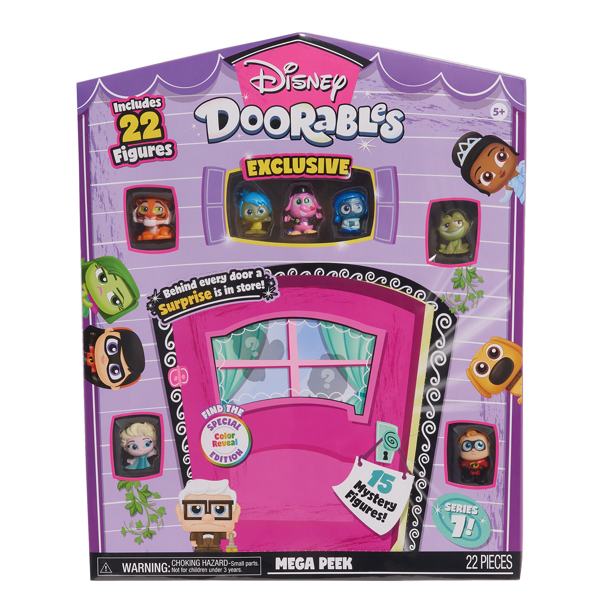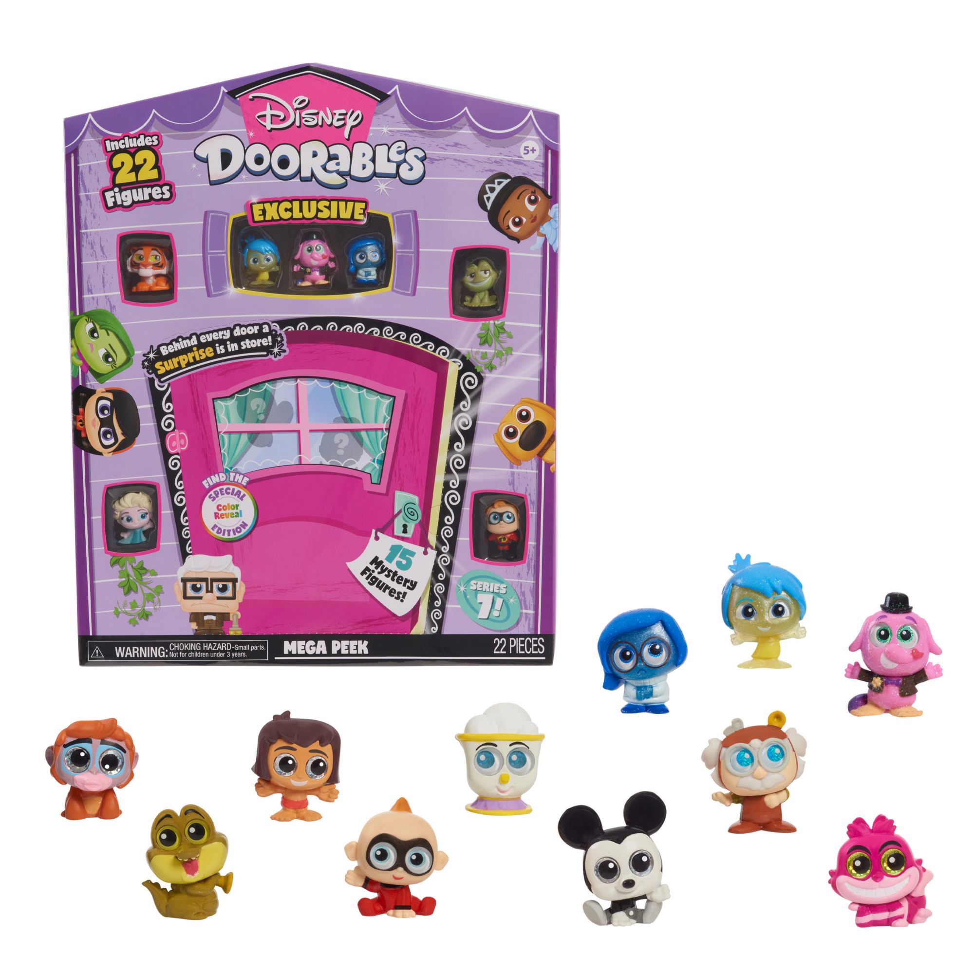 Behind every door, a bigger surprise is in store with the Disney Doorables Mega Peek – Series 7 collectible figures. Unbox 22 figures, including 15 mystery figures, and three exclusive figures with special finishes from Disney Pixar’s Inside Out. Imagine the fun of recreating favorite scenes – and inventing new adventures for beloved Disney characters. The packaging even doubles as a house-themed setting for play and display. Each character stands approximately 1.5" tall and has signature Disney Doorables stylized detailing and glitter eyes. Exclusive figures include Joy, Sadness, and Bing Bong from Disney Pixar’s Inside Out. The 10 mystery figures are an exciting assortment from Series 7 including characters from the stories of Disney’s Beauty and the Beast, The Princess and the Frog, The Jungle Book, Frozen Summer, as well as, Disney Pixar’s The Incredibles, Up, Inside Out, and more. Ideal for collecting and trading. Recreate the world of Disney with all the Disney Doorables collectible figures and playsets. A fun toy for kids ages 5+.