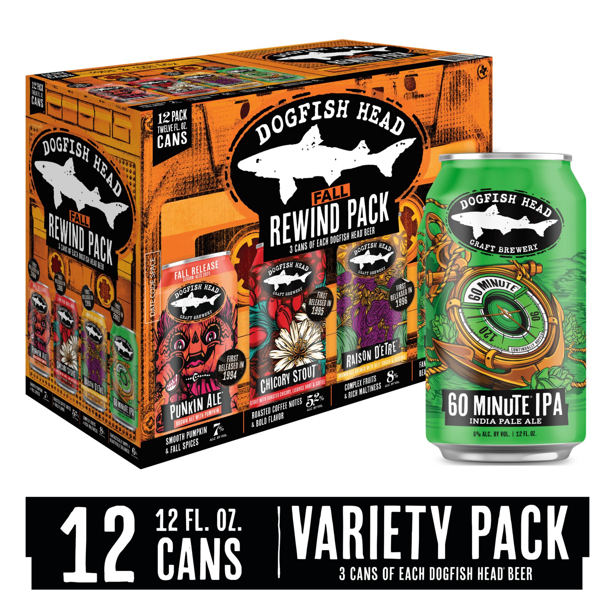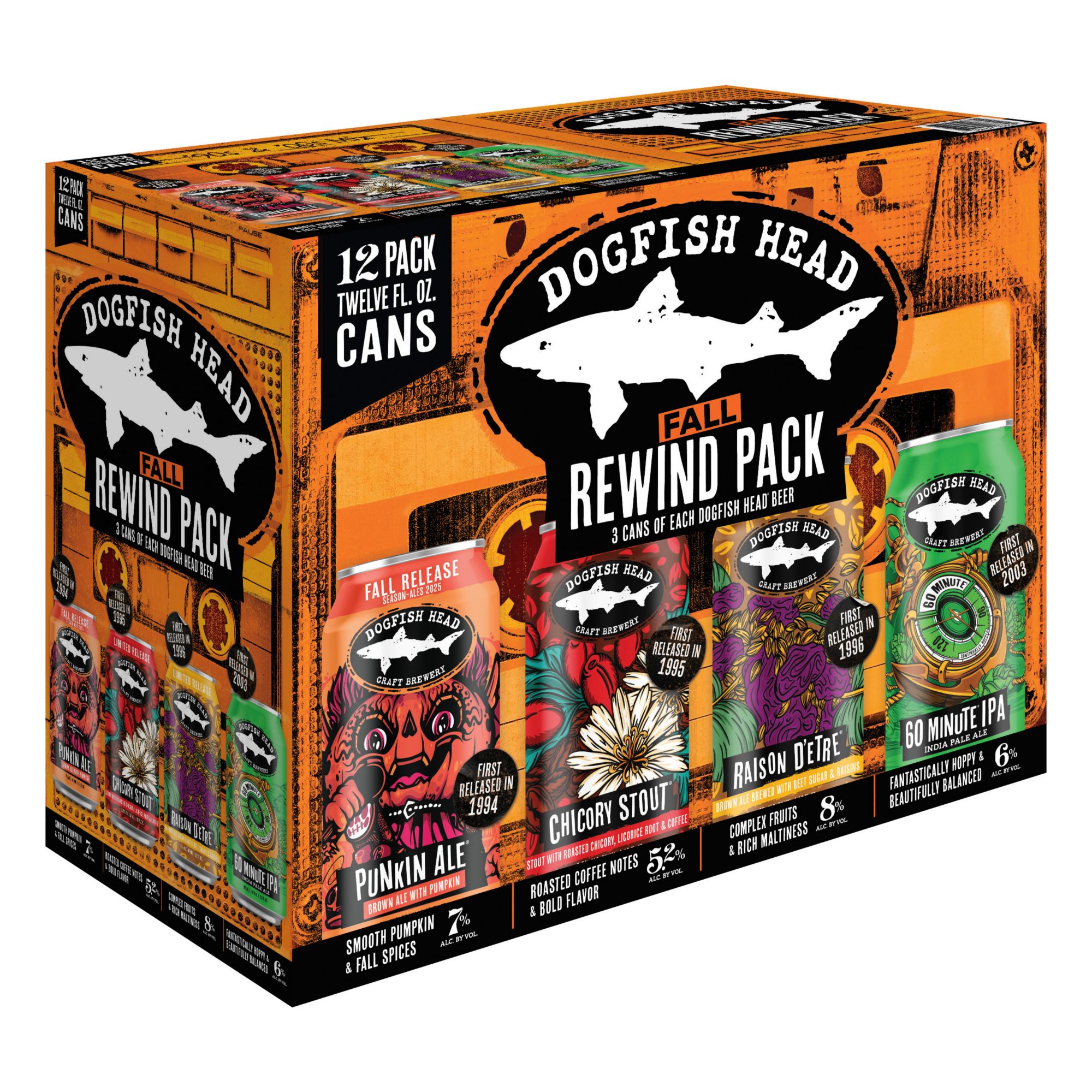 Nothing hits like the classics! The new Dogfish Head Rewind Pack brings back four fan-favorite brews that helped define the craft beer scene. Enjoy the rich flavors of Punkin Ale (1994), Chicory Stout (1995), Raison D’etre (1996), and the iconic 60 Minute IPA (2003).