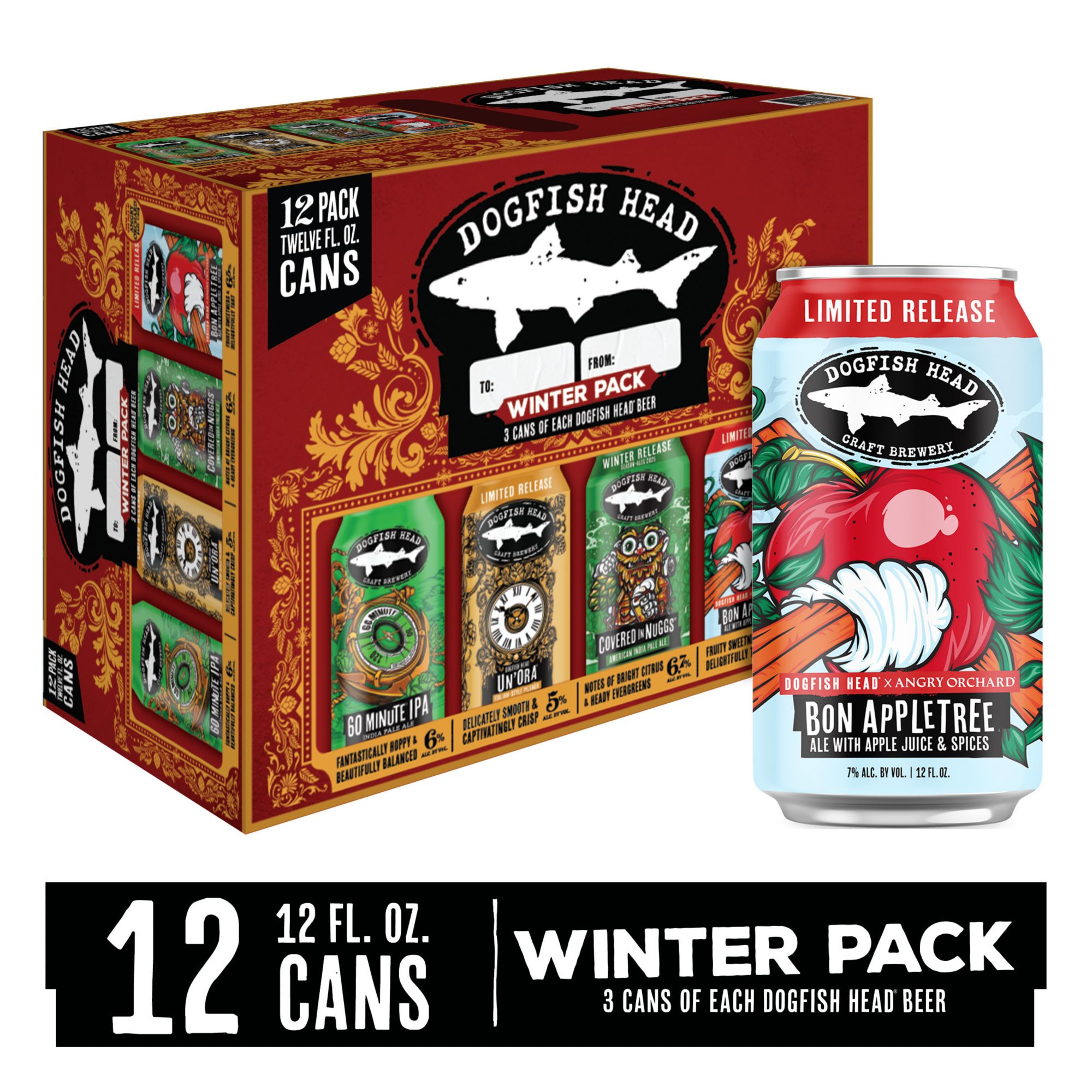 Celebrate the season with the Dogfish Head Winter Variety Pack — the ultimate holiday gift for craft beer lovers! Featuring four bold brews including the exclusive Dogfish Head x Angry Orchard Graf of Bon Appletree, this pack is perfect for cozy nights, festive gatherings, and après-ski sipping. With flavors ranging from hoppy to spiced apple ale, it’s a delicious way to toast winter’s best moments. Available through mid-January — stock up before it melts away! Styles include: 60 Minute IPA, Un’Ora Italian Style Pilsner, Covered in Nuggs American IPA and Bon Appletree Ale with apple juice and spices. 5%-6.7% ABV.