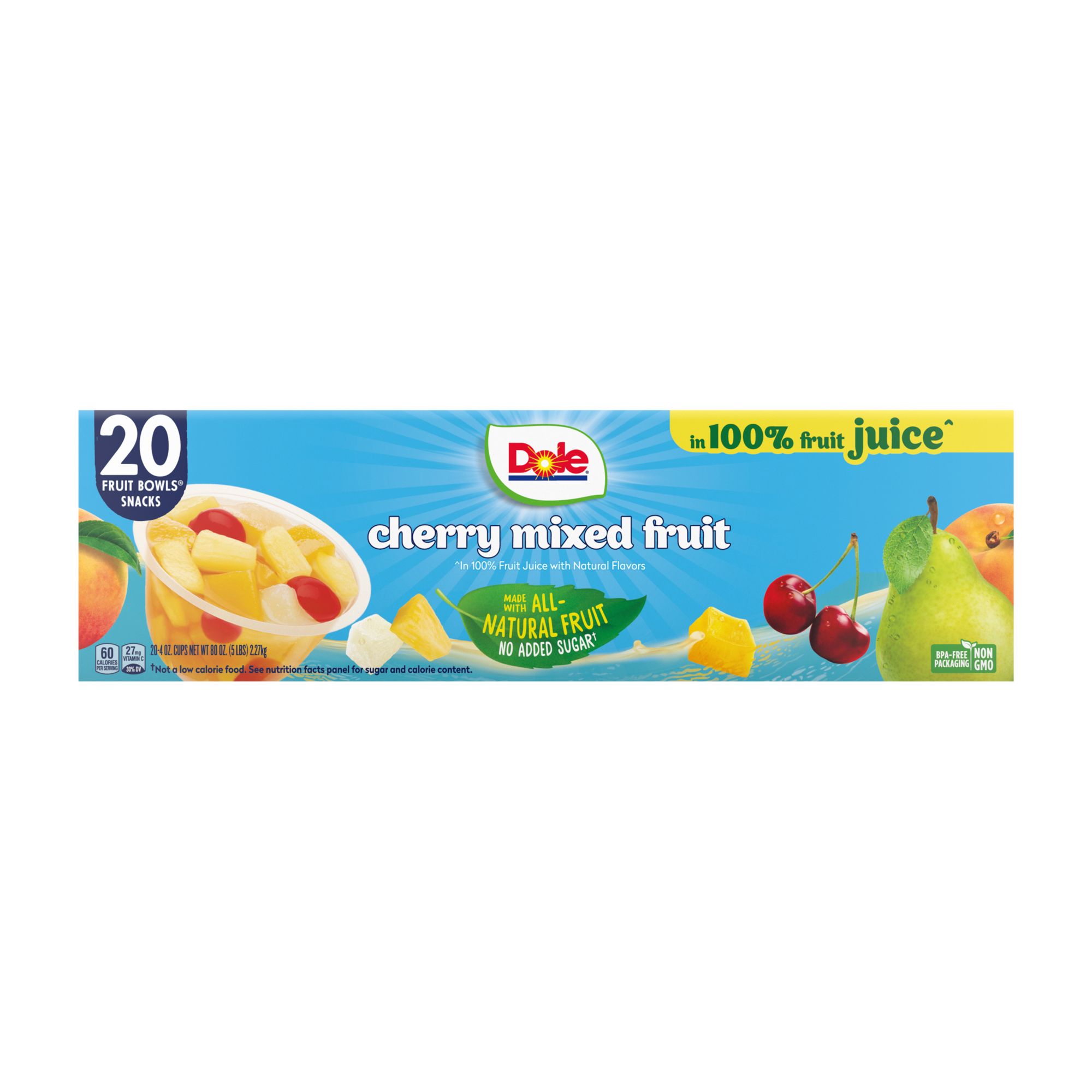 Take the sunshine wherever you go with Dole fruit bowls snacks. With Dole Fruit Bowls Cherry Mixed Fruit in 100% juice, you can enjoy the refreshing taste of delicious mixed fruit any time of year. With no added sugar, these are the perfect snack. Dole picks, trims, and packs refreshingly delicious fruit in 100% juice. Enjoy as an on-the-go snack or toss in a lunchbox. Just peel back and enjoy.