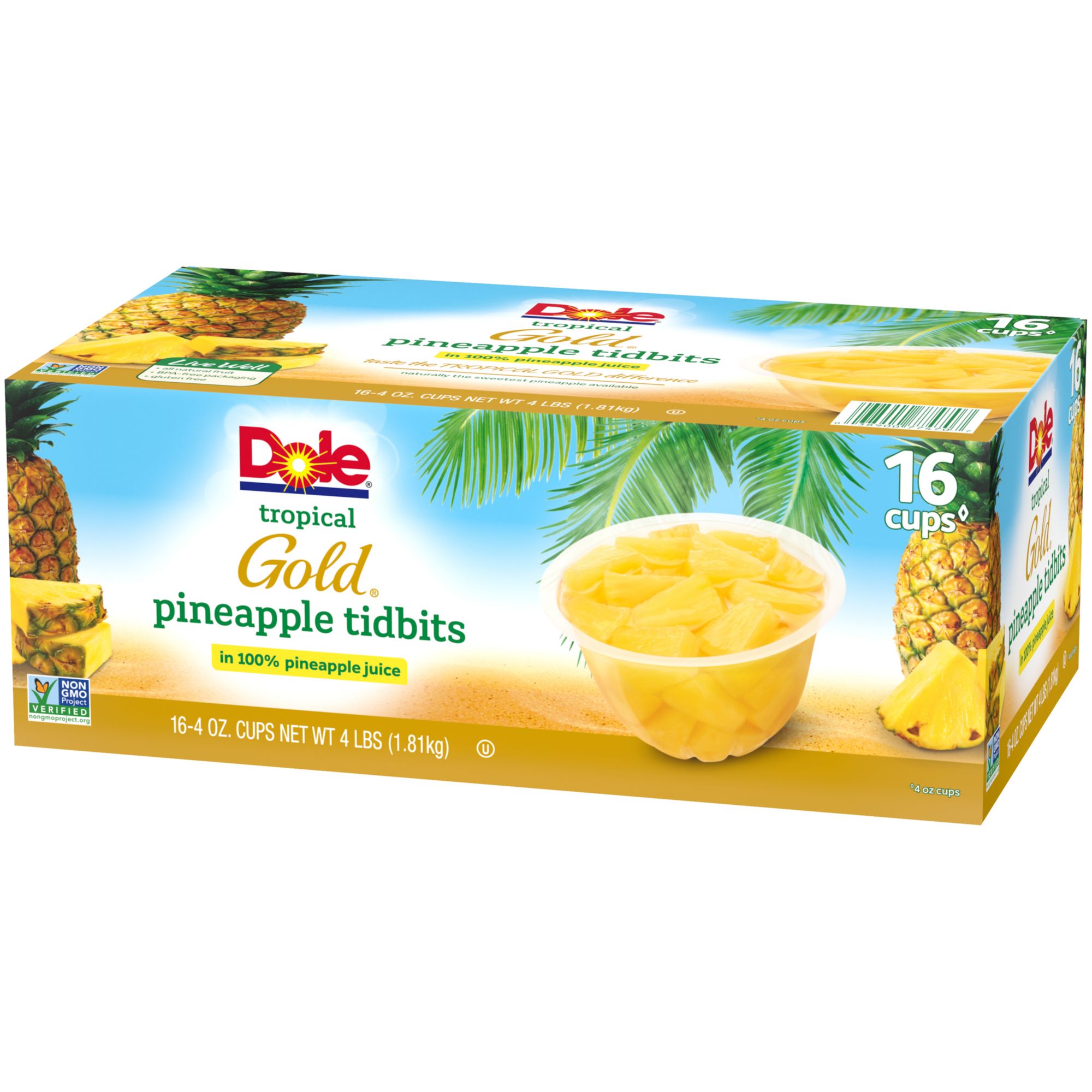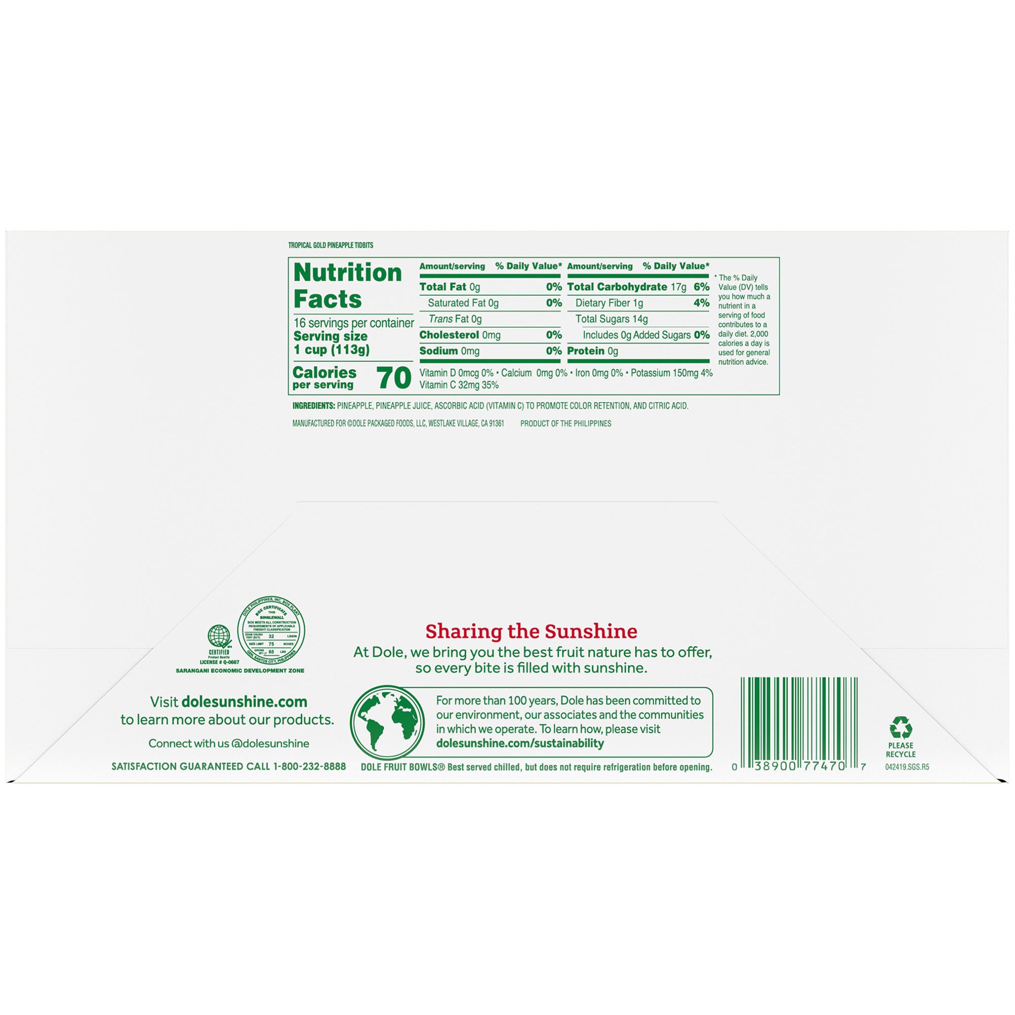 Great in lunchboxes or as an on-the-go snack, these Dole Tropical Gold 4 Oz. Premium Pineapple Tidbits Cups deliver a high amount of Vitamin C and only 70 calories. The all-natural fruit contains no artificial sweeteners, GMOs or gluten.