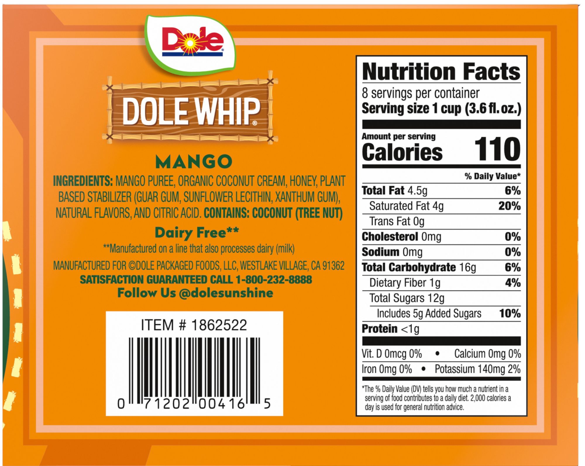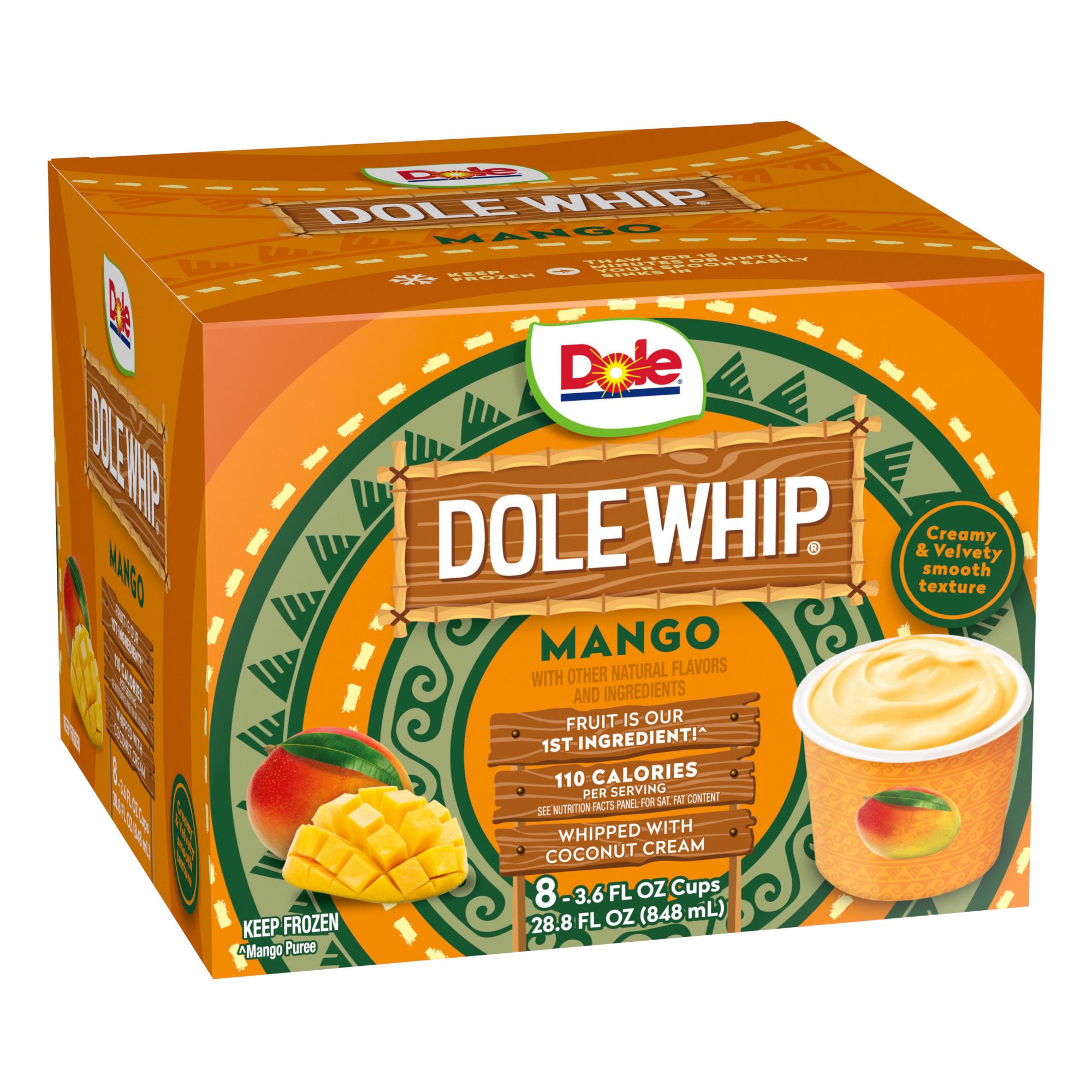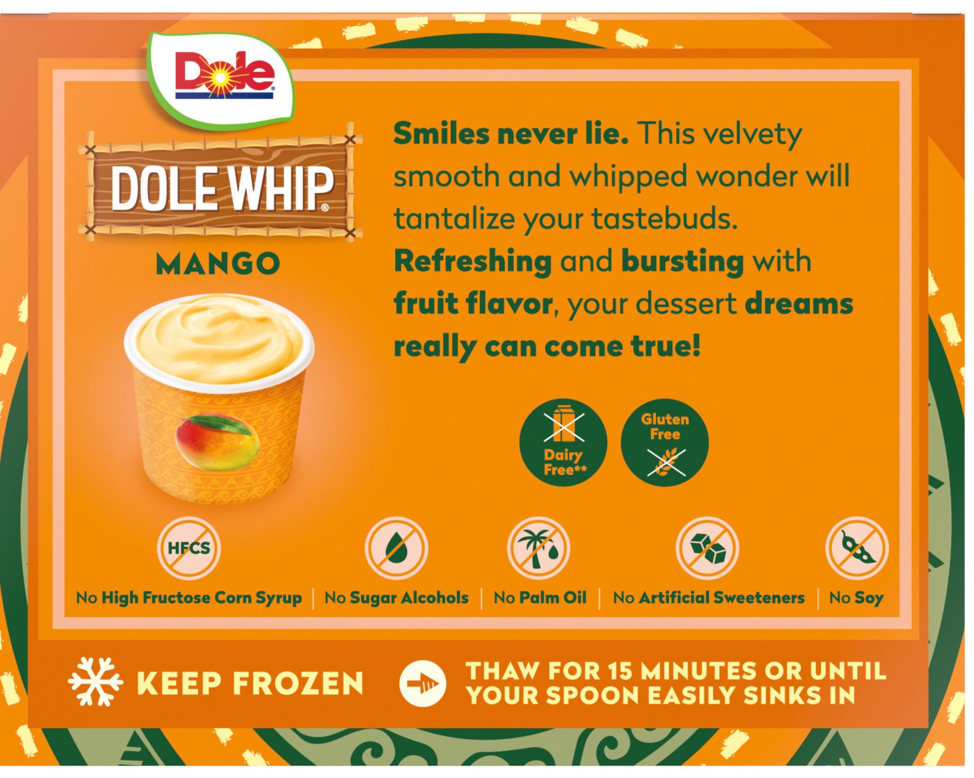 Capture the tangy richness of Dole Whip Mango. Juicy mangoes burst with flavors that harmonize with amber honey in a creamy symphony of delight. Single-serving cups make it easy and fun to indulge. With real fruit, no artificial ingredients and only 110 calories per serving, you can grab a handful of happiness anytime in the tropical world of Dole Whip.