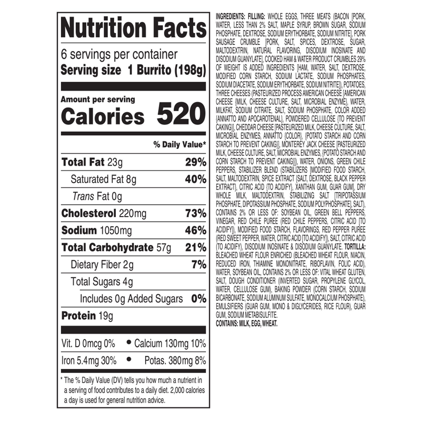 Ingredients: Filling: Whole Eggs, Three Meats (Bacon[Pork,Water,Lessthan2% Salt, Maple Syrup,Brown Sugar, Sodium Nitrite], Pork Sausage Crumble [Pork, Salt, Spices, Dextrose, Sugar, Natural Flavoring, Cooked Ham [Ham, Water, Salt, Dextrose], Potatoes, Three Cheeses (American Cheese [American Cheese {Milk, Cheese Culture, Salt, Microbial Enzyme}, Cheddar Cheese [Pasteurized Milk, Cheese Culture, Salt, Microbial Enzymes, Annatto, Monterey Jack Cheese [Pasteurized Milk, Cheese Culture, Salt, Microbial Enzymes, {Potato Starch and Corn Starch), Onions, Green Chile Peppers, Stabilizer Blend (Stabilizers [Modified Food Starch, Salt, Maltodextrin, Spice Extract {Salt, Dextrose, Black Pepper Extract}, Citric Acid], Dry Whole Milk, Green Bell Peppers, Vinegar, Red Chile Puree (Red Chile Peppers), Modified Food Starch, Flavorings, Red Pepper Puree (Red Sweet Pepper, Water, Citric Acid, Salt Disodium Inosinate & Disodium Guanylate. Tortilla: Bleached Wheat Flour Enriched (Bleached Wheat Flour, Niacin, Reduced Iron, Thiamine Mononitrate, Riboflavin, Folic Acid), Water, Soybean Oil.