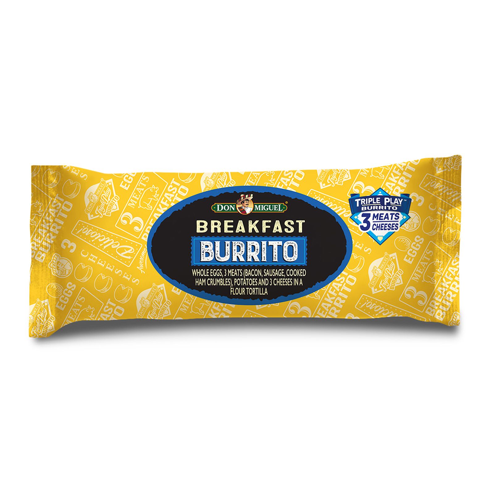 Don Miguel Brand has always been focused on convenience, quality and flavor. That’s why every single product created in their kitchens today - including hand-wrapped deli-style burritos, traditional mini tacos, and tasty breakfast burritos - is crafted with freshly prepared ingredients that really satisfy. This delicious burrito includes three meats and three cheeses: bacon, sausage and ham with Cheddar, Monterey Jack and American Cheese. Mixed perfectly with onions and green chiles for the perfect bite, times three! The perfect solution for a quick breakfast on the go or a snack throughout the day.