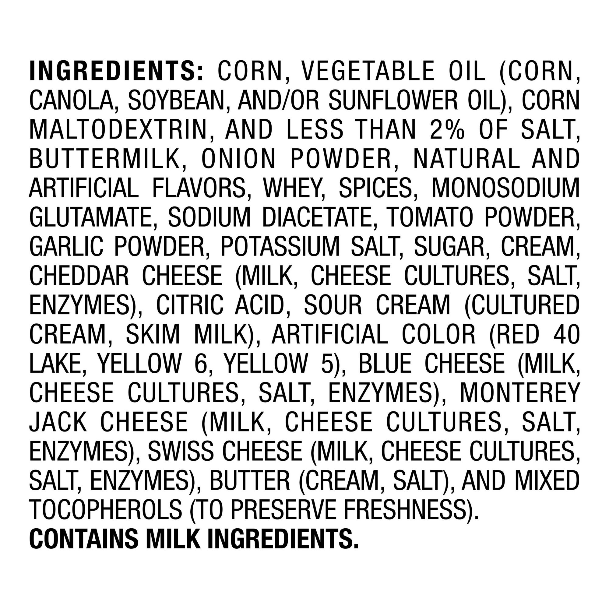 Ingredients: Corn, Vegetable Oil (Corn, Canola, Soybean, And/Or Sunflower Oil), Corn Maltodextrin, And Less Than 2% Of Salt, Buttermilk, Onion Powder, Natural And Artificial Flavors, Whey, Spices, Monosodium Glutamate, Sodium Diacetate, Tomato Powder, Garlic Powder, Potassium Salt, Sugar, Cream, Cheddar Cheese (Milk, Cheese Cultures, Salt, Enzymes), Citric Acid, Sour Cream (Cultured Cream, Skim Milk), Artificial Color (Red 40 Lake, Yellow 6, Yellow 5), Blue Cheese (Milk, Cheese Cultures, Salt, Enzymes), Monterey Jack Cheese (Milk, Cheese Cultures, Salt, Enzymes), Swiss Cheese (Milk, Cheese Cultures, Salt, Enzymes), Butter (Cream, Salt), And Mixed Tocopherols (To Preserve Freshness). Contains Milk Ingredients.