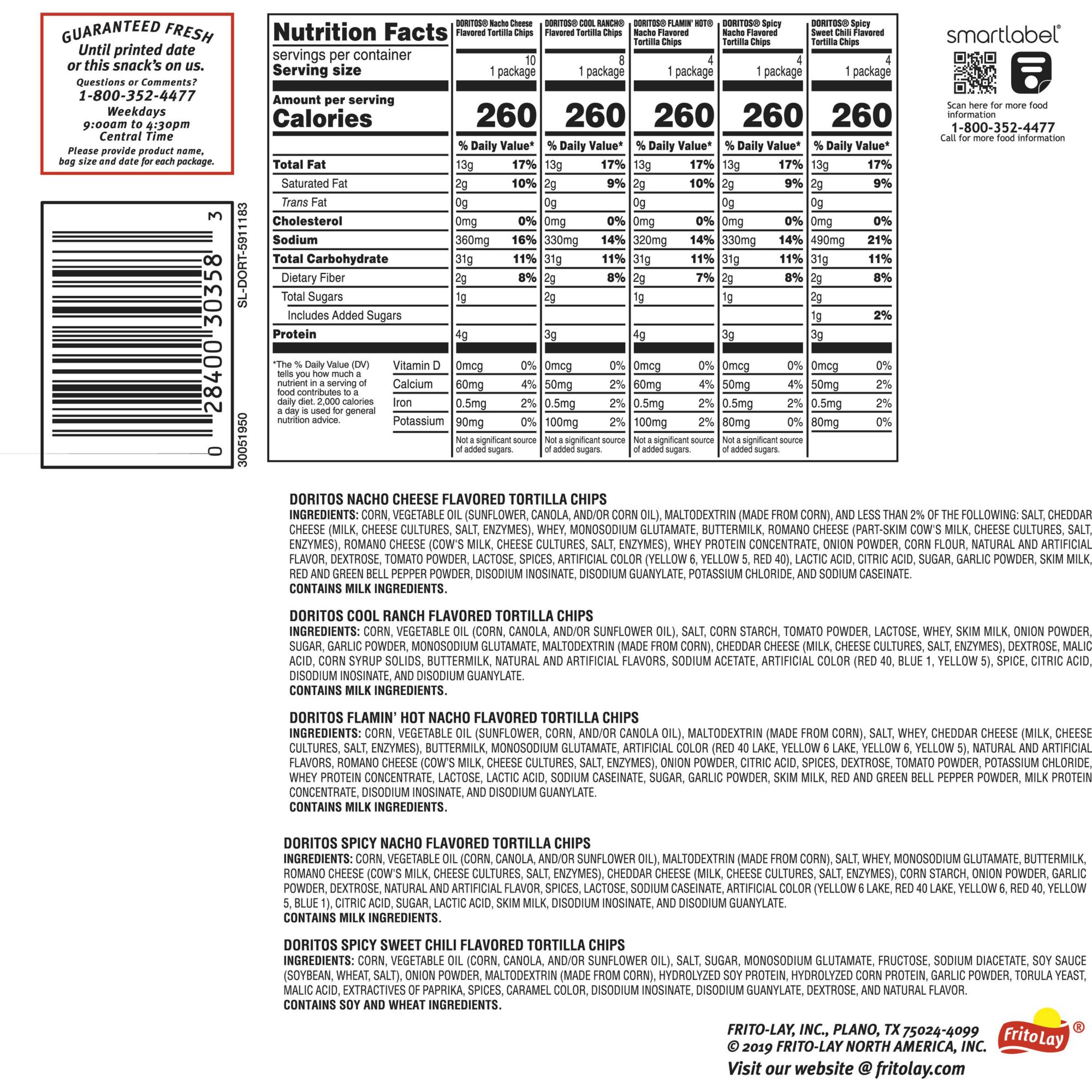 30 bags of snacks in one convenient pack Variety pack lets you choose your favorite - there's something for everyone Single-serve packs help with portion control Includes 30 small bags of Doritos flavored tortilla chips - 10 nacho cheese flavors, eight cool ranch flavors, four Flaming' hot flavors, four spicy nacho flavors, and four spicy sweet chili flavor