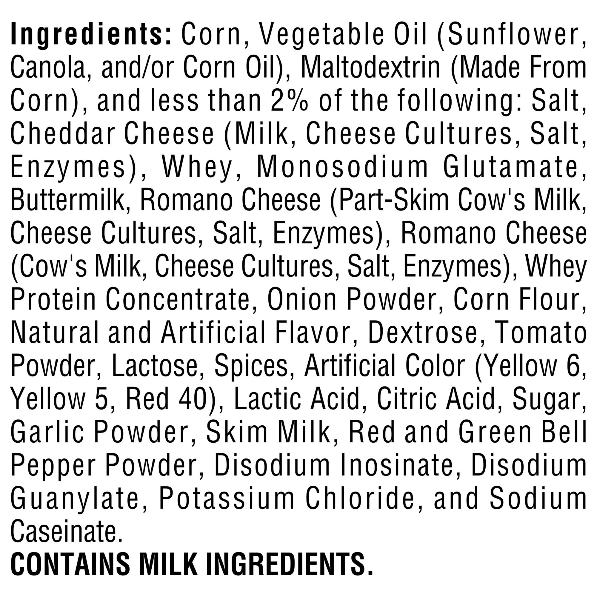 Ingredients: Corn, Vegetable Oil (Corn, Canola, and/or Sunflower Oil), Salt, Maltodextrin, Whey, Cheddar Cheese, Buttermilk, Romano Cheese, Onion Powder, Corn Flour, Natural & Artificial Flavor, Dextrose, Tomato Powder, Lactose, Spices, Artificial Color, Lactic Acid, Citric Acid, Sugar, Garlic Powder, Disodium Inosinate, Disodium Guanylate, Potassium Chloride, Sodium Caseinate.