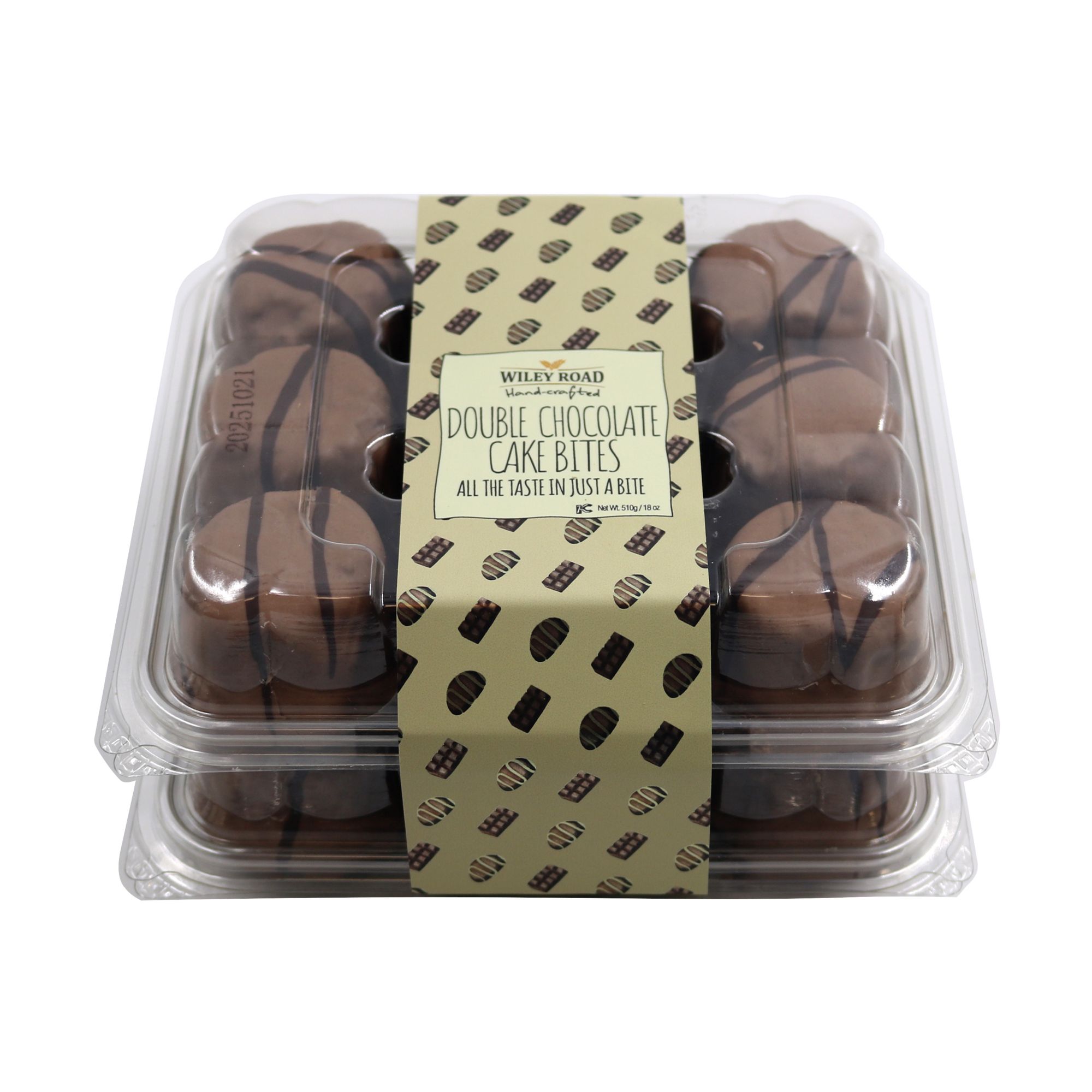 Double Chocolate Cake Bites are delightfully soft, bite-sized treats, coated in a luscious chocolatey shell for the perfect balance of richness and fruity sweetness. Each individual pack includes nine fully baked cake bites, 18 cake bites in total. Indulge in the irresistible combination of moist cake and smooth chocolatey coating, making every bite a moment of pure delight! This product is great for parties, sharable desserts, and gift baskets.