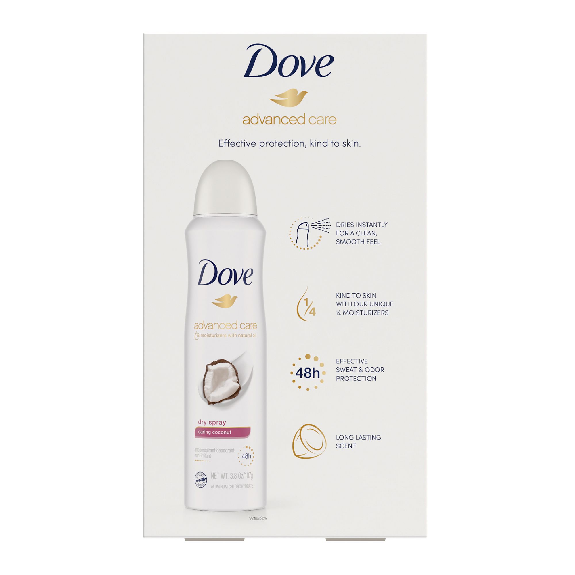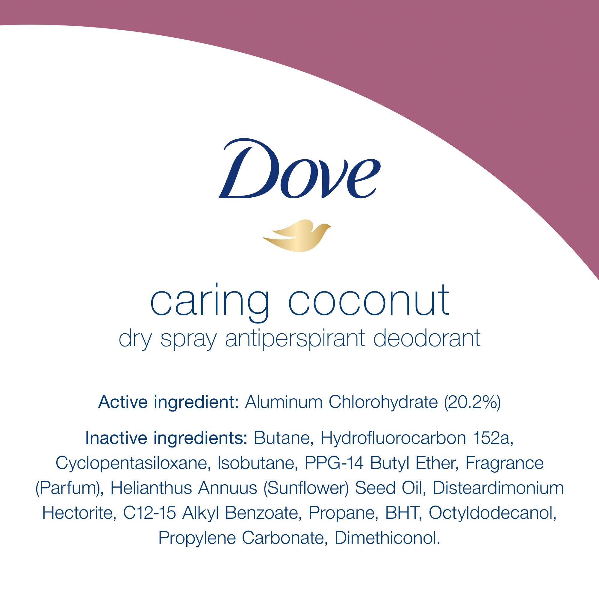 Dove Caring Coconut Dry Spray offers 48 hours of antiperspirant protection against sweat and odor for all-day freshness. With Dove 1/4 moisturizers and a 0% alcohol (ethanol) formula, this dry spray provides great underarm care and helps skin recover from shaving. You’ll notice visibly soft and smooth underarms after just a few uses. This antiperspirant for women with a delicate coconut scent will keep you feeling fresh for up to 48 hours, so you can feel confident through the day and all through the night.