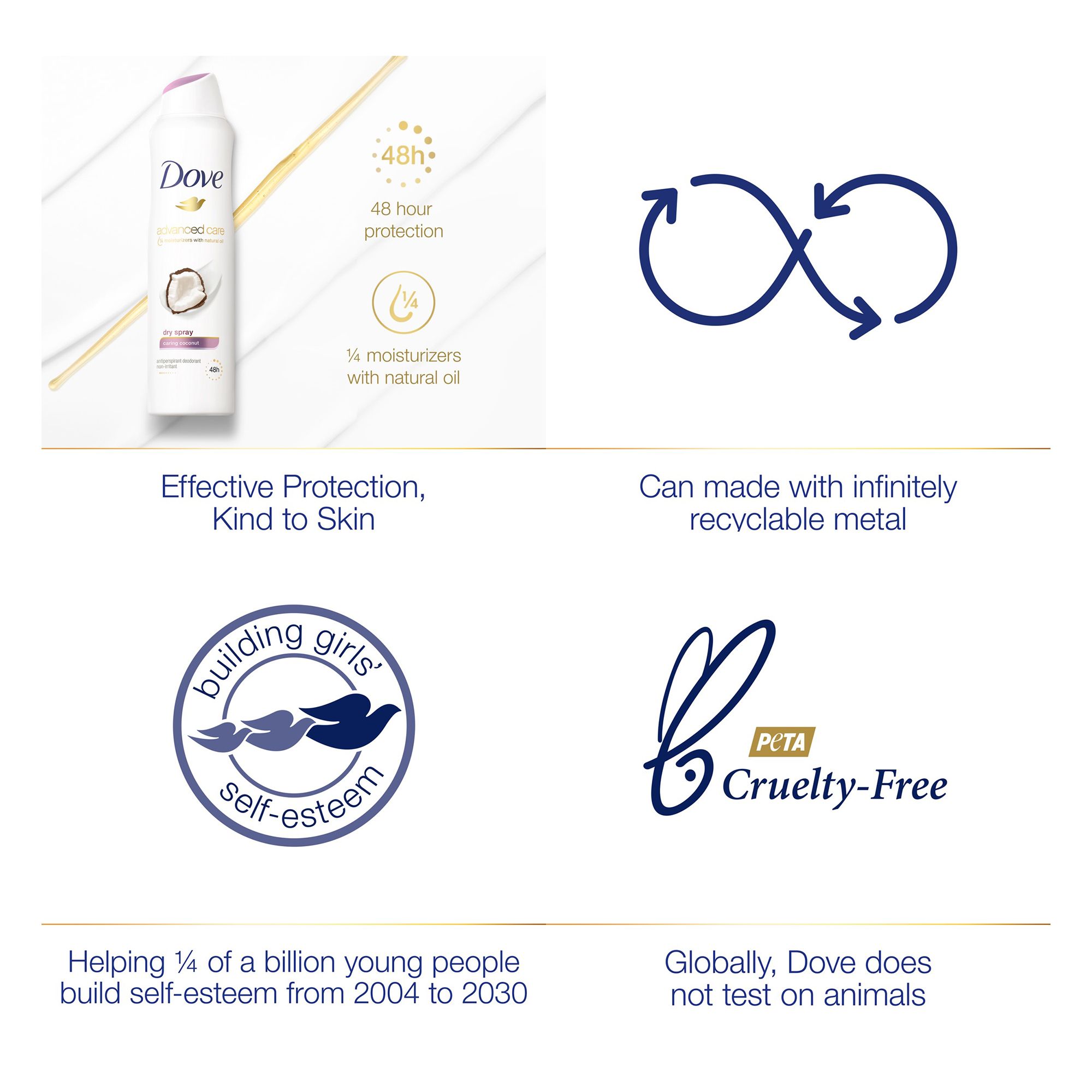 Dove's vision is of a world where beauty is a source of confidence, and not anxiety. Dove Antiperspirant Deodorants deliver effective underarm protection and are kind to skin, so women can be free of underarm inhibitions and live beautifully unselfconsciously. Dove is on a mission to help the next generation of women develop a positive relationship with the way they look - reaching over 1/4 of a billion young people with self-esteem education by 2030. Globally, Dove is PETA certified cruelty-free.