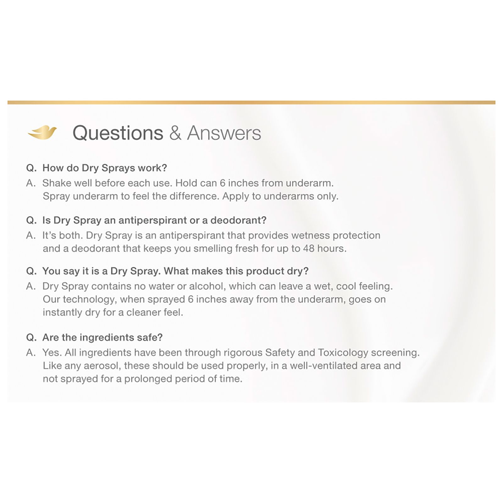Instructions for Use: To Use, Spray Each Underarm With Two Or Three Short Bursts From About 6 Inches Away. You Can Get Dressed Immediately And Start Your Day Right With This Convenient Dry Spray.