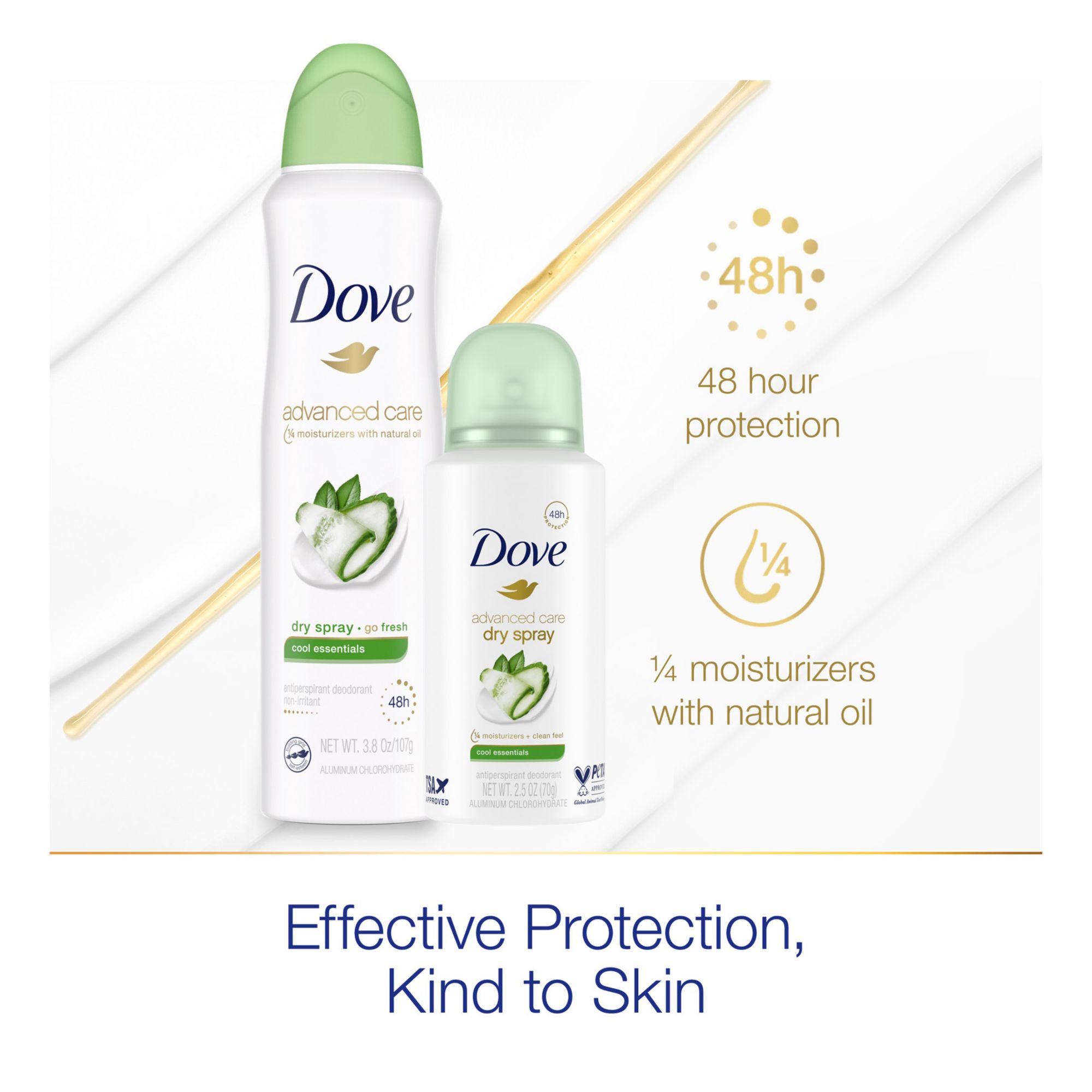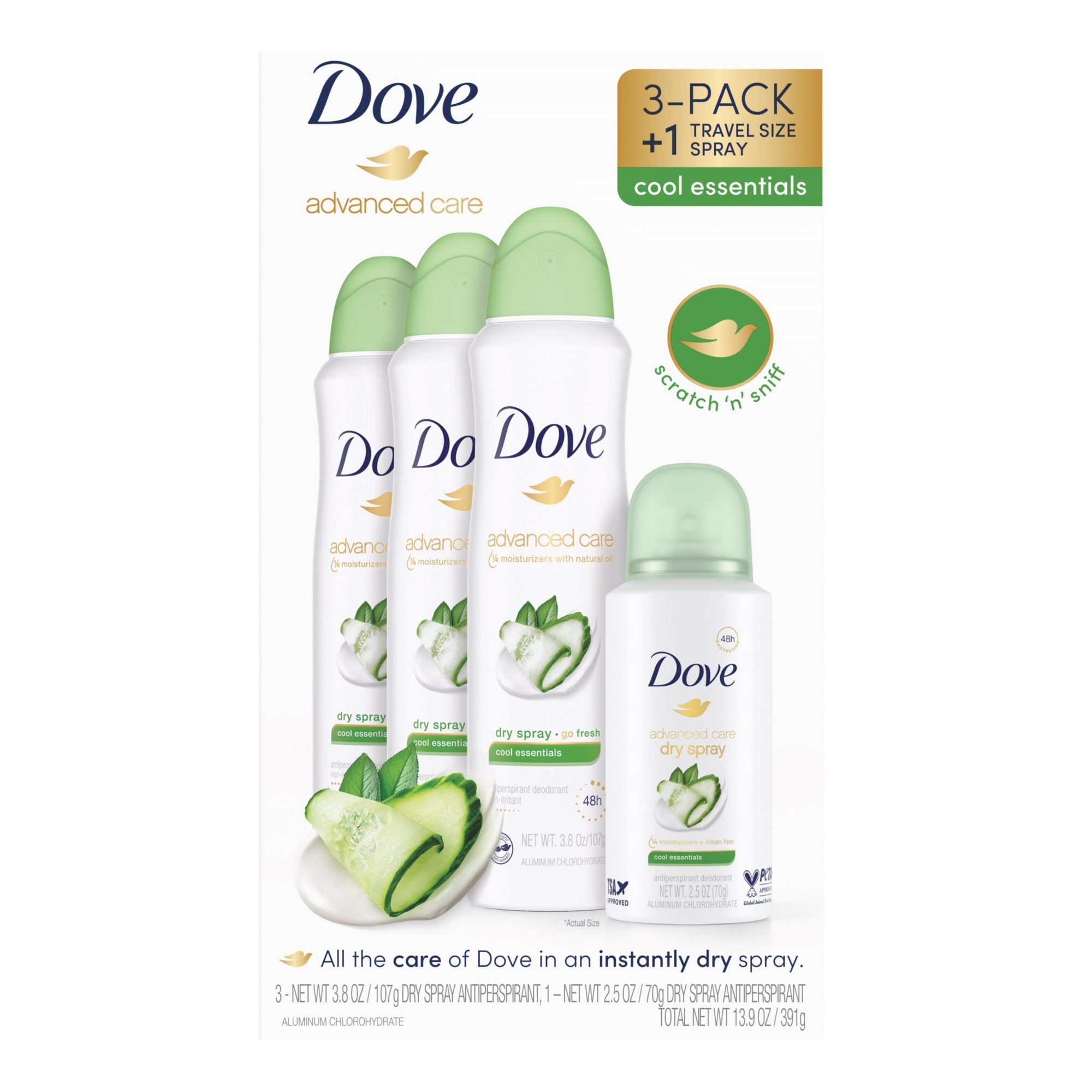 For a limited time, stock up and save with this Bonus Pack of Dove Advanced Care Cool Essentials Antiperspirant Dry Sprays. Contains three full-Sized 3.8 oz. cans and one 2.5 oz. TSA-Approved travel-size can. Infused with the fresh fragrance of crisp cucumber and honeydew melon blended with green tea, Dove Advanced Care Cool Essentials Dry Spray Antiperspirant Deodorant is ideal for a long-lasting invigorating, fresh scent. Containing Dove 1/4 moisturizers with natural oil, this antiperspirant spray helps leave underarms soft and comfortable. As much as it cares for your skin, this dry spray doesn’t compromise on antiperspirant protection. Keeping you fresh, this gentle deodorant for women protects from sweat and odor for up to 48 hours. This antiperspirant goes on instantly dry, so you can get dressed and start your day right away. In addition to staying cool all day long, Dove antiperspirant spray helps you care for your underarms. This alcohol-free formula helps delicate underarm skin recover from the underarm irritation that regular shaving can cause. For best results, apply this Dove antiperspirant deodorant to dry skin after showering and enjoy fresh, comfortably dry skin from morning to night. Dove is Certified Cruelty-Free by PETA because they believe that real beauty is cruelty-free. They're on a mission to help women raise their self-esteem - because they believe beauty should be a source of confidence, not anxiety. Dove Antiperspirant Deodorants deliver effective underarm protection and are kind to skin, so women can be free of underarm inhibitions and live beautifully unselfconsciously.