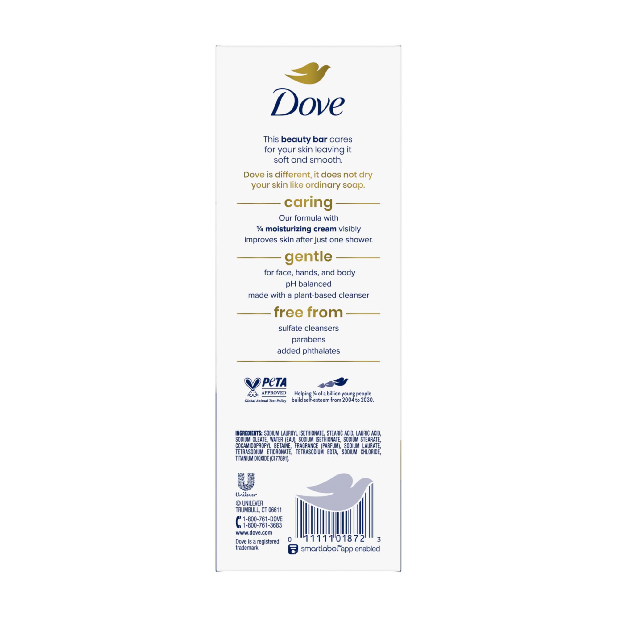This Dove Beauty Bar offers a caring cleansing experience. Unlike ordinary bar soap, the Dove Beauty Bar is made with 1/4 moisturizing cream to deeply nourish skin and help prevent dryness. This cleansing bar is uniquely created with 1/4 moisturizing cream and a plant-based cleanser for skin care that maintains pH balance and the natural skin barrier. This gentle skin cleanser is multi-purpose: gently washing away dirt and oil while moisturizing and nourishing the skin. It is gentle enough for use on face, hands, and body, as a facial cleanser and body soap bar. To use this Original Beauty Bar, wet your hands and gently lather the Beauty Bar between them, then apply the lather to your face or body before rinsing thoroughly with water. As the #1 dermatologist recommended bar brand, the Dove Beauty Bar formula is free from sulfate cleansers, parabens, and phthalates. Dove believes real beauty is cruelty-free. Globally, Dove does not test on animals and is certified as PETA Approved. Through the Dove Self-Esteem Project, Dove helps parents, mentors, teachers, and youth leaders deliver self-esteem education that’s reached more than 60 million young people so far. By 2030, their mission is to have helped ¼ billion build positive body confidence.
