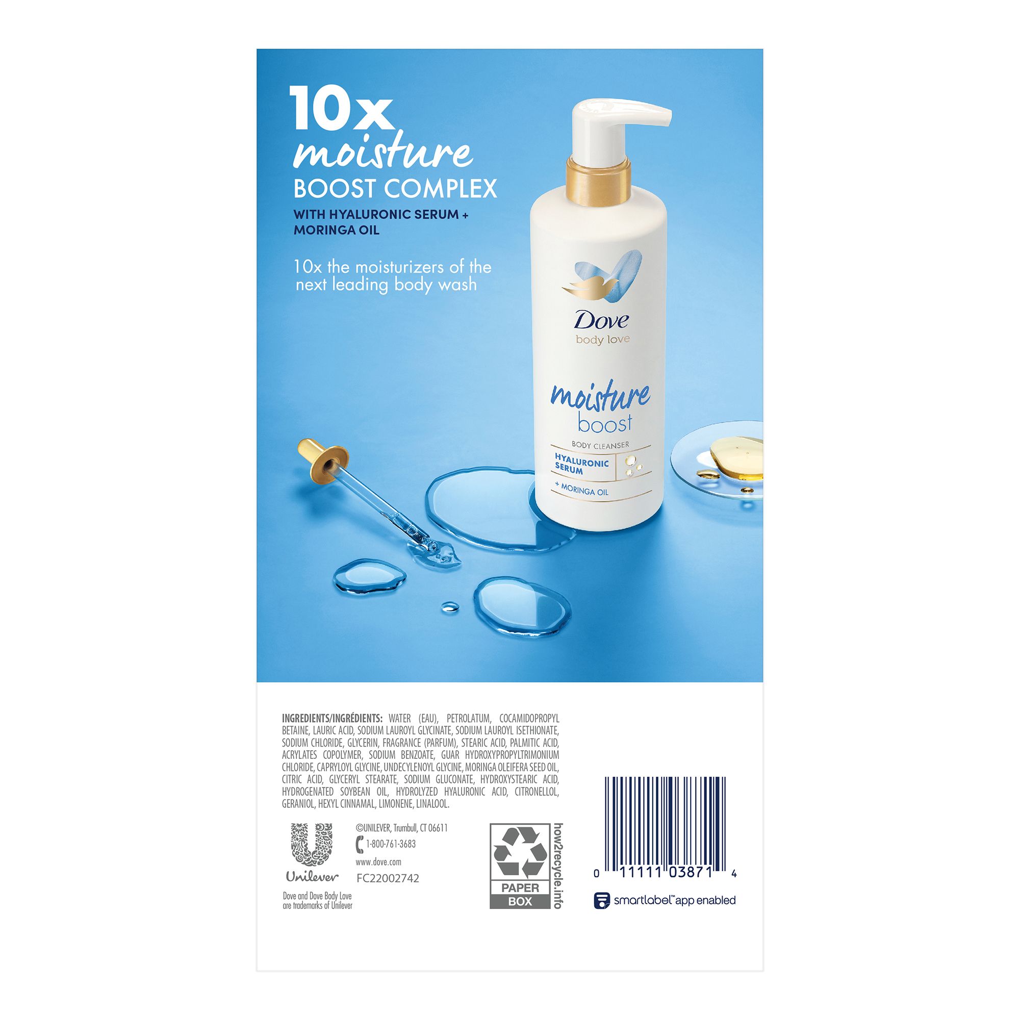 Ready to show your body some love? Boost your skin’s moisture with Dove Moisture Boost body cleanser. Made with the face care ingredients you love in your daily face care regimen, just wait and see what they can do for your body. Formulated with a 10X Moisture Boost Complex,* this cleanser for dry skin has a rich, creamy texture that cares for your body and helps skin stay hydrated, with lasting softness. Just like your favorite skin care with hyaluronic acid, this cleanser for your body actually helps your skin retain moisture, fortifying the skin barrier to keep it hydrated. Formulated with hard-working face care ingredients like hyaluronic acid, moringa oil and 10X Moisture Boost Complex,* Dove Moisture Boost Body Cleanser is ideal for quenching thirsty skin and showing your body a little TLC. A paraben and sulfate free cleanser, it’s also as gentle as water, formulated with plant-based cleansers and is PETA-certified cruelty-free and made in 100 percent recycled plastic bottles. This ultra-hydrating body cleanser drenches skin with a surge of moisture, leaving you with softness that lasts 24 hours. A regular body wash can leave skin feeling dry post-shower. Try switching your regular cleanser for a serum-infused body cleanser or cleanser with hyaluronic acid. Dove believes that no young person should be held back from reaching their full potential. Since 2004, they’ve been building self-esteem and confidence in young people – and by 2030, they’ll have helped ¼ billion through our educational programmes and resources. Dove Body Love Moisture Boost Cleanser – Glamour 2022 Best Drugstore Skincare Award Winner for Best Body Wash.