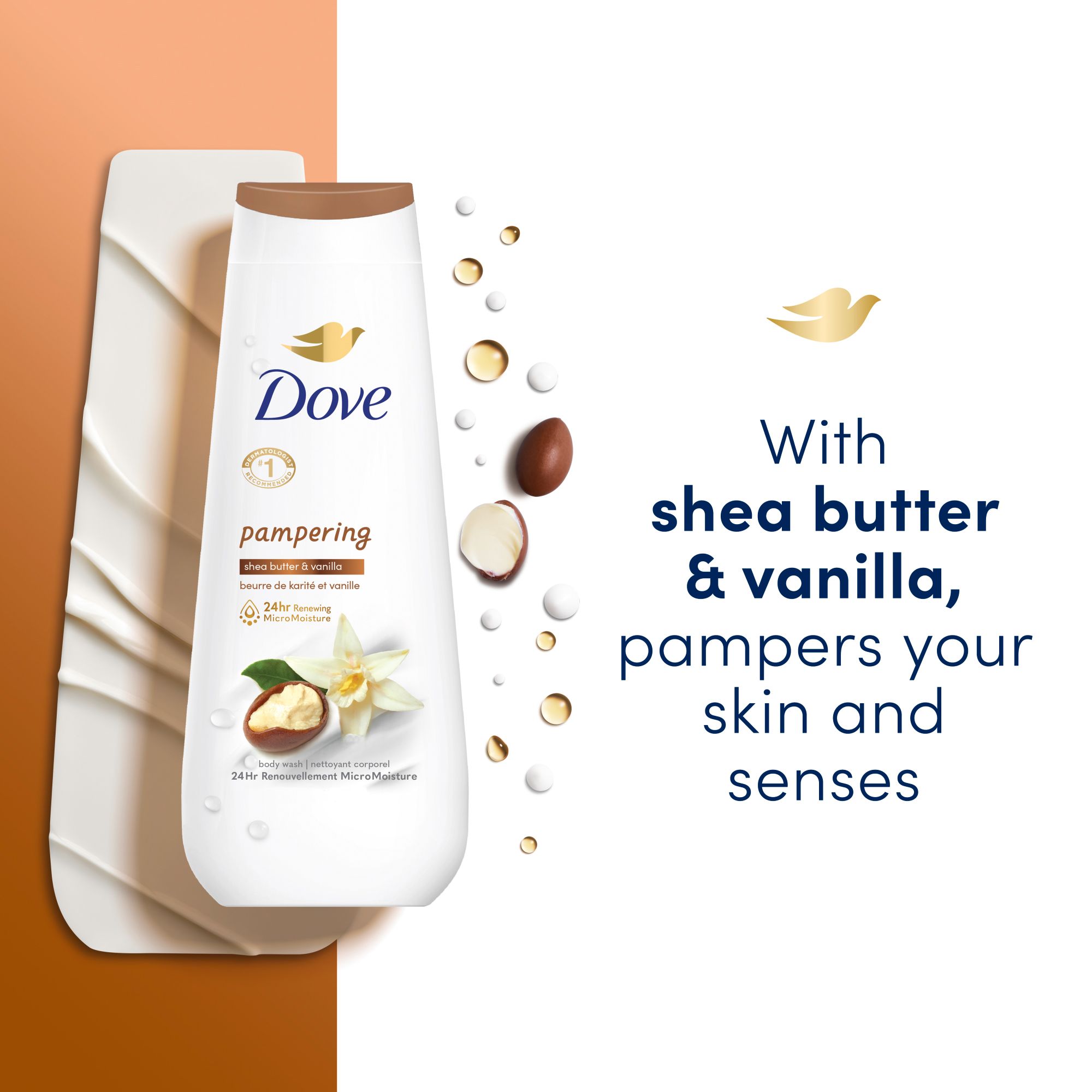 Pamper: Dove Pampering Body Wash has a rich, creamy texture and is full of skin-loving nourishers to moisturize your skin as the shea butter and warm vanilla scent pampers your senses with every shower.