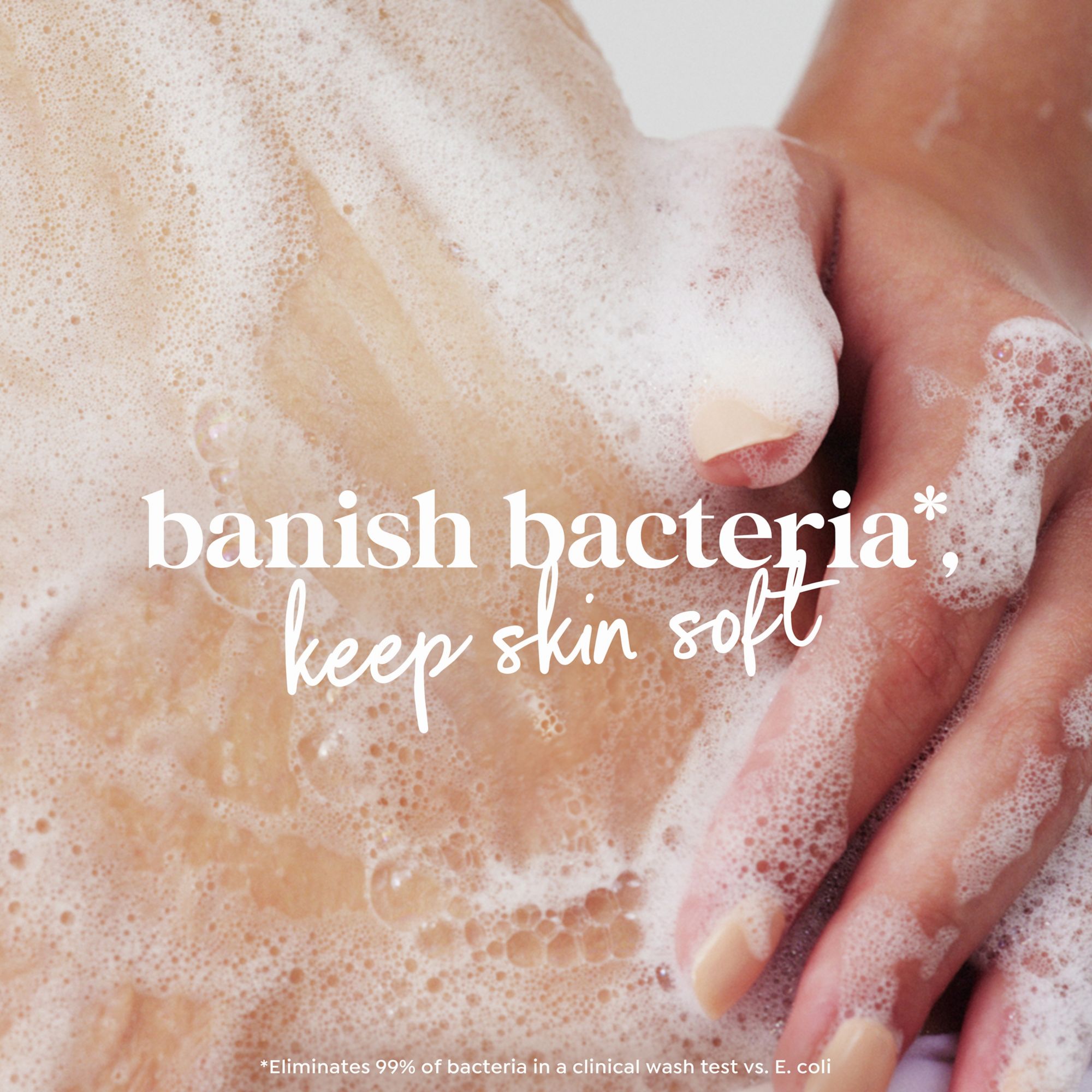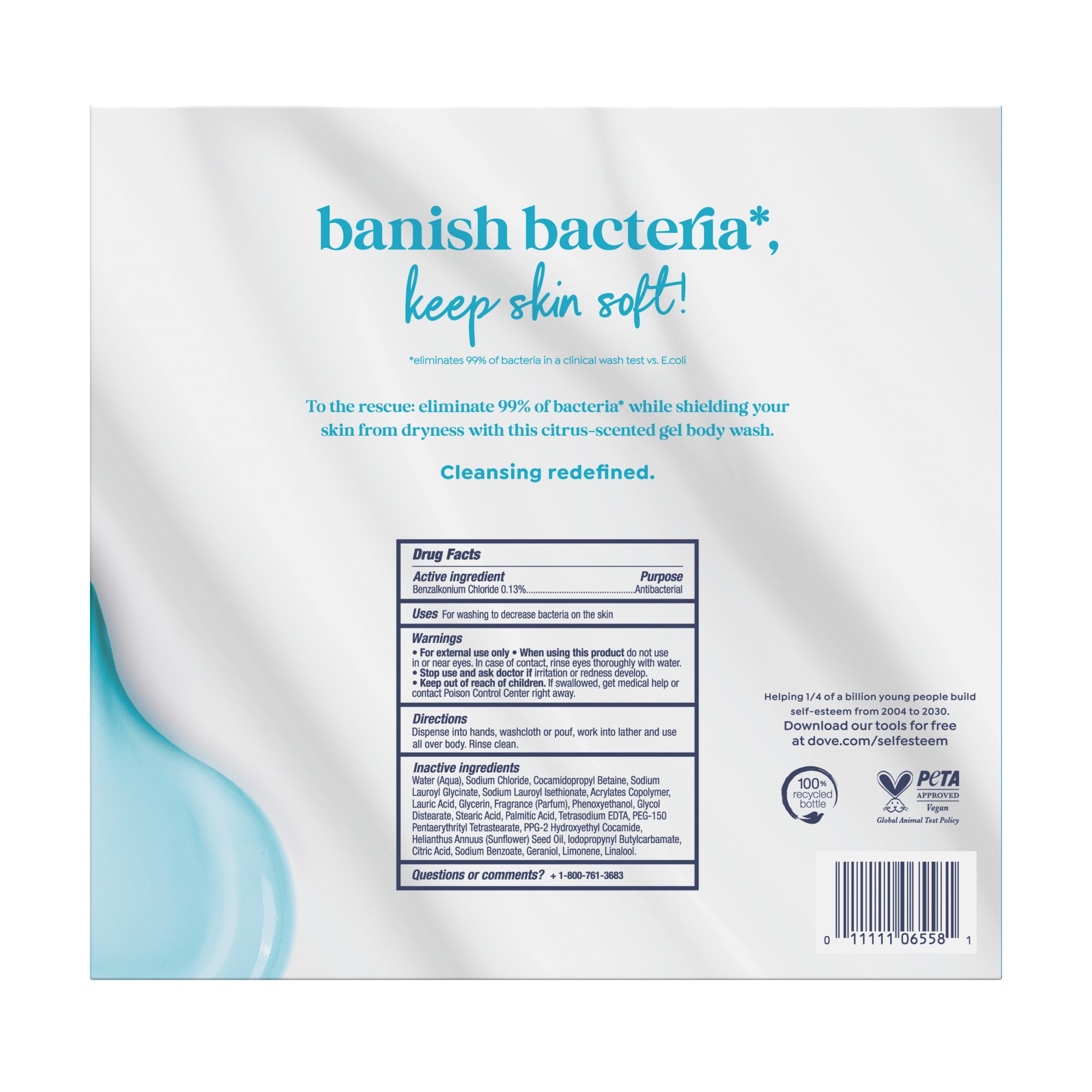 Get out of here! Banish bacteria* from your scared skingdom with our Dove Antibacterial Body Wash. Different from others, this hydrating gel formula gently yet effectively cleanses without drying out the skin, eliminates 99% of bacteria in one wash, and moisturizes 100% of your skin. We like those numbers. Our signature Moisture Renew Blend renews and locks in skin’s moisture and locks out harmful bacteria, leaving you with long-lasting nourishment and soft skin. Win-win. And did we mention how it smells? The cleansing scent of sun-drenched citrus, delicate dewy florals, and soft creamy woods will transport you to a seaside Sicilian garden. So basically, the formula is working overtime while your senses are Euro trippin’. To use this hydrating gel formula, squeeze it into palms or a loofah, work into a lather, spread over skin, rinse with warm water, and step out of the shower feeling squeaky clean and super soft. Who else would you trust, but the #1 dermatologist-recommended brand (us!) to deliver a long-lasting, moisturizing body wash? Our antibacterial body wash is vegan, and Dove is PETA approved, meaning we do not test on animals anywhere in the world. Plus, it’s sulfate-free, paraben-free, and packaged in 100% recycled bottles. (*Eliminates 99% of bacteria in a clinical wash test vs. E. coli)