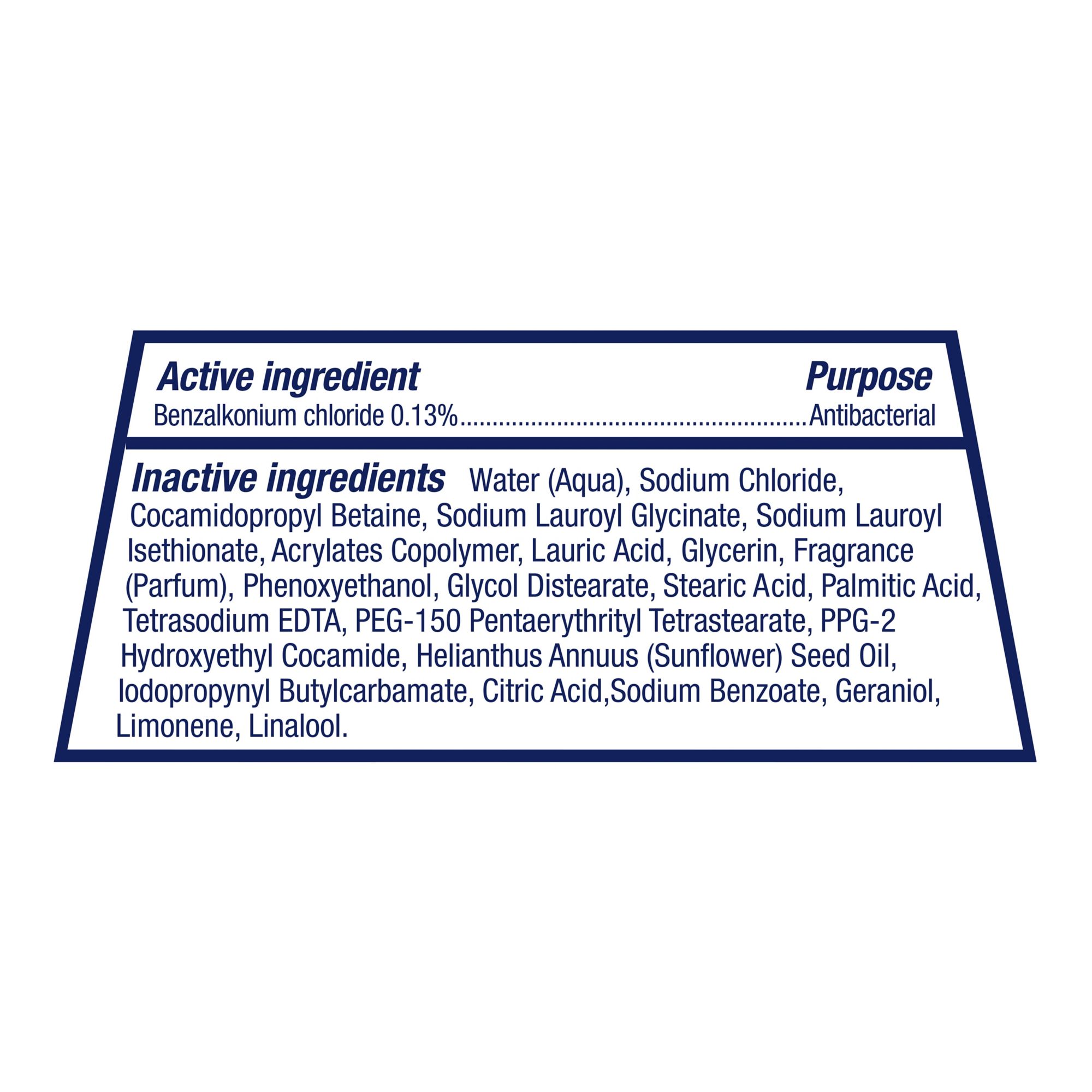Active Ingredient: Benzalkonium Chloride 0.13%; Inactive Ingredients: Water (Aqua), Sodium Chloride, Cocamidopropyl Betaine, Sodium Lauroyl Glycinate, Sodium Lauroyl Isethionate, Acrylates Copolymer, Lauric Acid, Glycerin, Fragrance (Parfum), Phenoxyethanol, Glycol Distearate, Stearic Acid, Palmitic Acid, Tetrasodium EDTA, PEG-150 Pentaerythrityl Tetrastearate, PPG-2 Hydroxyethyl Cocamide, Helianthus Annuus (Sunflower) Seed Oil, Iodopropynyl Butylcarbamate, Citric Acid, Sodium Benzoate, Geraniol, Limonene, Linalool