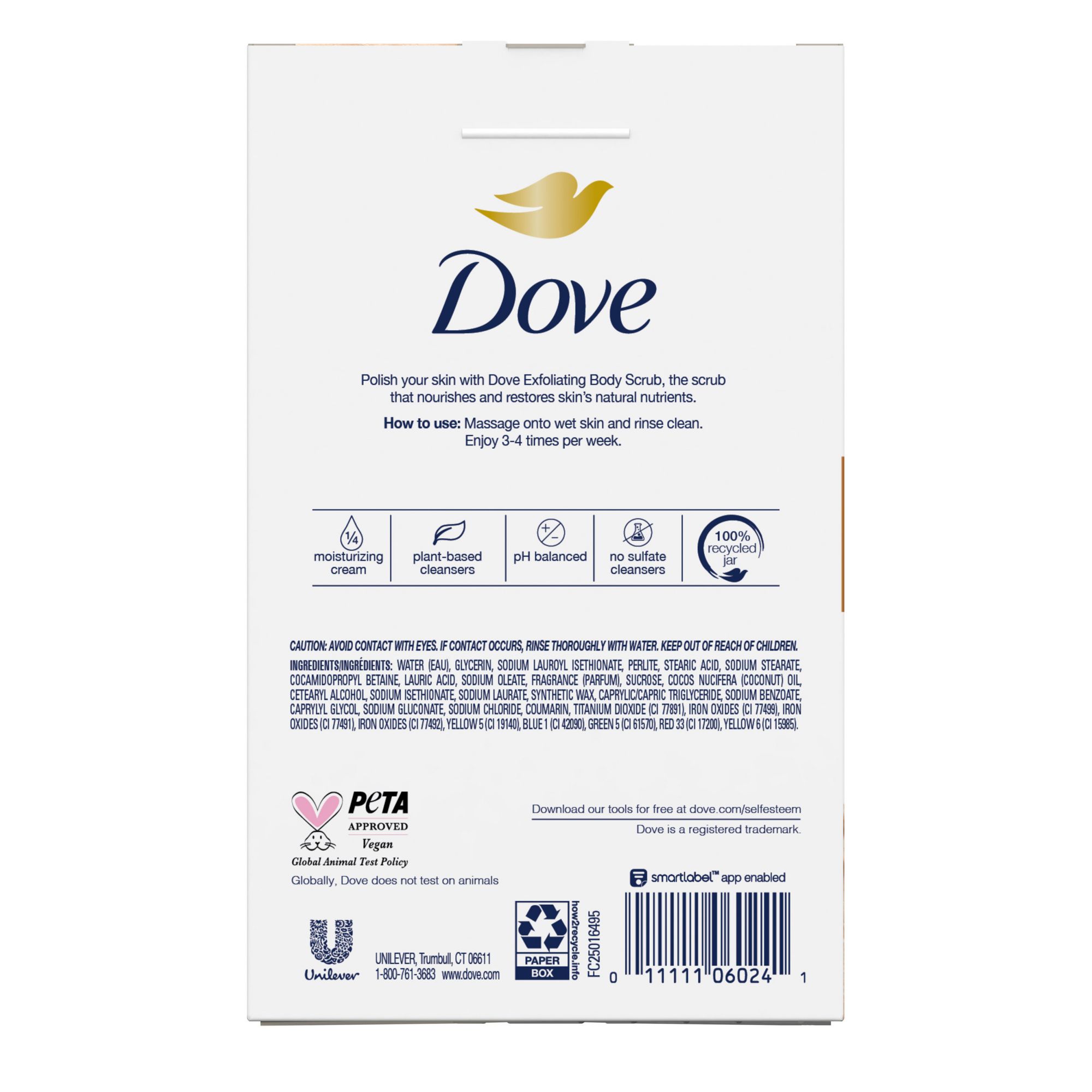 Thoughtfully made - This body scrub is PETA-certified cruelty-free. Feel good about switching to Dove. A great addition to your skin care routine