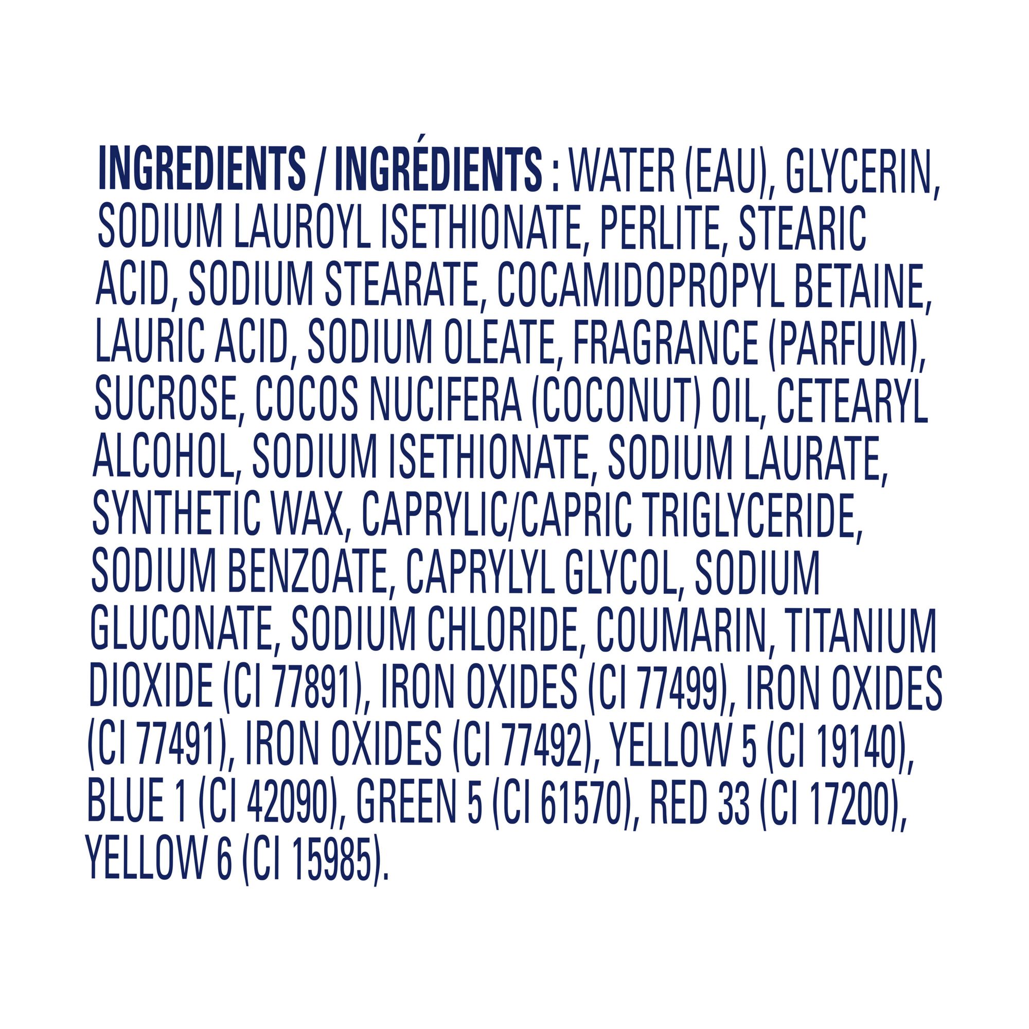 Ingredients: Water (Eau), Glycerin, Sodium Lauroyl Isethionate, Perlite, Stearic Acid, Sodium Stearate, Cocamidopropyl Betaine, Lauric Acid, Sodium Oleate, Fragrance (Parfum), Sucrose, Cocos Nucifera (Coconut) Oil, Cetearyl Alcohol, Sodium Isethionate, Sodium Laurate, Synthetic Wax, Caprylic/Capric Triglyceride, Sodium Benzoate, Caprylyl Glycol, Sodium Gluconate, Sodium Chloride, Coumarin, Titanium Dioxide (CI 77891), Iron Oxides (CI 77499), Iron Oxides (CI 77491), Iron Oxides (CI 77492), Yellow 5 (CI 19140), Blue 1 (CI 42090), Green 5 (CI 61570), Red 33 (CI 17200), Yellow 6 (CI 15985).