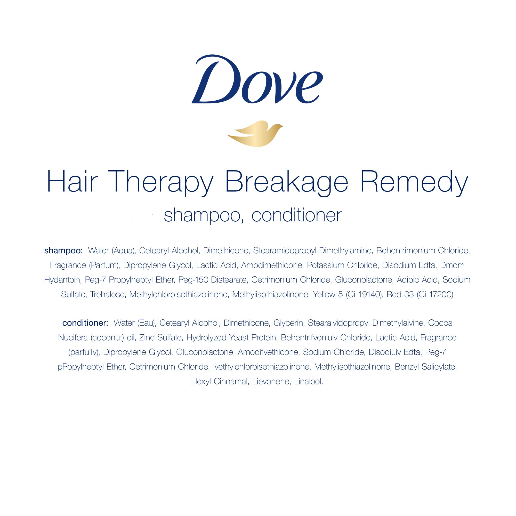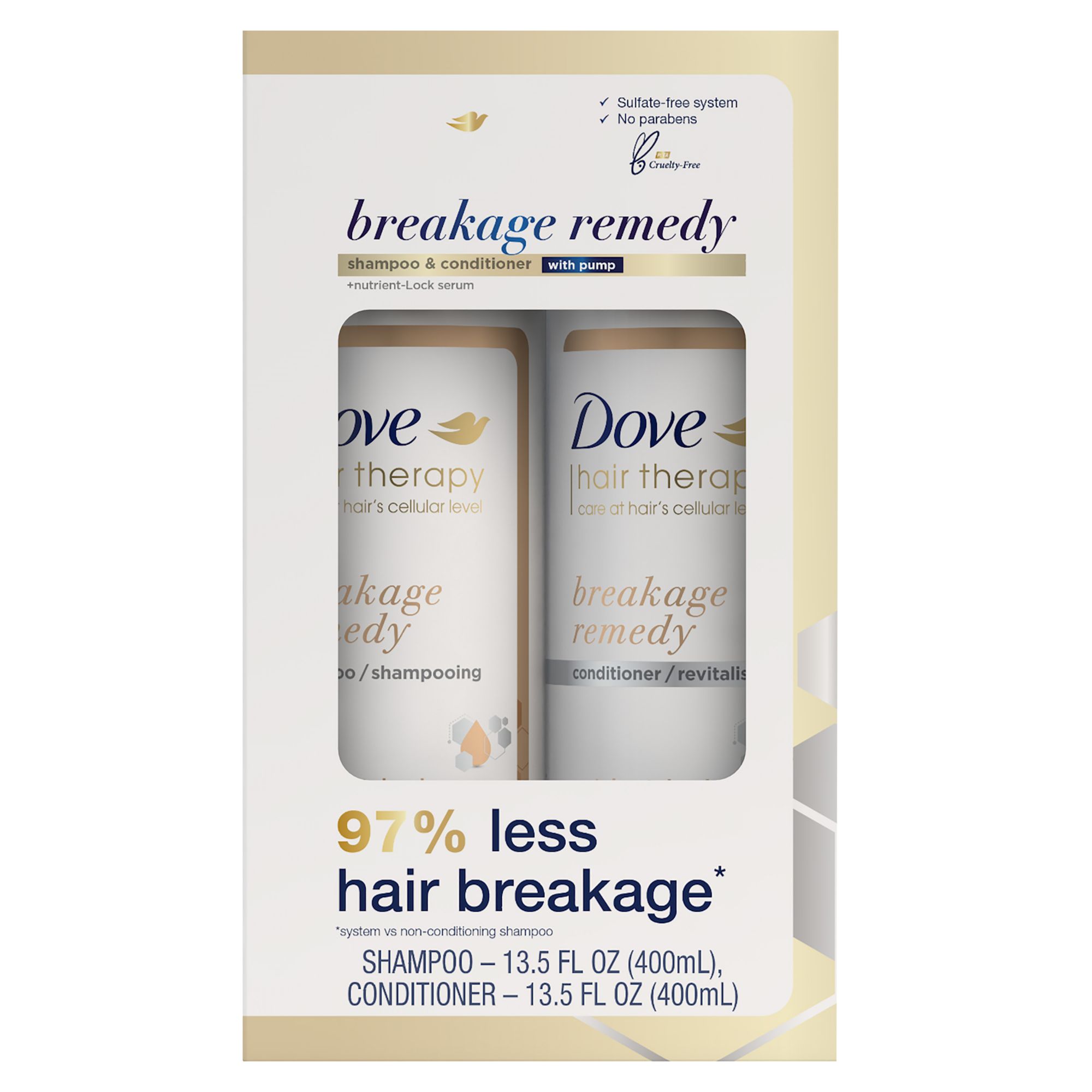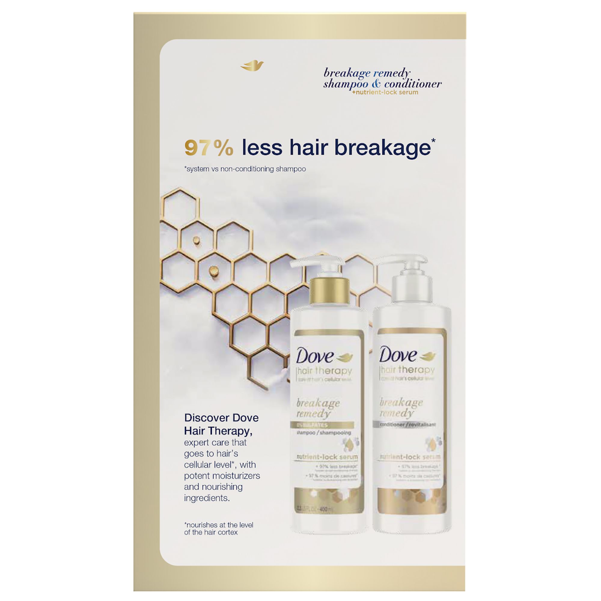 This dove breakage remedy regimen pack includes a dove hair therapy breakage remedy shampoo and dove hair therapy breakage remedy conditioner Anti-breakage hair shampoo strengthens for healthy-looking strands This conditioner for damaged hair helps make hair look thicker, stronger and healthy-looking Breakage remedy shampoo and nourishing hair conditioner formulated with nutrient-lock serum Shampoo and conditioner for beautiful, healthy-looking strands with 97% less hair breakage Breakage remedy range carries the PETA cruelty-free logo for added peace of mind Includes 2 pk./13.5 fl. oz. Dove hair therapy regimen pack breakage remedy shampoo and conditioner