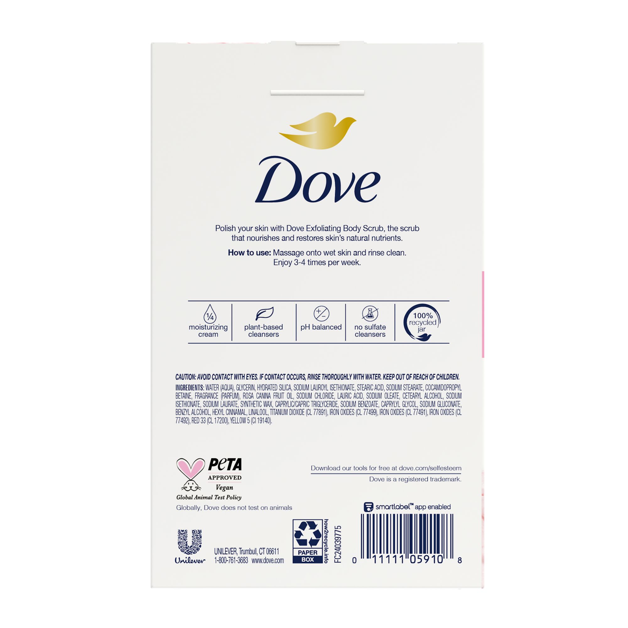 Unlock the power of our moisture formula with Dove Body Scrubs, uniquely created with 1/4 moisturizing cream, ensuring your skin is well-prepared and rejuvenated with the exceptional Himalayan Salt & Rose Oil blend. Embrace a self-care journey as you polish your way to natural nourishment, with a delightful fusion of naturally sourced ingredients and sulfate-free cleansers, leaving your skin irresistibly silky and smooth. Prioritize care while you exfoliate, by gently massaging the scrub onto wet skin and thoroughly rinsing before using your preferred Dove Body Wash or Dove Beauty Bar - make it part of your routine 3-4 times a week. Dove care goes beyond your skin by delivering the Dove Body Scrub in an eco-conscious, recyclable plastic jar made entirely from 100% recycled materials. Achieve lasting smoothness with this exfoliating body scrub's pH-balanced whipped texture, creating a sumptuous and creamy lather that gently eliminates dead skin cells, unveiling a fresh layer of beautifully radiant skin. Feel confident in your choice with this thoughtfully made body scrub that is PETA-certified and cruelty-free, making the switch to Dove a decision you can be proud of, and a wonderful addition to your skincare routine. Experience the transformative power of Dove, from moisture to sustainability, all in one product.
