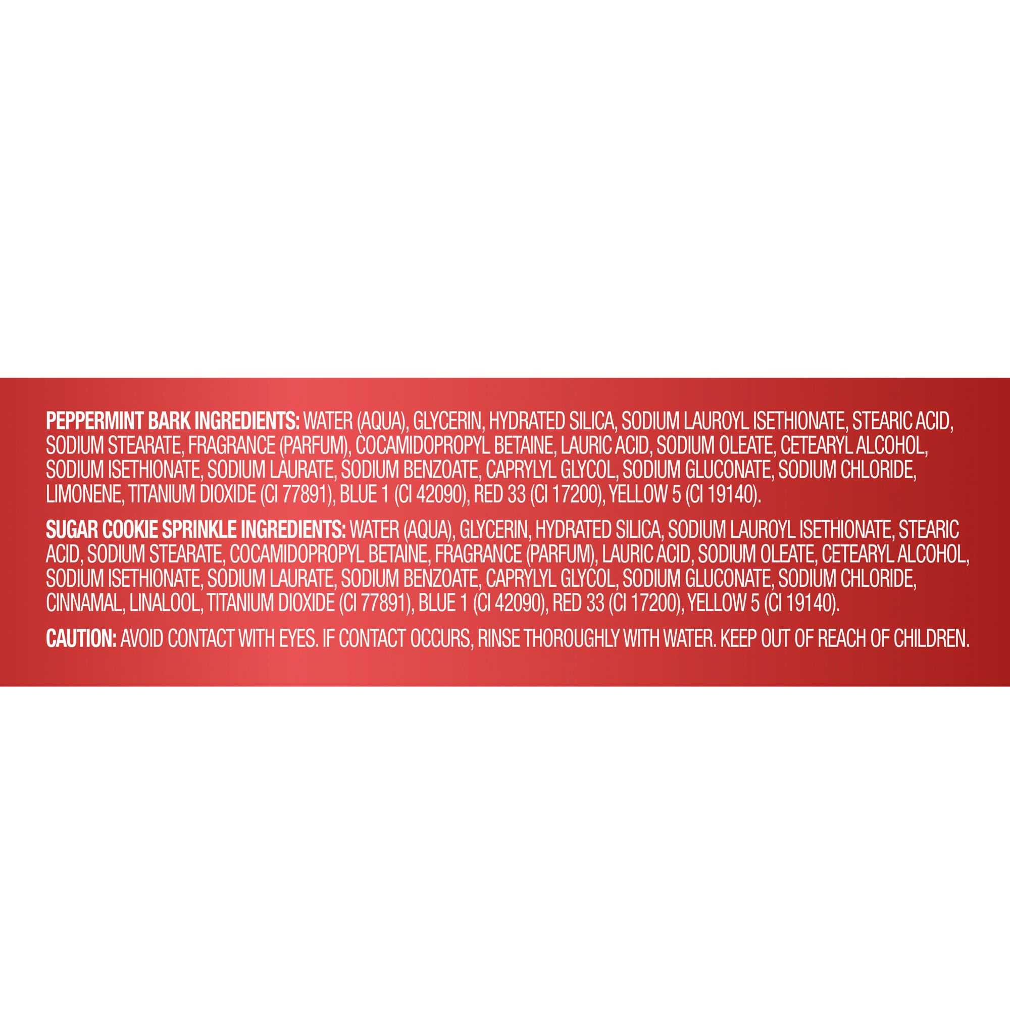 Ingredients: Sugar Cookie Sprinkle: Water (Aqua), Glycerin, Hydrated Silica, Sodium Lauroyl Isethionate, Stearic Acid, Sodium Stearate, Cocamidopropyl Betaine, Fragrance (Parfum), Lauric Acid, Sodium Oleate, Cetearyl Alcohol, Sodium Isethionate, Sodium Laurate, Sodium Benzoate, Caprylyl Glycol, Sodium Gluconate, Sodium Chloride, Cinnamal, Linalool, Titanium Dioxide (CI 77891), Blue 1 (CI 42090), Red 33 (CI 17200), Yellow 5 (CI 19140). Peppermint Bark: Water (Aqua), Glycerin, Hydrated Silica, Sodium Lauroyl Isethionate, Stearic Acid, Sodium Stearate, Fragrance (Parfum), Cocamidopropyl Betaine, Lauric Acid, Sodium Oleate, Cetearyl Alcohol, Sodium Isethionate, Sodium Laurate, Sodium Benzoate, Caprylyl Glycol, Sodium Gluconate, Sodium Chloride, Limonene, Titanium Dioxide (CI 77891), Blue 1 (CI 42090), Red 33 (CI 17200), Yellow 5 (CI 19140).