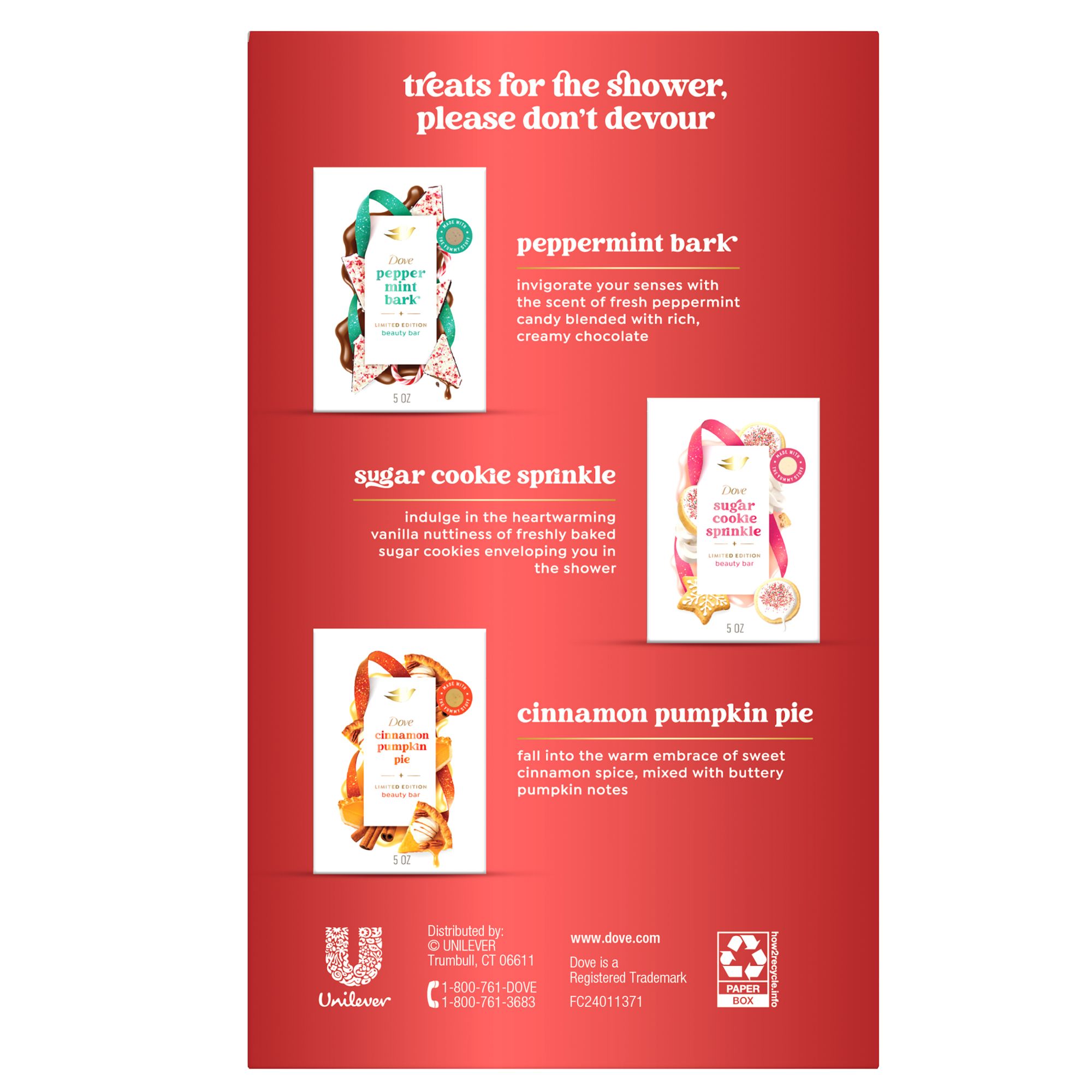 Enjoy the seasonal scents with the Dove Holiday Treats Body Bar Variety Pack - cinnamon pumpkin, freshly baked sugar cookies, and peppermint candy for soft, clean, nourished skin