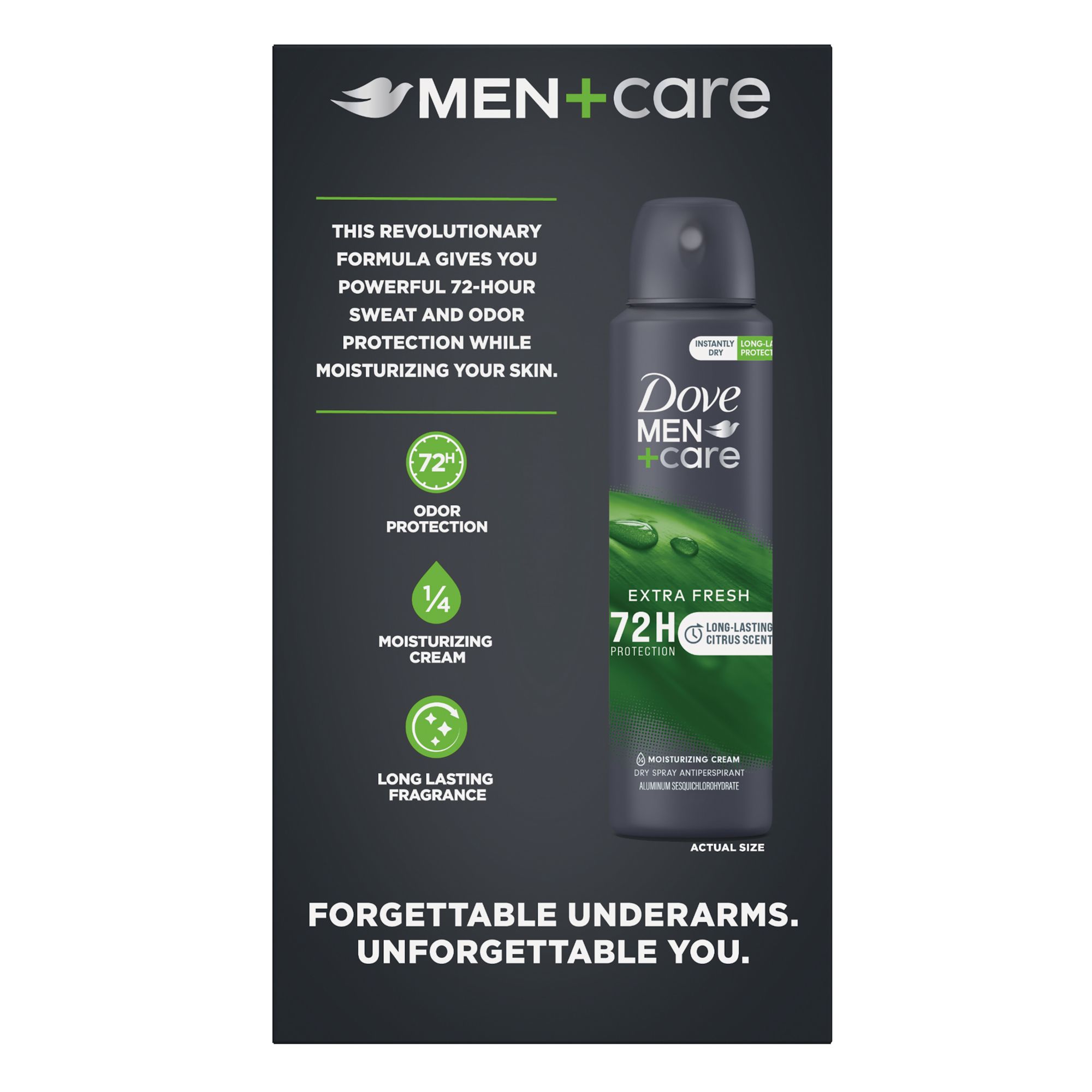 72 Hours of Protection + Care = More Confidence. Looking for a dry spray antiperspirant deodorant for men that delivers you with comfortable underarms? Try Dove Men’s Extra Fresh Dry Spray antiperspirant deodorant with new revolutionary Triple Defense Technology that offers powerful 72h odor and wetness protection, long lasting scent, and 1/4 moisturizing cream to give you comfortable underarms. Enjoy the fresh, reinvigorating, and long-lasting citrus scent of Bergamot, Lavender, and Sandalwood in our Extra Fresh Dry Spray antiperspirant deodorant. Dove Men Dry Spray antiperspirant for men is formulated with 1/4 Moisturizing Cream to help retain skin moisture and help protect against irritation for comfortable underarms. Dove Men Dry Spray’s unique formula goes onto skin instantly dry, for a comfortable feel. Each Dove Men+Care antiperspirant spray comes in a can that's made with infinitely recyclable aluminum. Dove Men+Care antiperspirants are PETA-certified Cruelty Free.