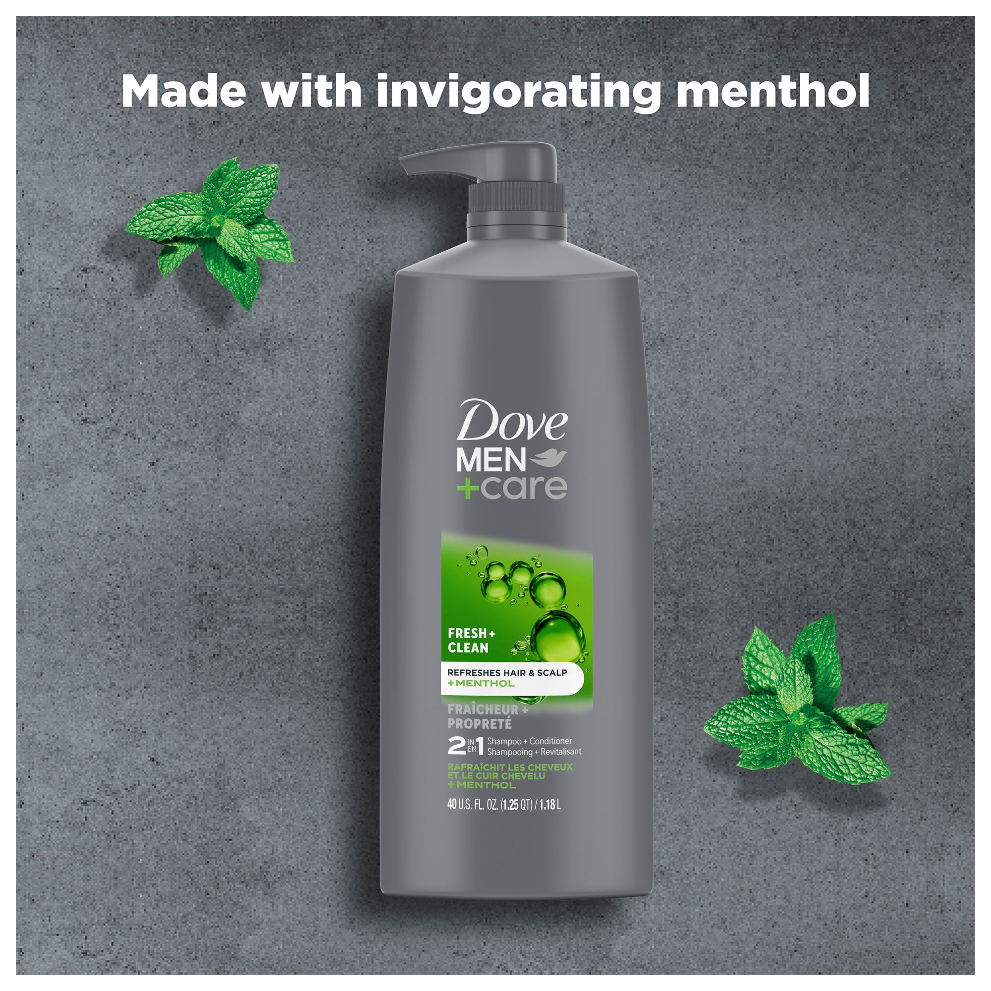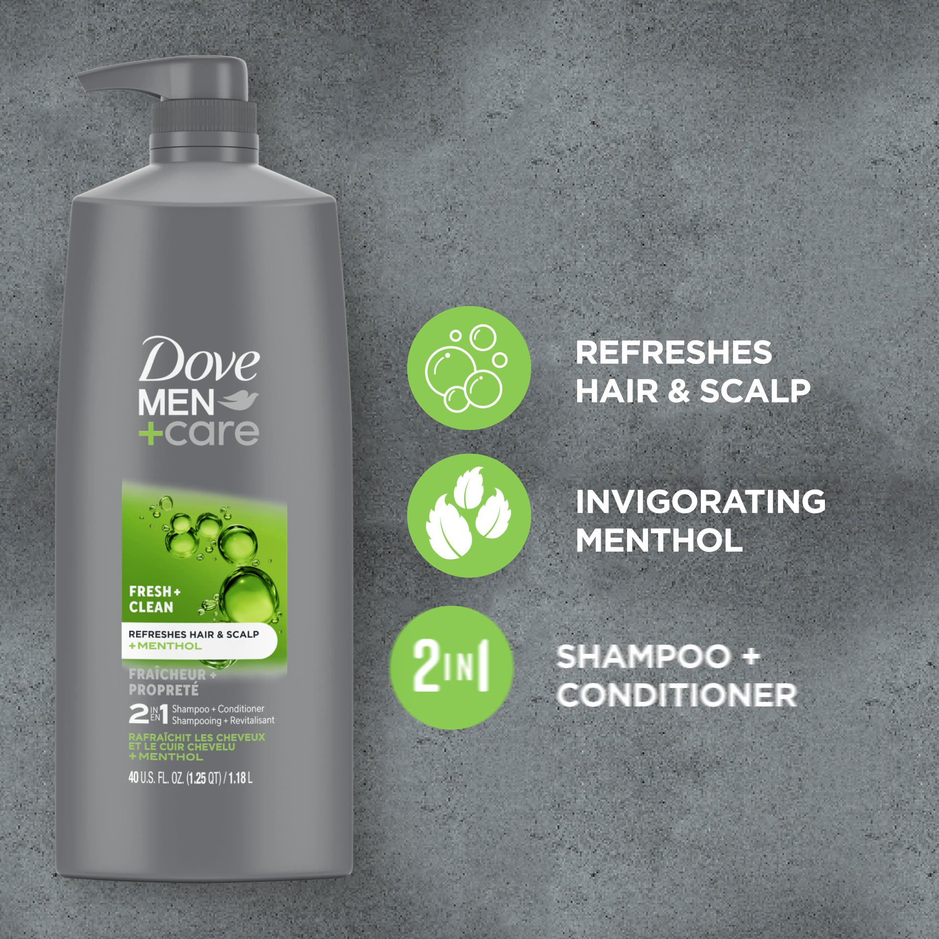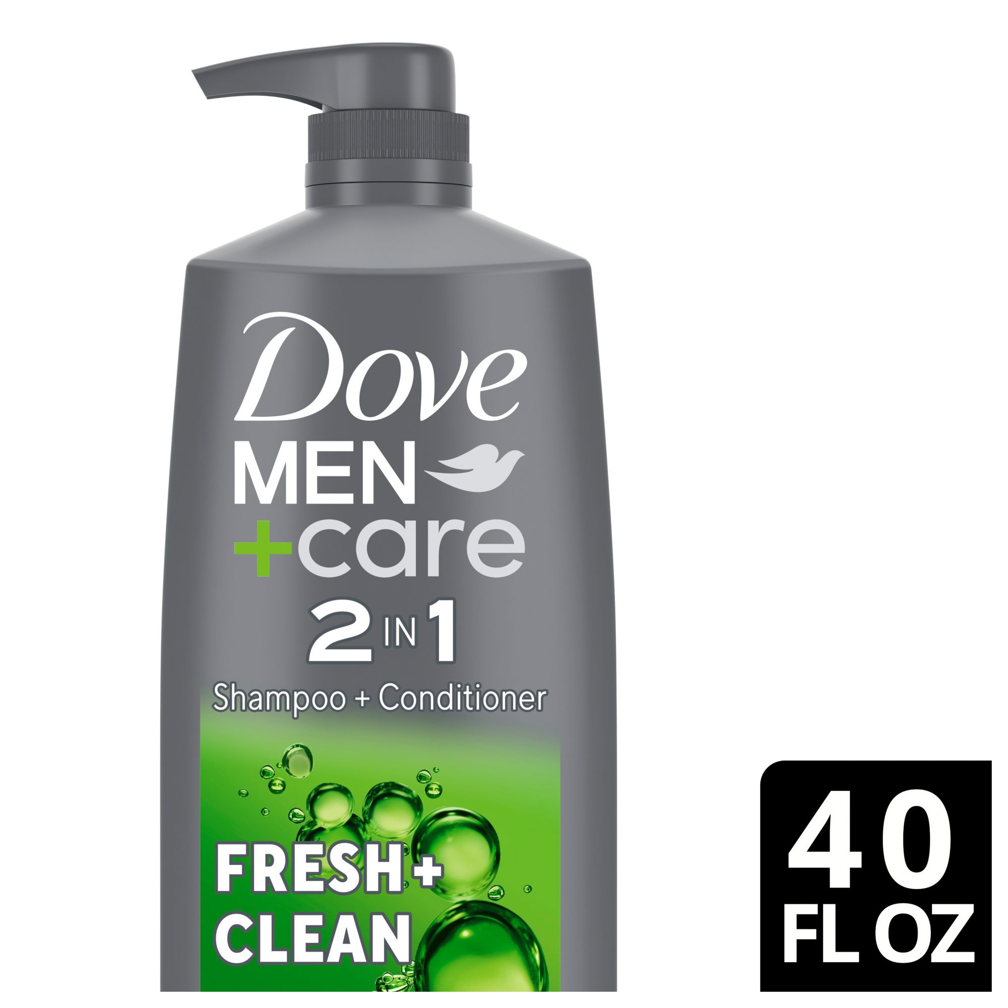 Clarifying men's shampoo and conditioner 2-in-1: Dove Men+Care 2-in-1 Fresh and Clean functions both as a shampoo and conditioner, simultaneously cleaning and conditioning hair in one step