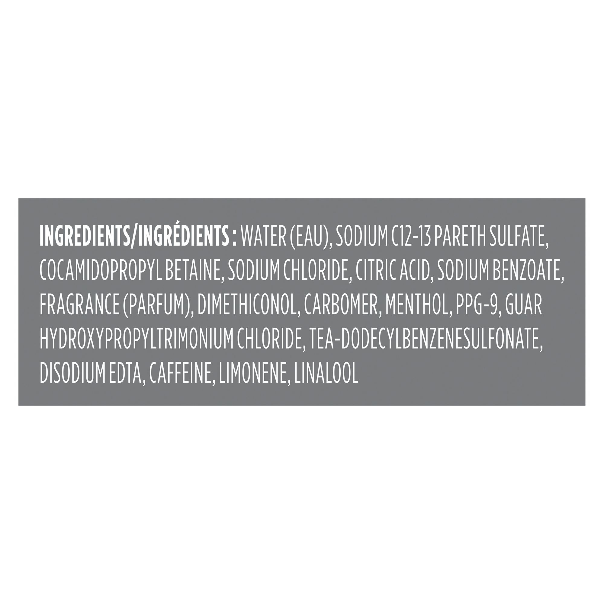 Ingredients: Water (Aqua), Sodium C12-13 Pareth Sulfate, Cocamidopropyl Betaine, Sodium Chloride, Citric Acid, Sodium Benzoate, Fragrance (Parfum), Dimethiconol, Carbomer, Menthol, PPG-9, Guar Hydroxypropyltrimonium Chloride, TEA-Dodecylbenzenesulfonate, Disodium EDTA, Caffeine, Limonene, Linalool.