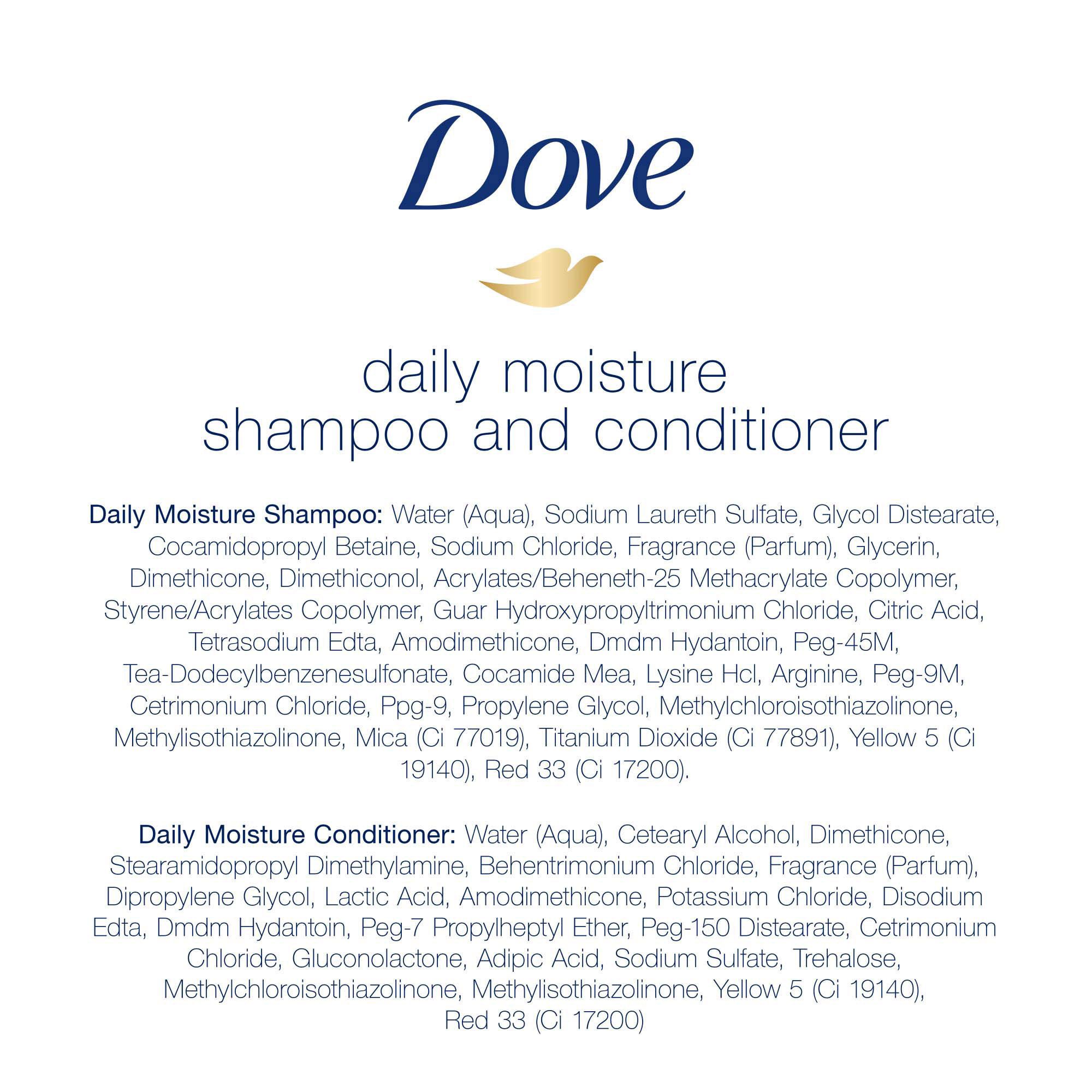 Daily moisture shampoo and conditioner for dry hair or damaged hair: this Dove moisturizing system makes hair 10x more resilient to daily hair damage from brushing vs. Non-conditioning shampoo Pro-moisture complex shampoo and conditioner system: formulated with pro-moisture complex, this hydrating shampoo and conditioner system immediately smooths hair Two-way nutritive solutions daily moisture shampoo and conditioner care: two-way care, this nourishing system continues to nourish your dry hair every time you use it Everyday cleansing, moisturizing, and haircare: this Dove daily moisture shampoo and conditioner system is suitable for everyday haircare and gives you moisturized, manageable and silky hair Lightweight hair products: Dove nutritive solutions daily moisture shampoo and conditioner system leaves your hair feeling silky soft – without weighing it down Dove daily moisture collection: with every wash, this moisturizing shampoo and moisturizing conditioner system helps detangle hair and improve manageability, leaving you with more healthy hair Includes Dove daily moisture shampoo and conditioner