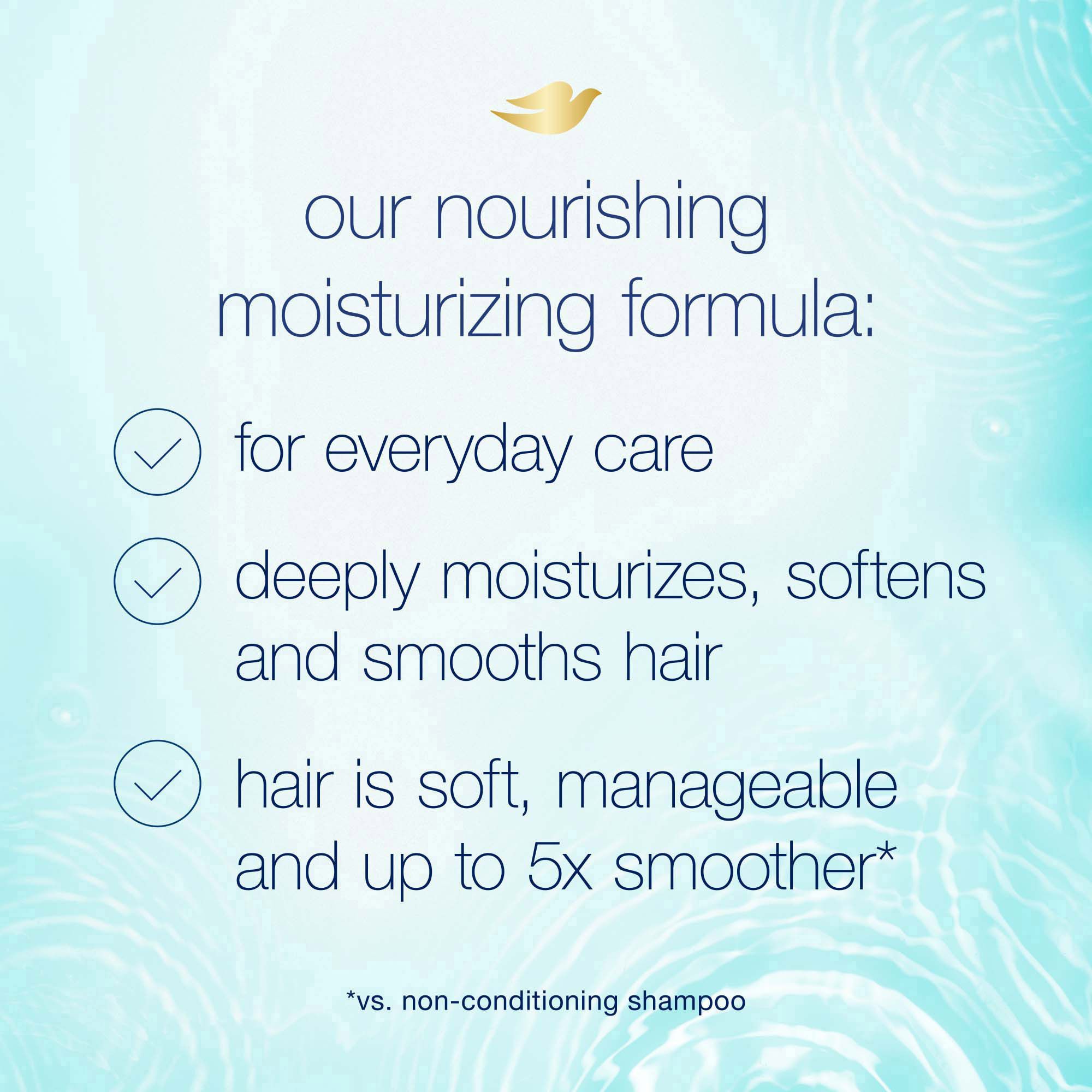 Instructions to use: Apply Dove Nutritive Solutions Daily Moisture Shampoo to wet hair, lather, and rinse. For softer hair that feels smoother, follow with Dove Nutritive Solutions Daily Moisture Conditioner. Apply Dove Nutritive Solutions Daily Moisture Conditioner to wet hair after shampooing, concentrating on the mid-lengths and ends, and then rinse. Suitable for everyday use.