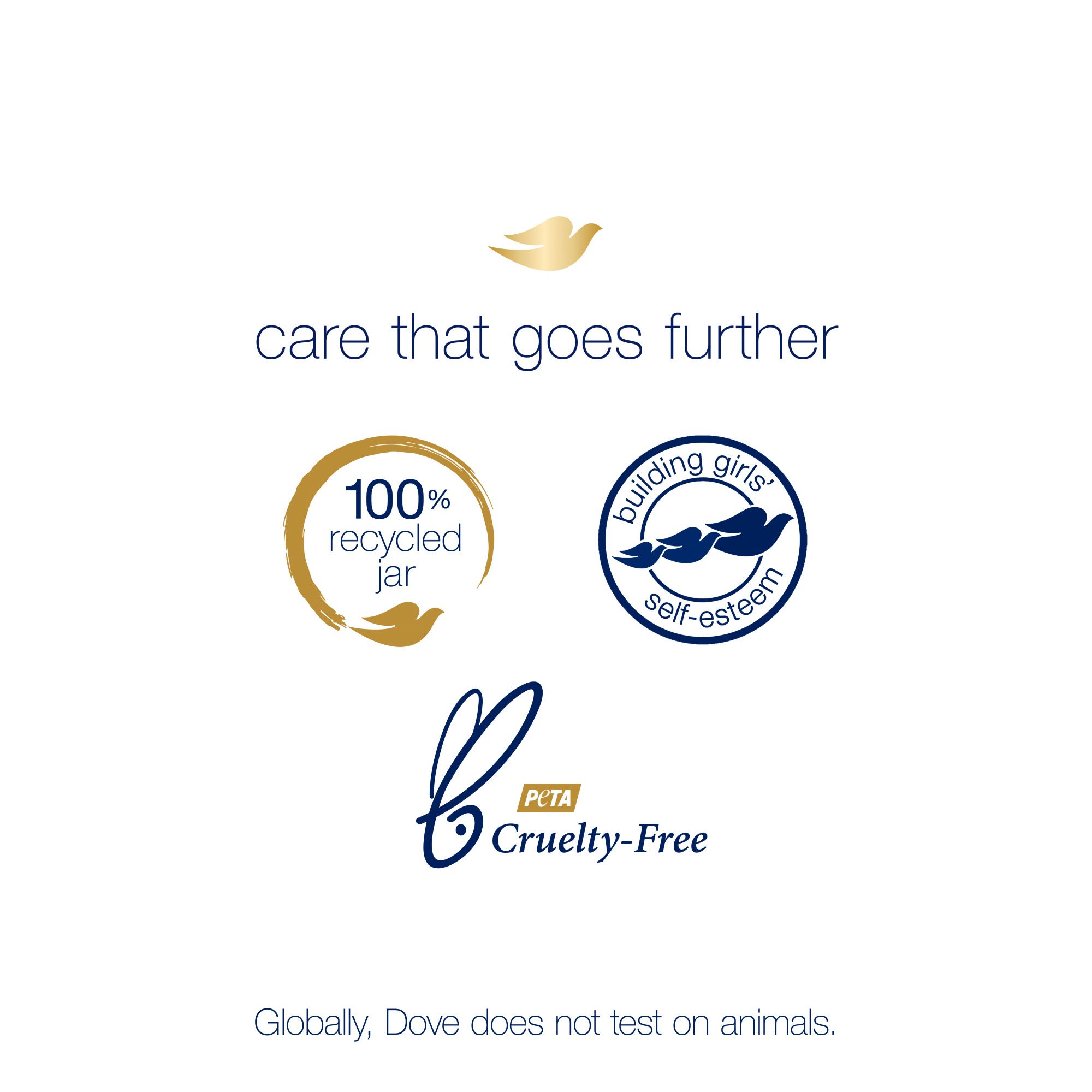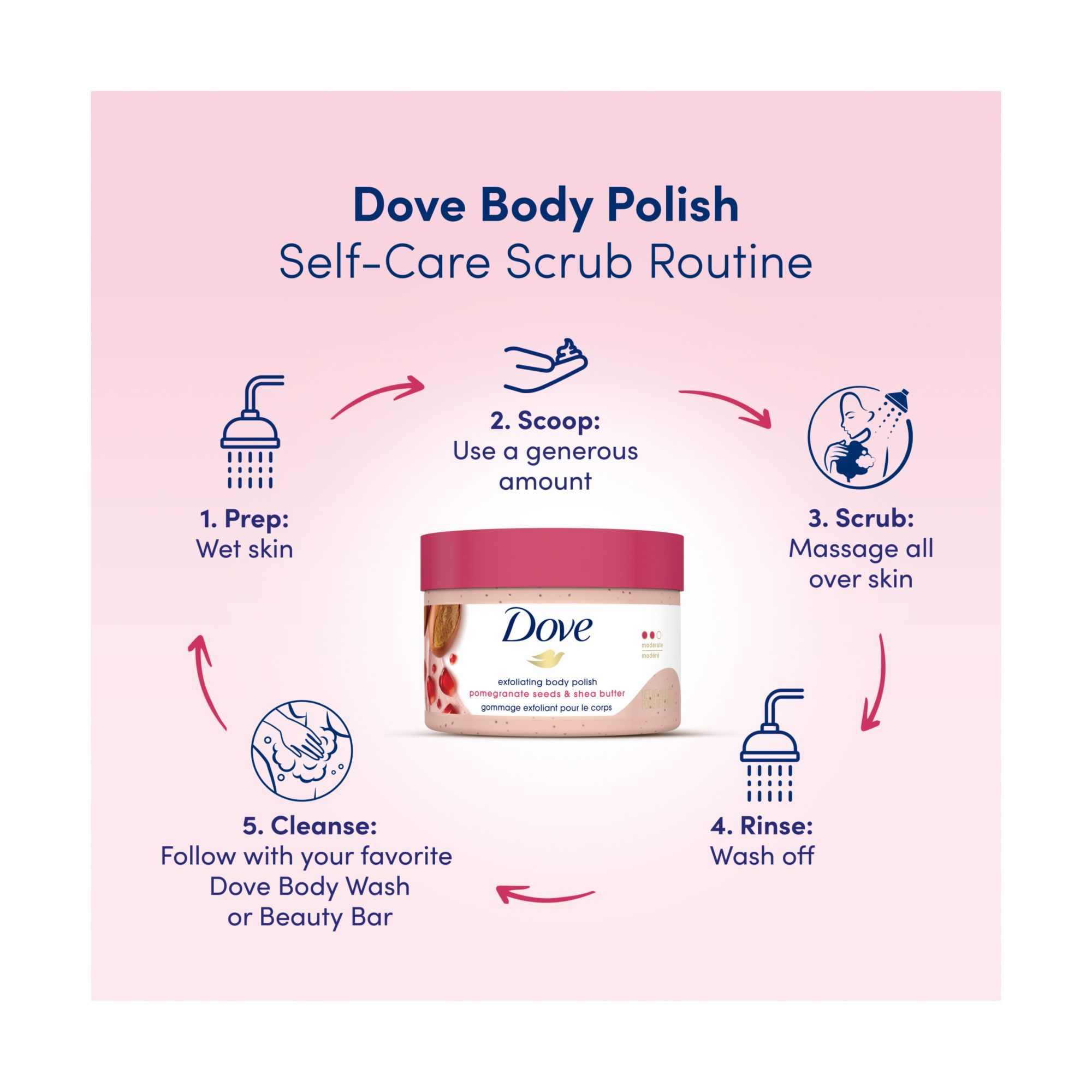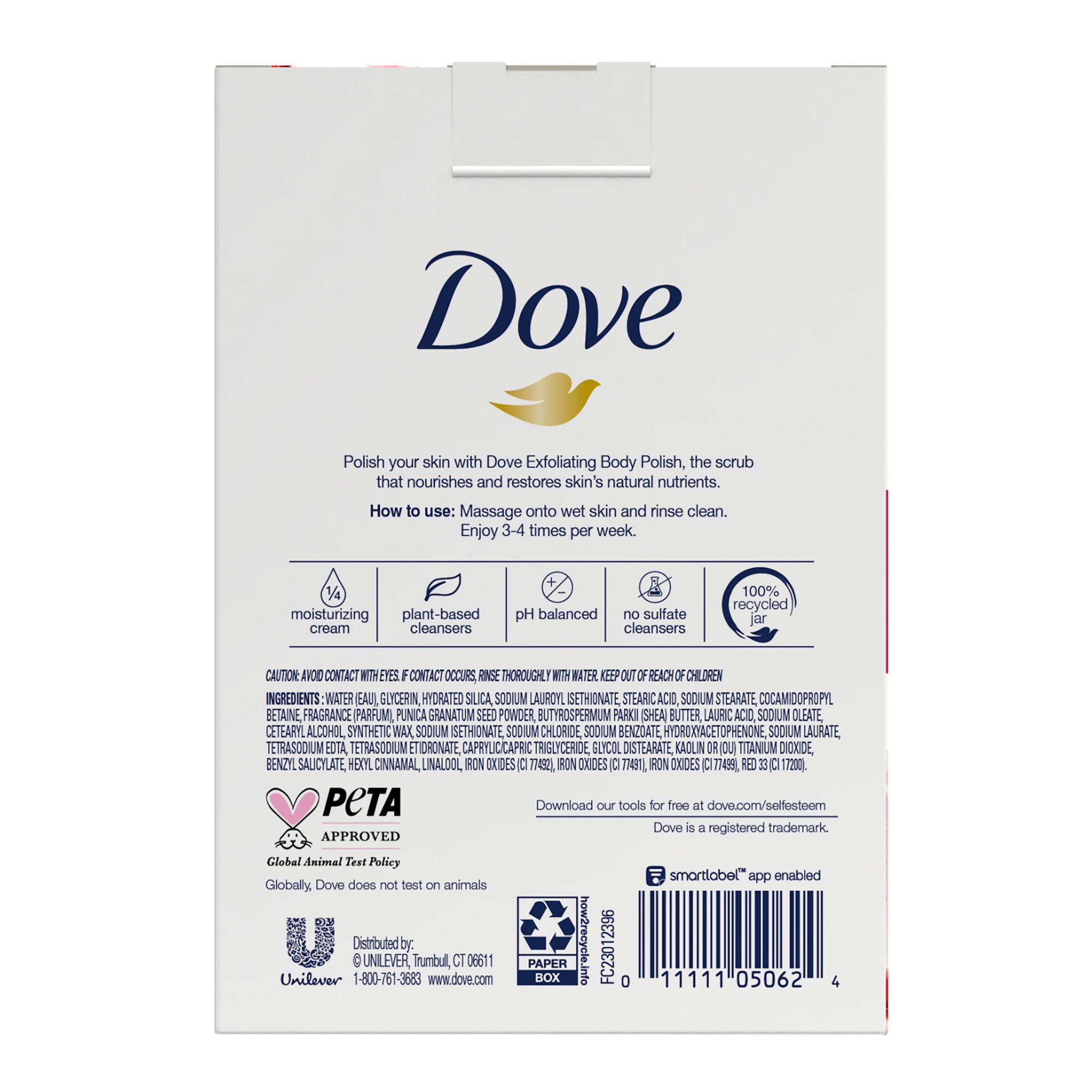 There's one essential step for achieving smooth skin that shouldn’t be overlooked: exfoliation. So, gently buff away dry, dull skin while caring for your skin with Dove Pomegranate Seeds & Shea Butter Exfoliating Body Polish. Made with 1/4 moisturizing cream, this exfoliating body scrub restores skin’s nutrients as it exfoliates, leaving your skin feeling silky smooth. With a smooth, easily spreadable texture, this Dove body exfoliator gives you beautifully creamy coverage while releasing the sweet scent of pomegranate. Get all the effectiveness you’d look for in exfoliators or a shower scrub, but with the nourishment and care that your skin needs in the shower. Try Dove Body Polish to get beach-ready skin, prep skin for tanning, or to help exfoliate before shaving to help prevent ingrown hairs. You'll love the feeling of silky smooth skin all over. To use, scoop a generous amount of Dove Pomegranate Seed & Shea Butter Exfoliating Body Scrub out of the jar. Massage all over your body in circular motions for creamy coverage, and then rinse away to reveal silky smooth skin. Use 3-4 times per week as part of your skin care regimen, followed by Dove Body Wash or Beauty Bar for touchably soft skin. When you buy Dove, you can be assured you’re caring for your skin with products that are PETA Cruelty-Free certified. Company-wide, Dove is on a mission to help the next generation of women develop a positive relationship with the way they look - reaching over 1/4 of a billion young people with self-esteem education by 2030. Dove is also committed to substantially reducing plastic waste by 2025. This includes reducing their use of virgin plastic by 20,500 metric tons annually, launching new 100% recycled plastic bottles and trialing new refillable formats for certain select products.